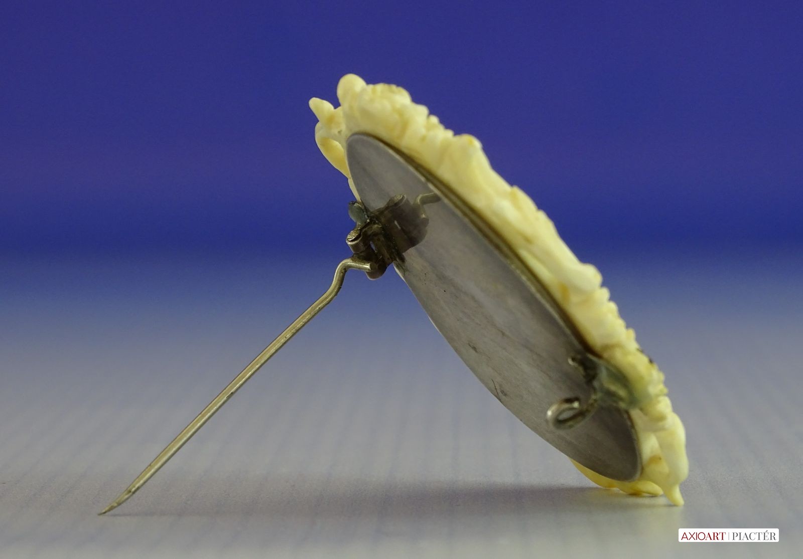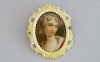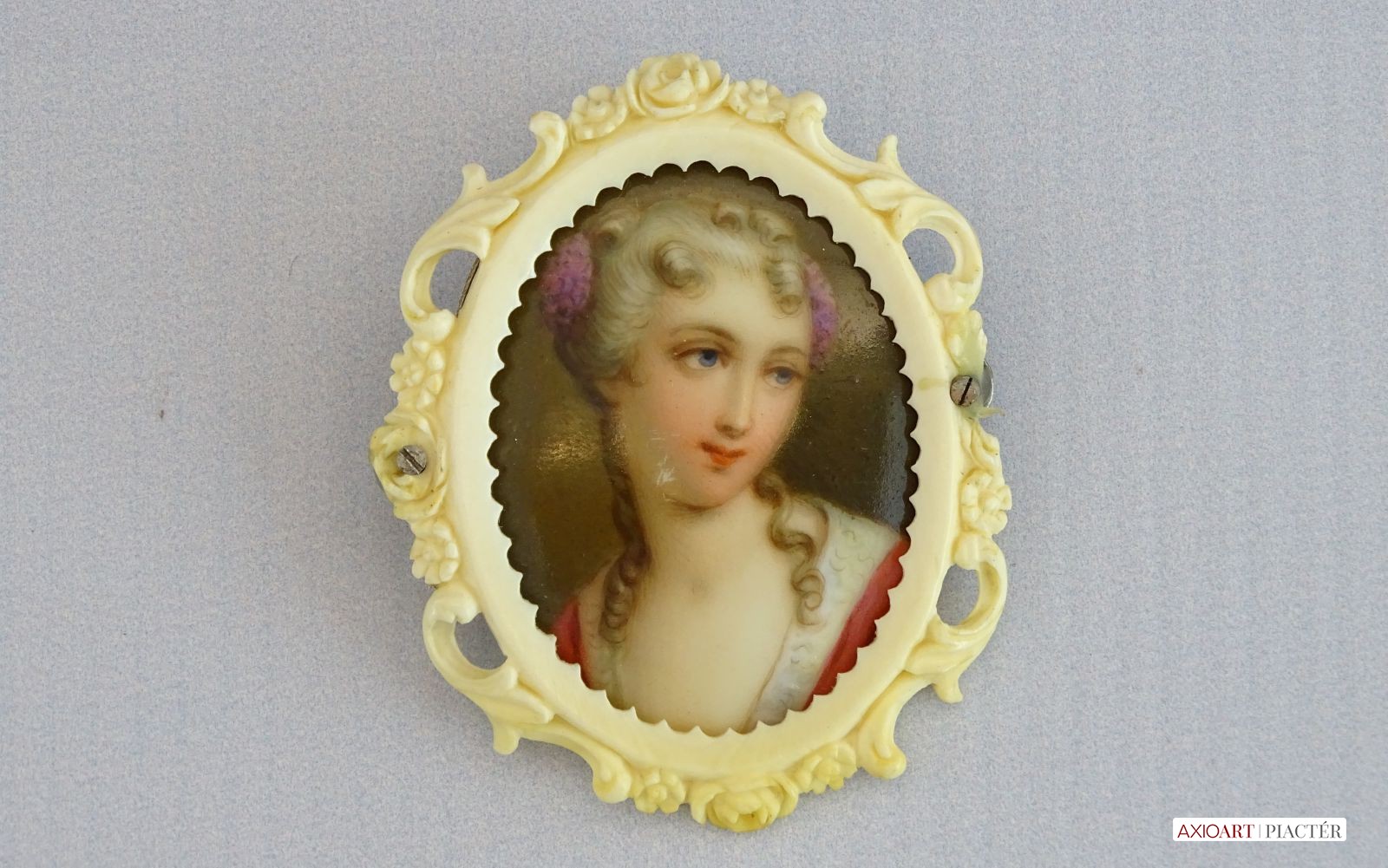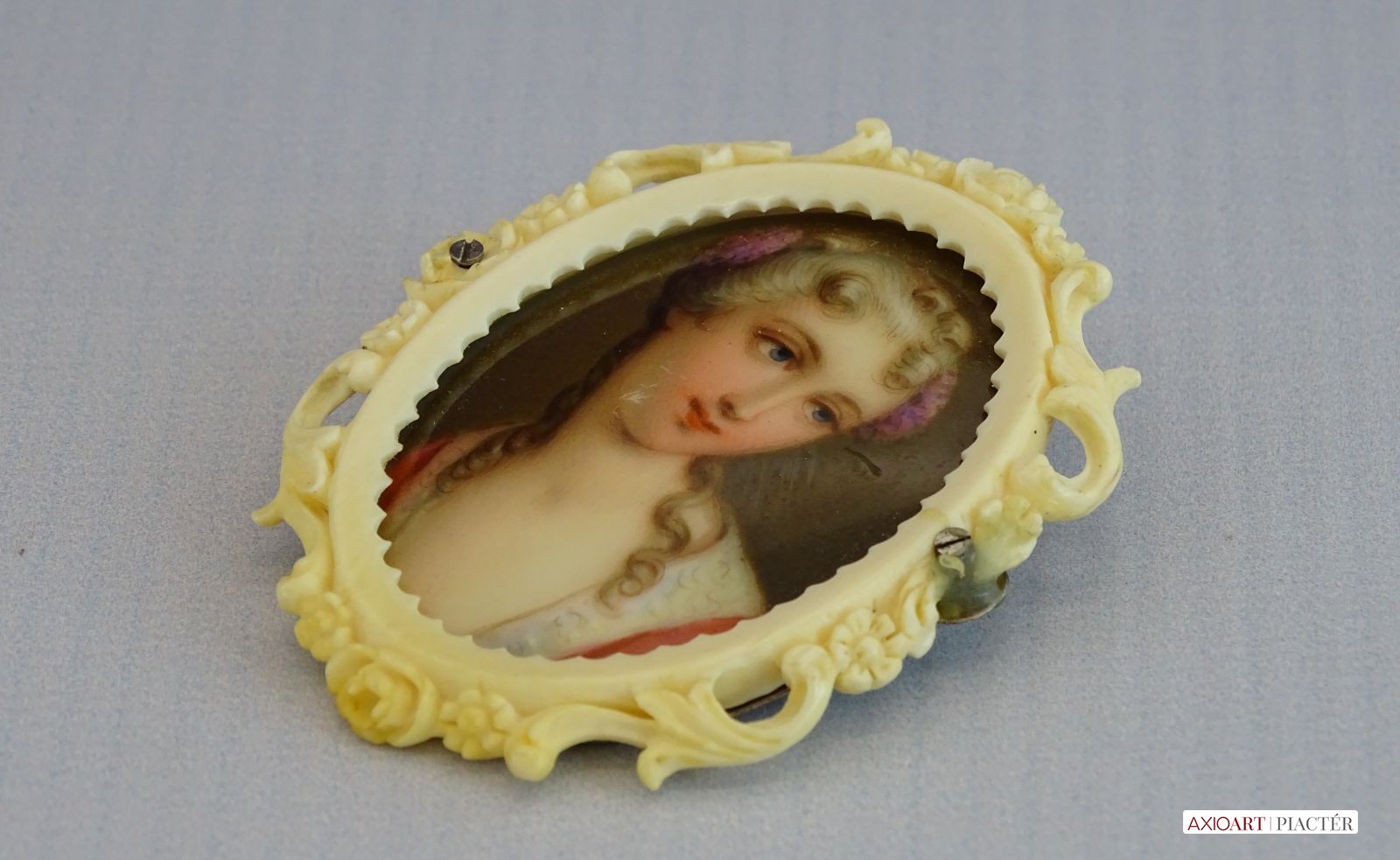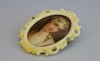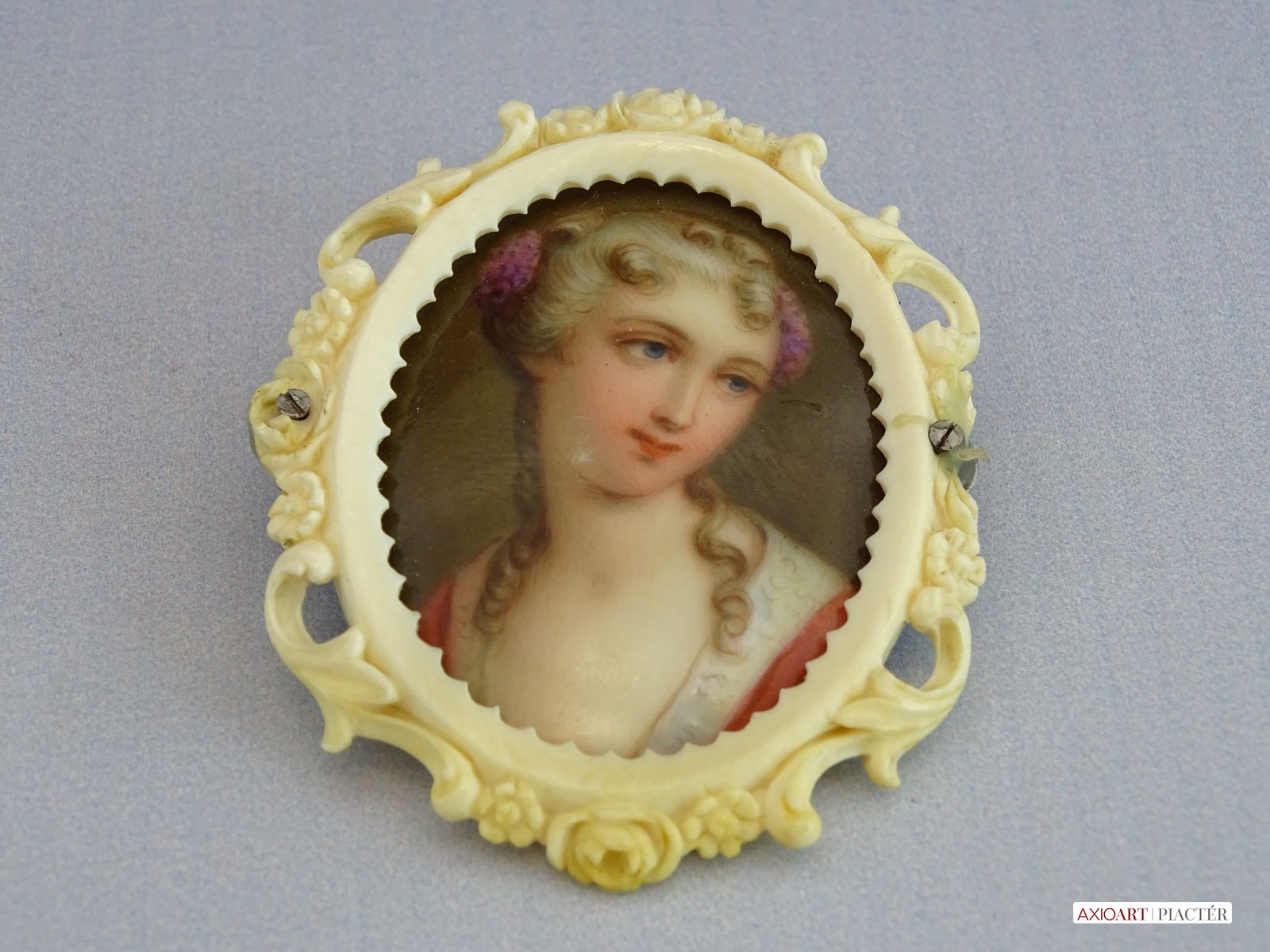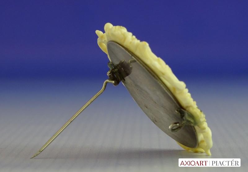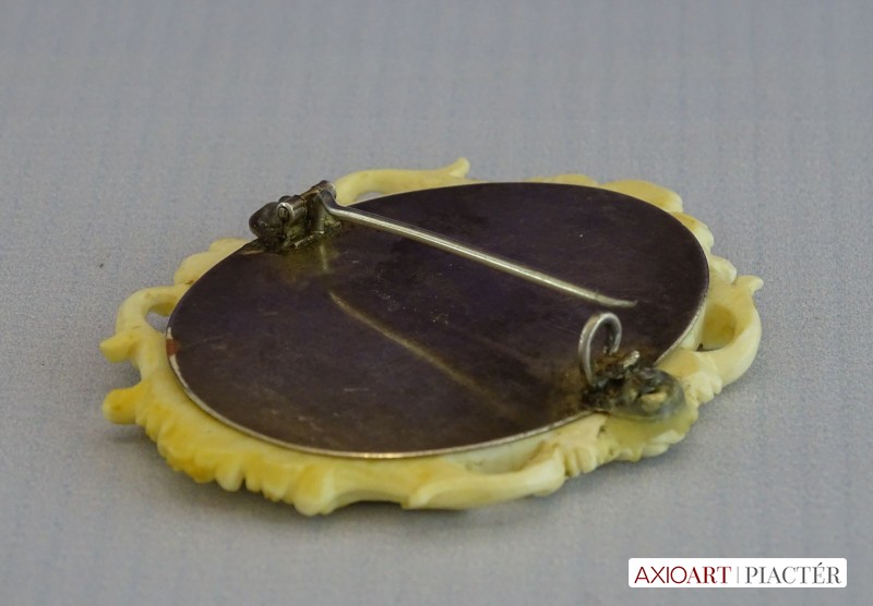 Antik, faragott csont keretben található, kézzel festett porcelán bross, női portré. A bross hátlapja ezüst. A jobb oldali rögzítő csavarnál kisebb sérülés található, lásd fotó.