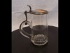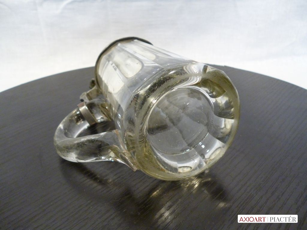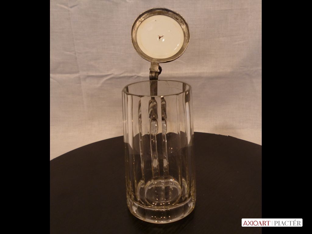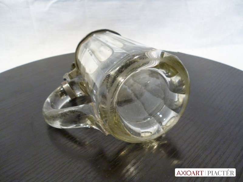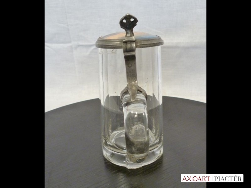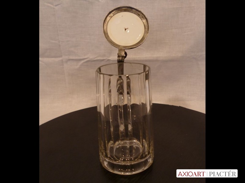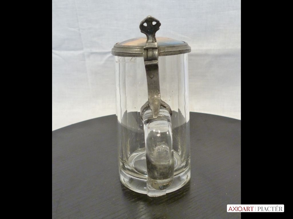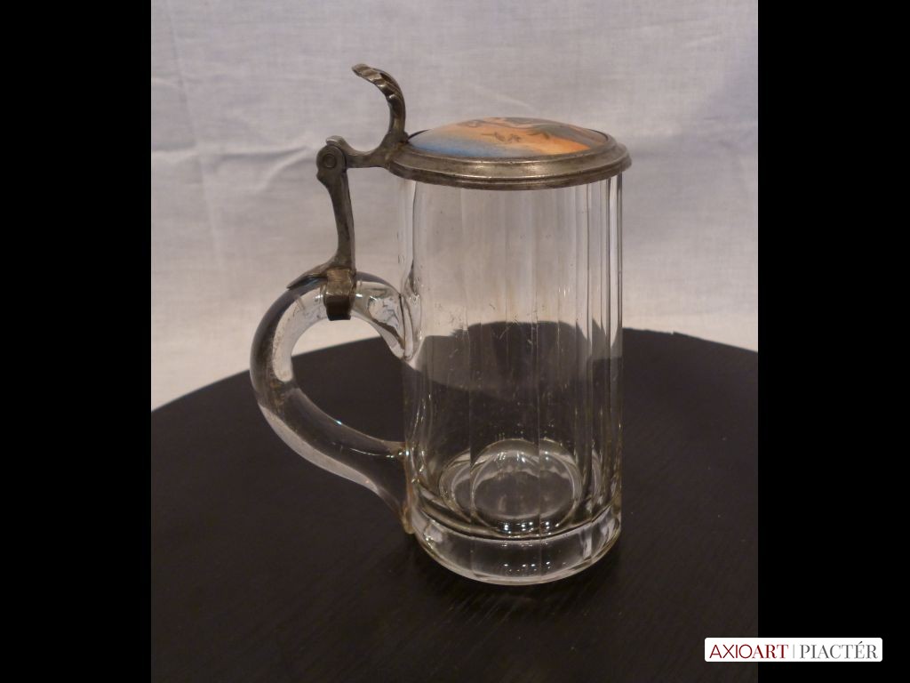 [1877/VTR-4] Hibátlan állapotú, méretezett 0,3 dl-es üveg kupa, antik ón porcelán betétes fedéllel. A porcelán betéten egy festett vadászkutya, vizsla látható. 12 szögre csiszolt pohár, 1860-90 közötti. Gyűjteménybe való, szép darab. Valószínűsíthetően osztrák vagy német korsó. Magasság: 13.5 cm Szélesség: 11.5 cm