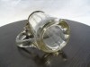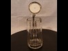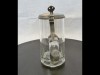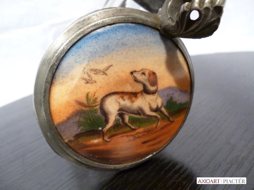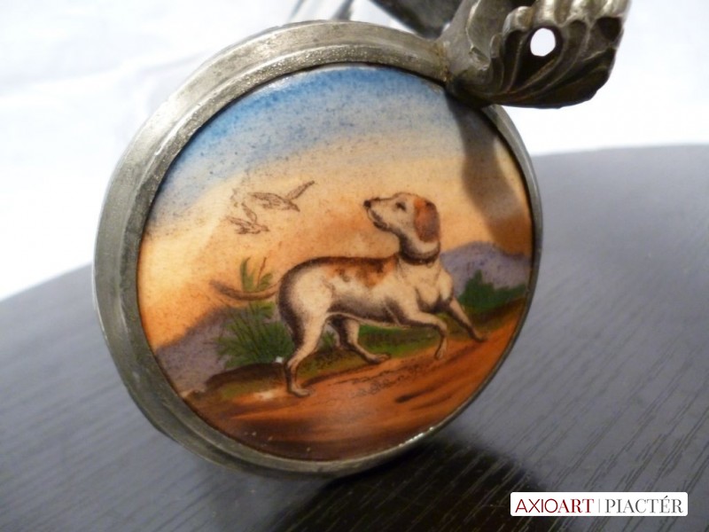Hibátlan állapotú, méretezett 0,3 dl-es üveg kupa, antik ón porcelán betétes fedéllel. A porcelán betéten egy festett vadászkutya, vizsla látható.