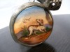 Antik porcelán betétes vadász kutyás ón fedeles üvegkupa