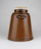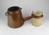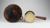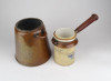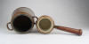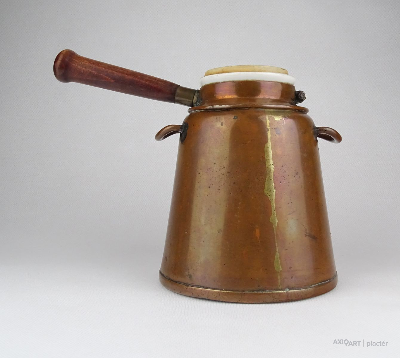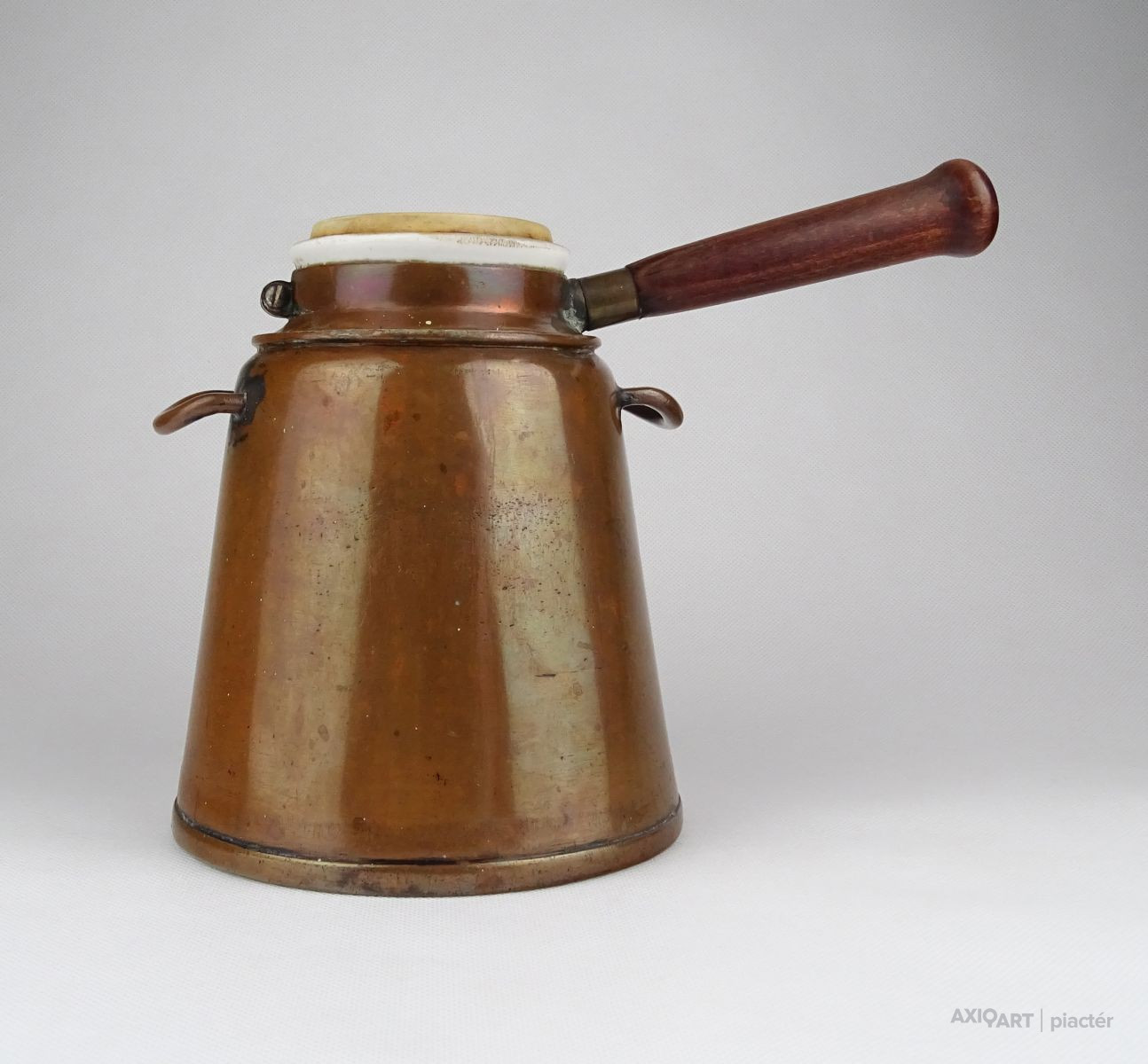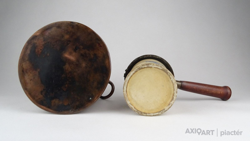 Antik, kétrészes vörösréz edény. Fa nyeles, porcelán merülőedény kétfüles vörösréz forraló edényben.