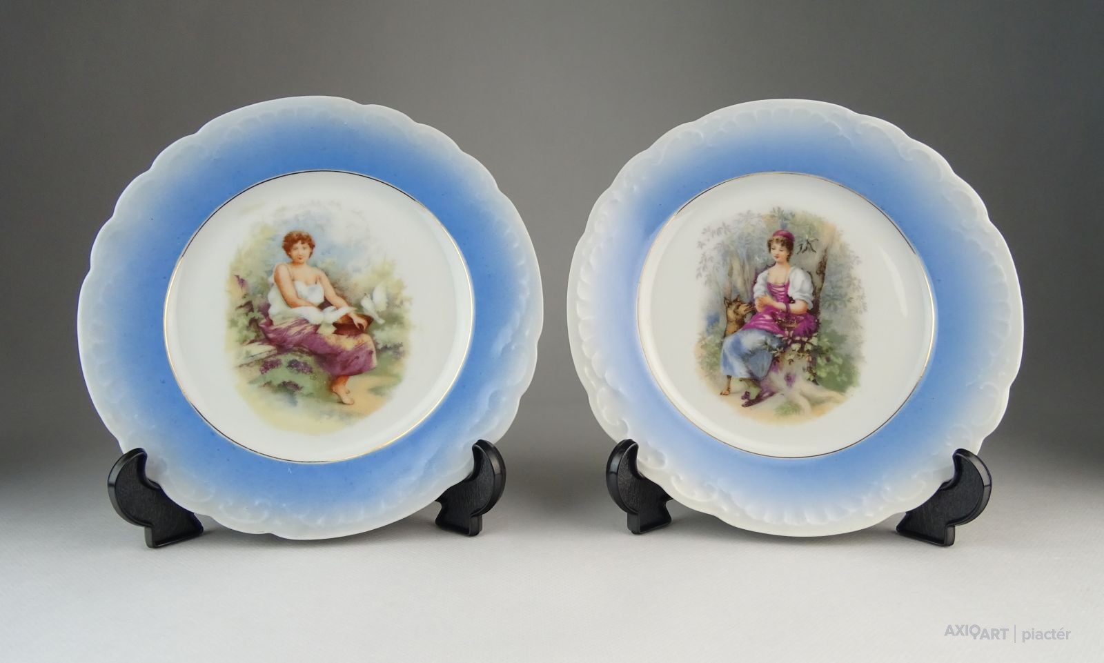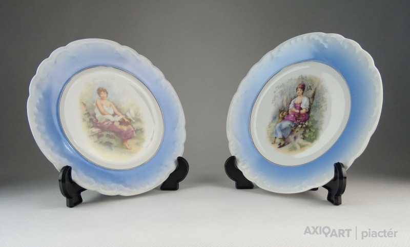 Hibátlan állapotú, kék szegélyes, női alak díszes, jelzetlen porcelán dísztányér pár.