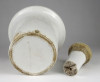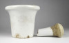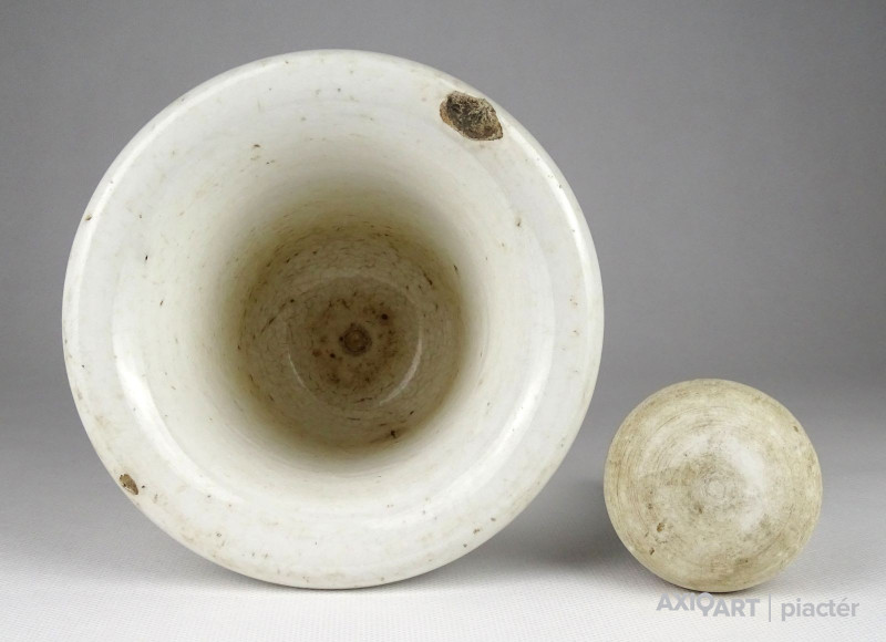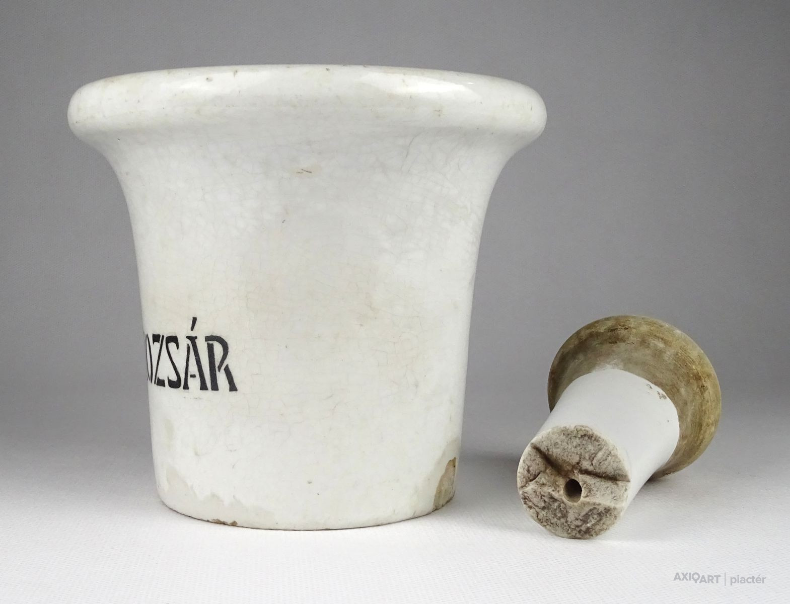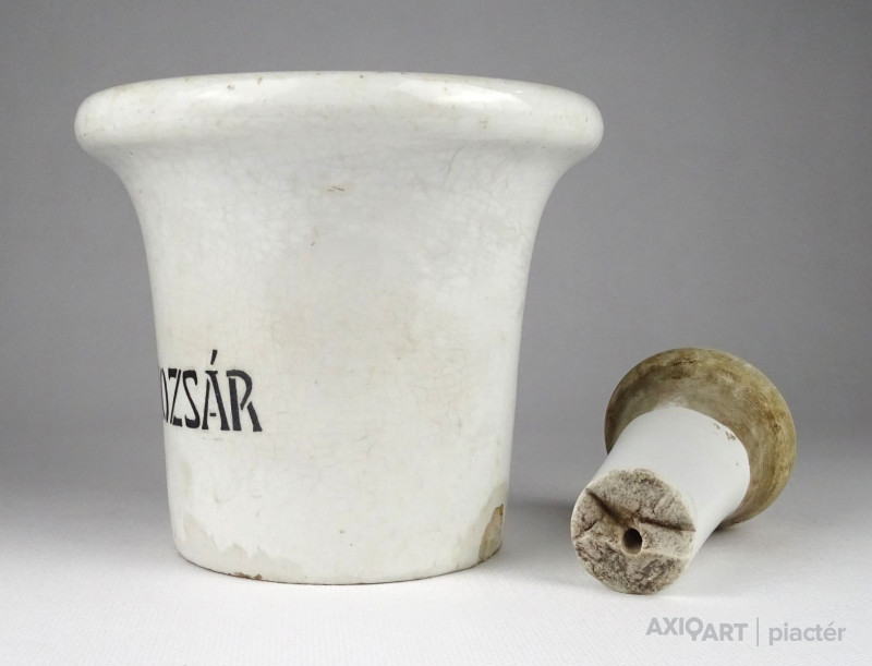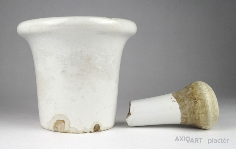Régi vastag falú fajansz mozsár. A mozsár felületén több lepattanás található. A törő sérült.