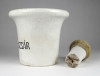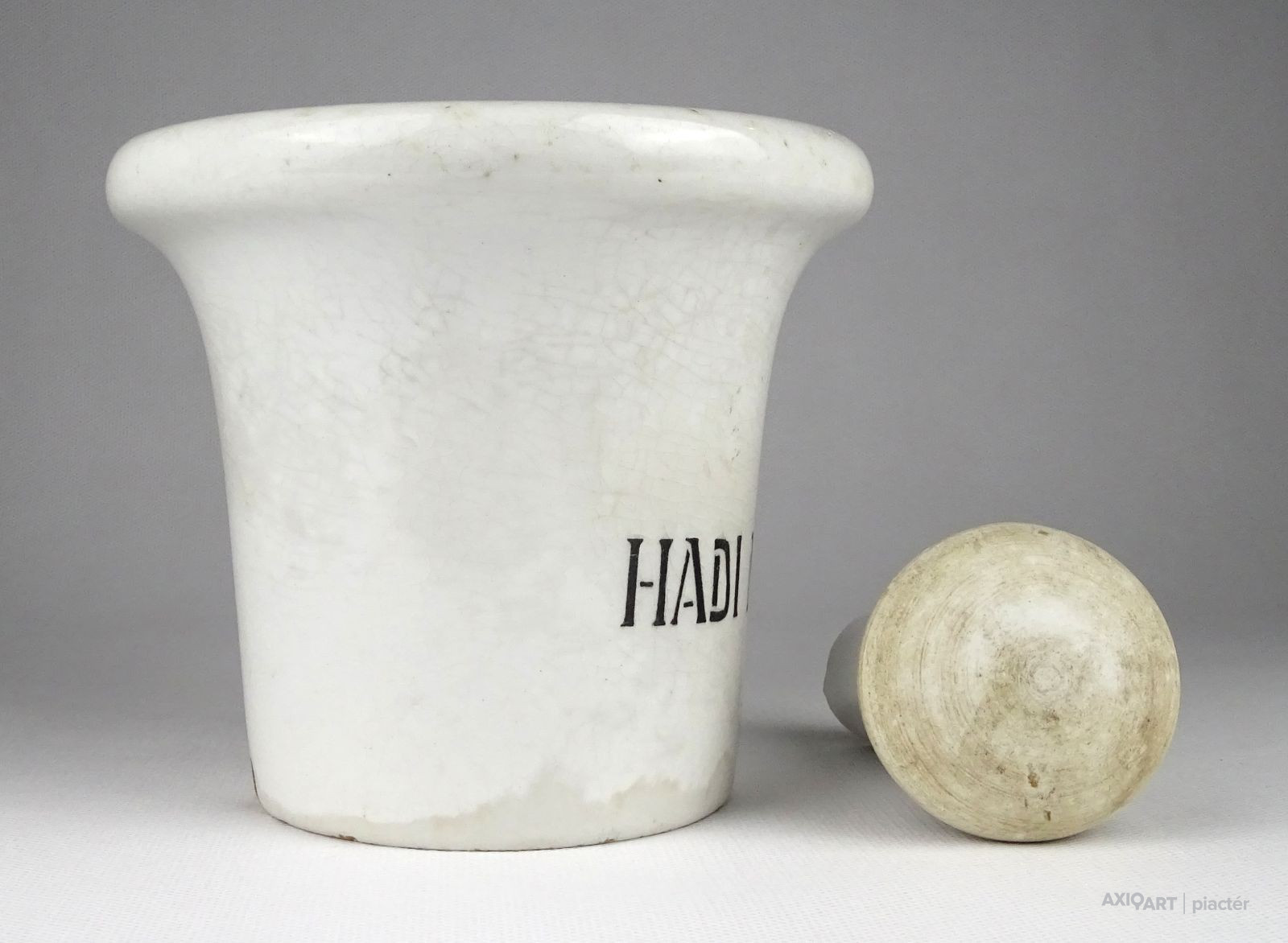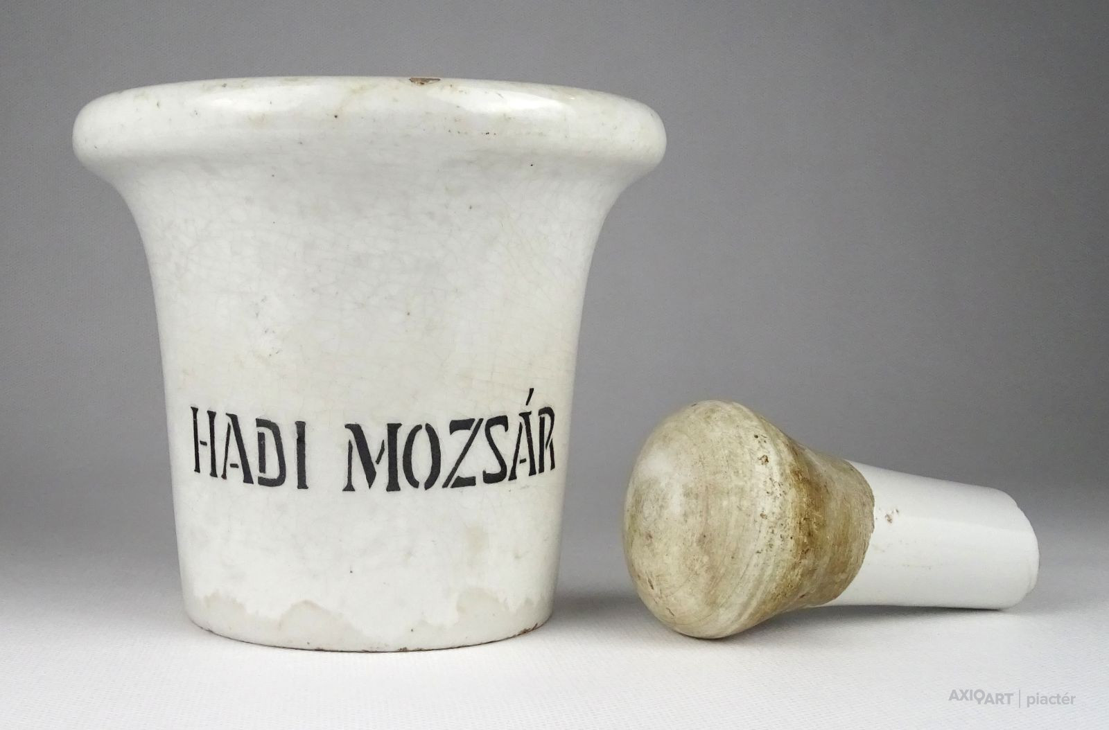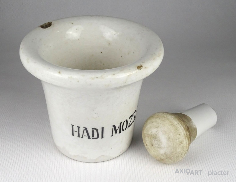 [1K848/UZ-N] Régi vastag falú fajansz mozsár. A mozsár felületén több lepattanás található. A törő sérült. Oldalán felirat: HADI MOZSÁR Alján nyomott jelzés: Z Magasság: 12.7 cm Szélesség: 14.8 cm Súly: 1.45 kg   A test magassága 12 cm, szájánál 14,5 cm az átmérője. A törő hossza 23,5 cm.