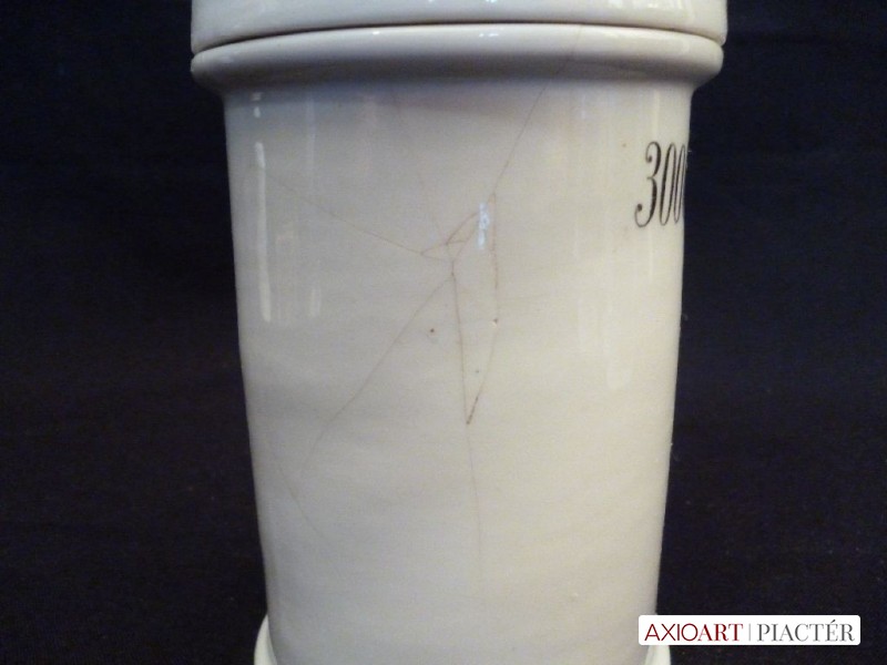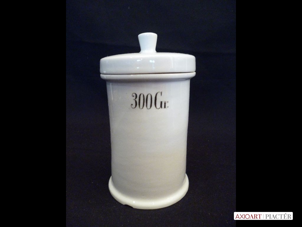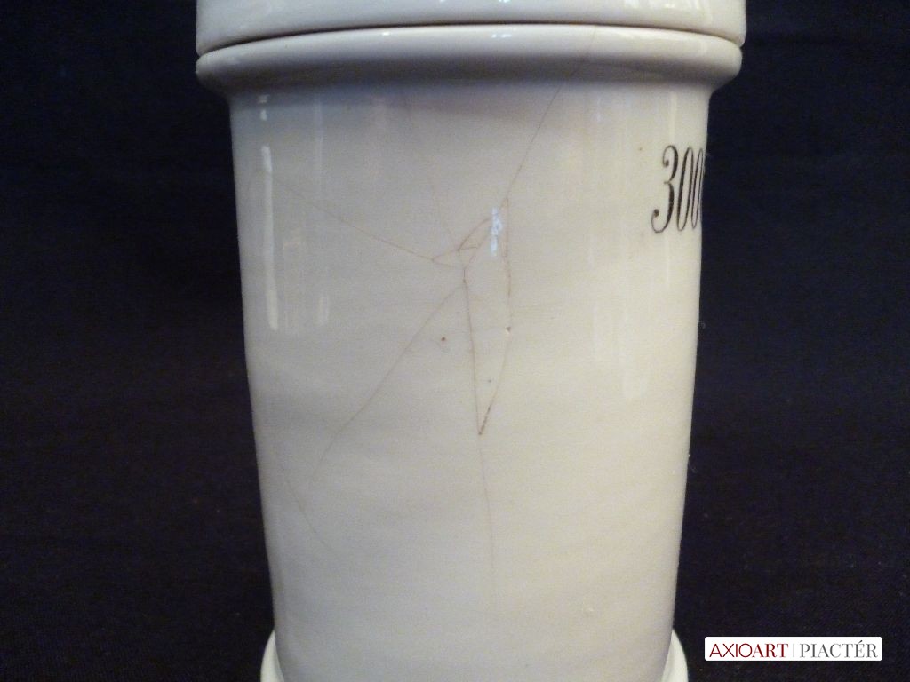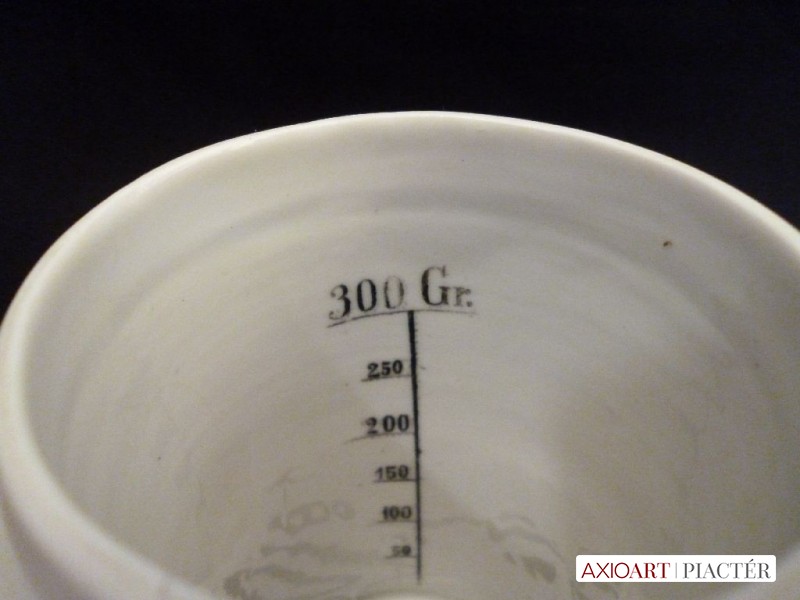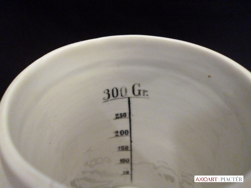 [X970/UZ-N] Antik porcelán gyógyszertári patika edény. Oldalán felirat: 300Gr. Belső oldalán: 0-300 gr-ig skálázás A tégely talpánál egy lepattanás található, oldalán csillag szerű hajszálrepedés háló, valószínűleg beütődött valahová. Magasság: 14.5 cm Szélesség: 8.5 cm   Magassága 14,5 cm. Átmérője 8,5 cm.