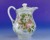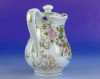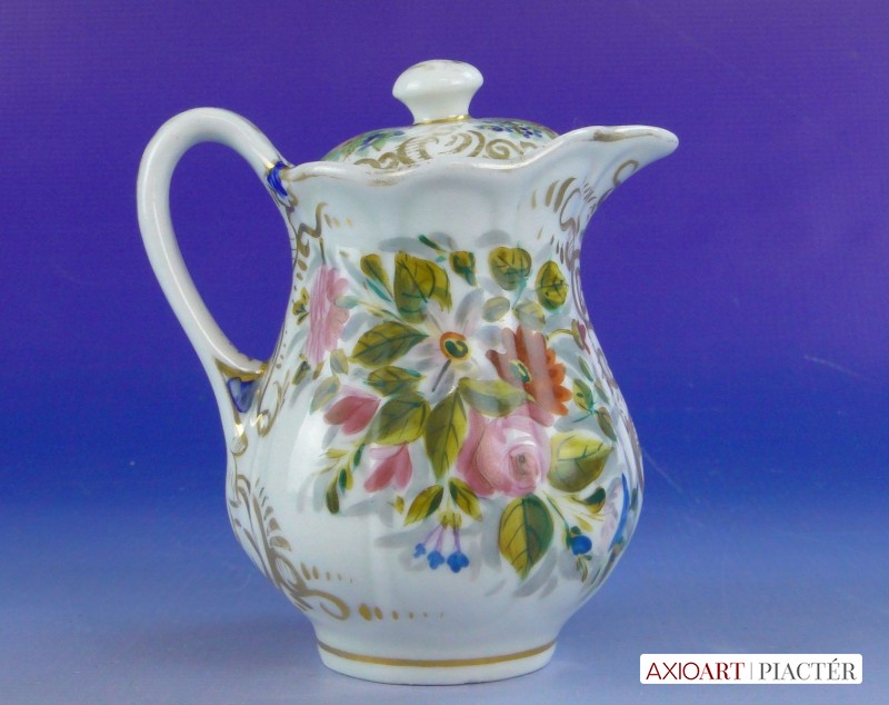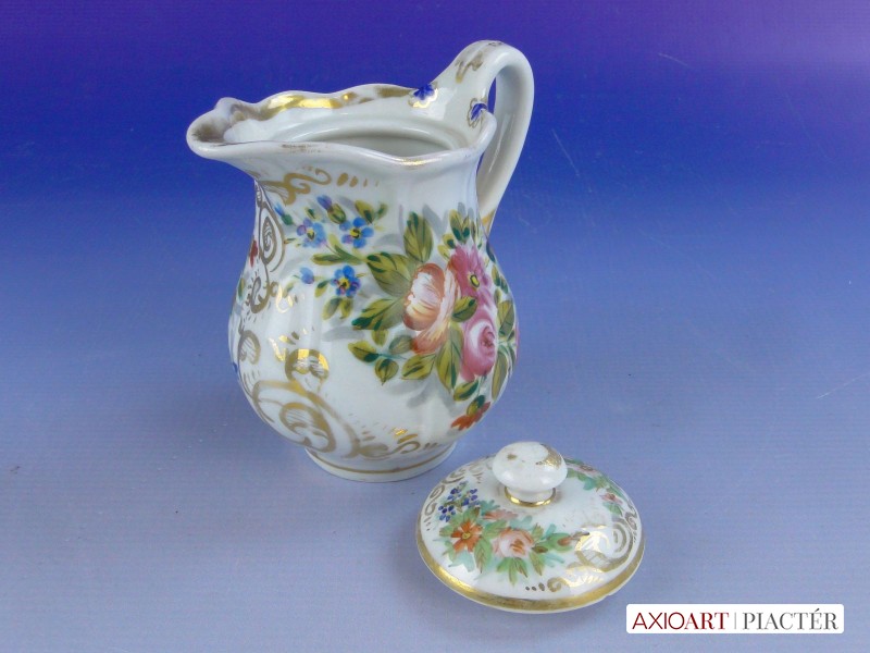 Antik, 1850-1880 körüli Meisseni jellegű, gazdagon díszített barokkos formájú, vastagon aranyozott, kézi festéssel díszített, porcelán kiöntő.
