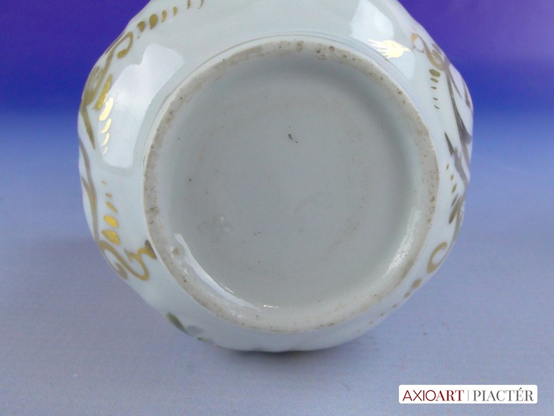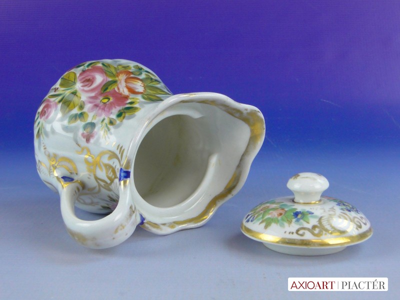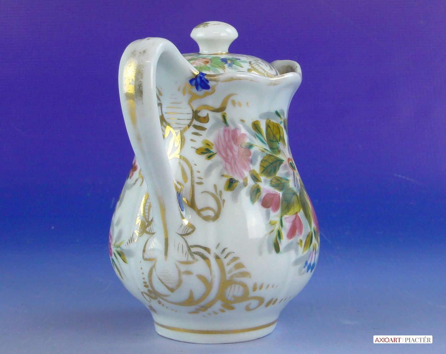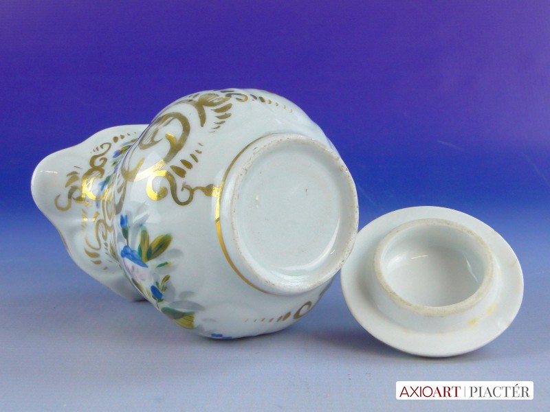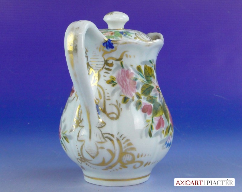 [0F523/UZ-K] Antik, 1850-1880 körüli Meisseni jellegű, gazdagon díszített barokkos formájú, vastagon aranyozott, kézi festéssel díszített, porcelán kiöntő. Magasság: 12 cm Szélesség: 8 cm Súly: 0.255 kg