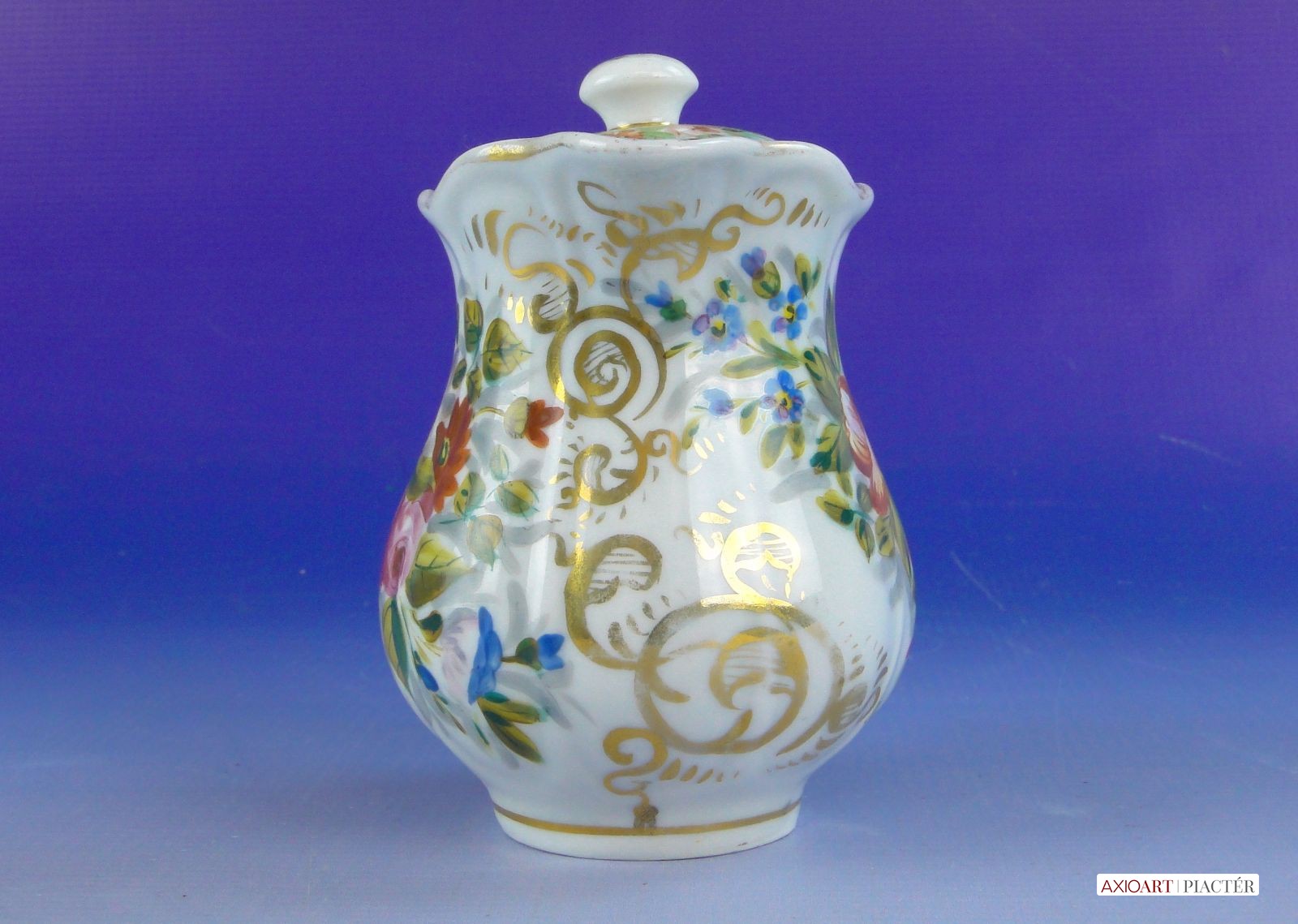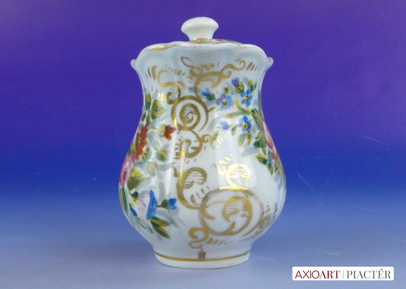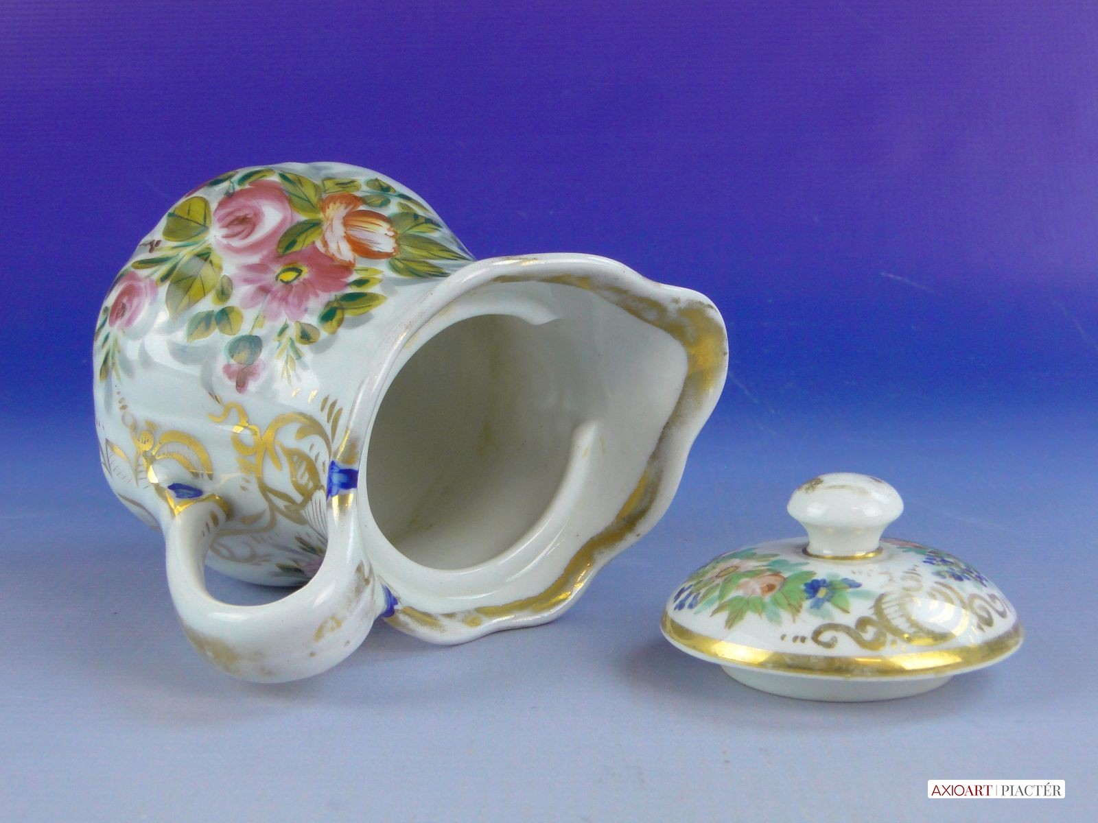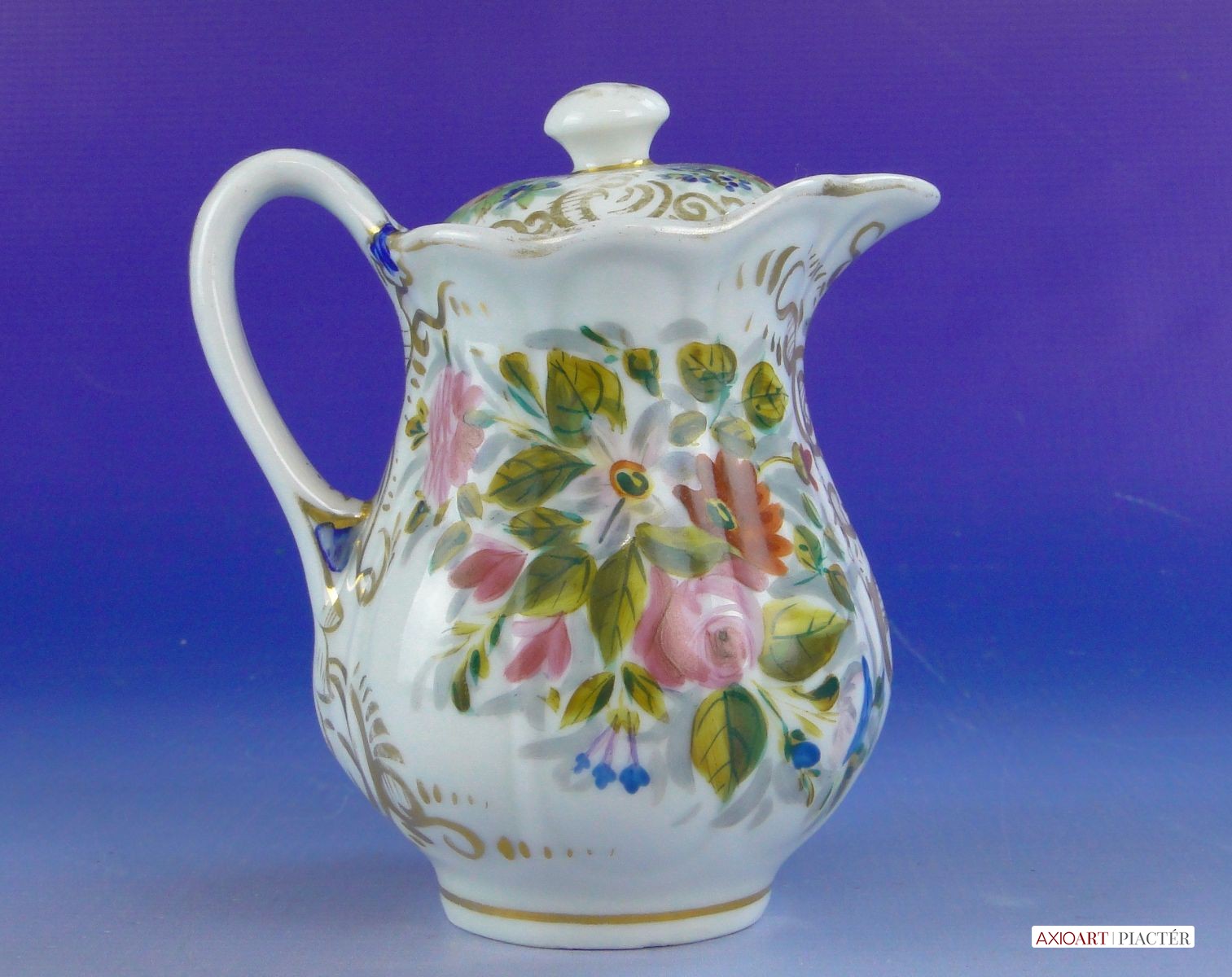 [0F523/UZ-K] Antik, 1850-1880 körüli Meisseni jellegű, gazdagon díszített barokkos formájú, vastagon aranyozott, kézi festéssel díszített, porcelán kiöntő. Magasság: 12 cm Szélesség: 8 cm Súly: 0.255 kg