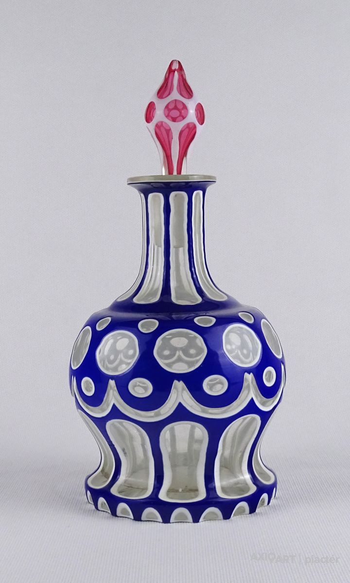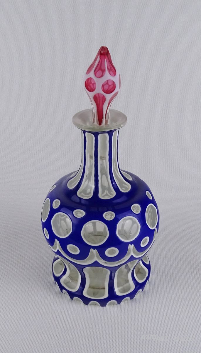 Antik gyönyörű rétegelt üveg asztali kínáló dugóval. Kék, fehér és áttetsző rétegek egymáson, gyönyörű kézi csiszolatokkal hántolva az 1800-as évekből. Dugója rózsaszínre színezett, gyönyörű darab.
