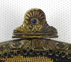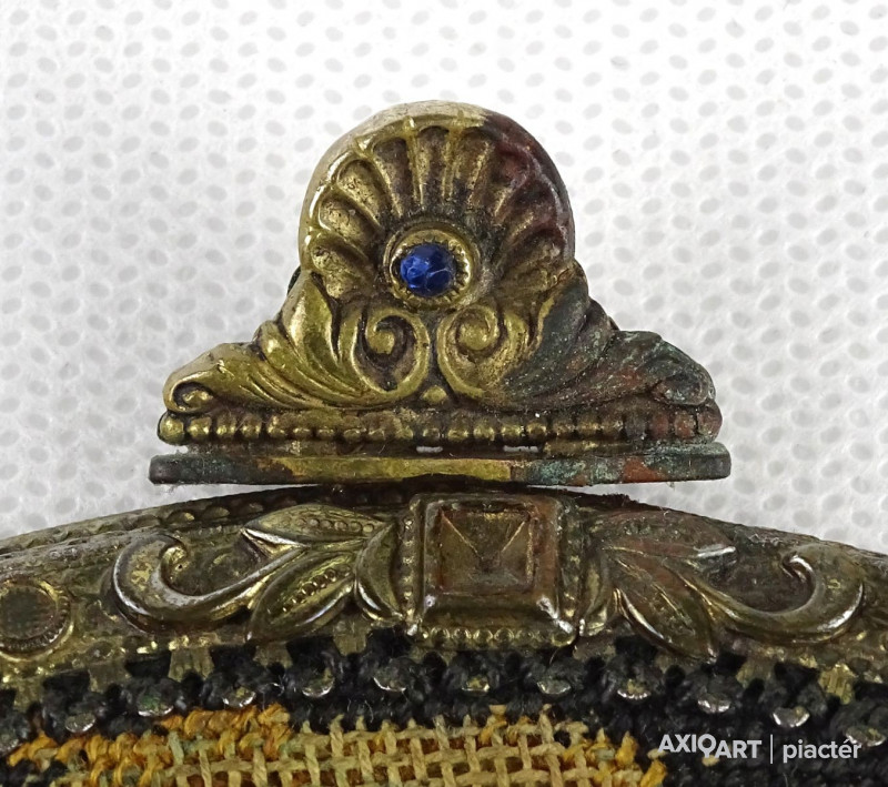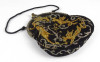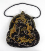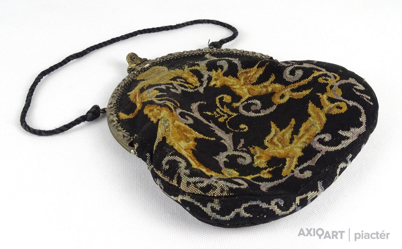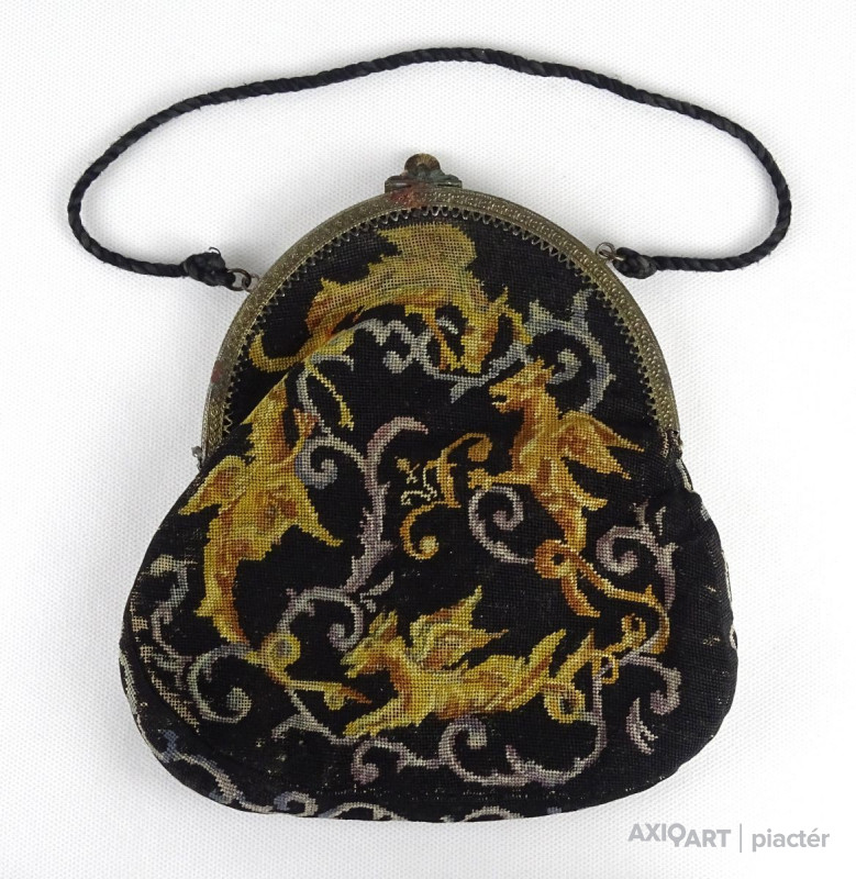 Antik selyembéléses fekete színű, csuklóra fogható női táska, ridikül. Míves réz csattal rendelkezik. A táska sárga sárkány motívumokkal díszített. Ritka! Gyűjteménybe való darab.