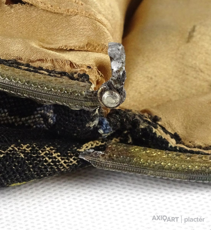 [1J912/X145] Antik selyembéléses fekete színű, csuklóra fogható női táska, ridikül. Míves réz csattal rendelkezik. A táska sárga sárkány motívumokkal díszített. Ritka! Gyűjteménybe való darab. Magasság: 21 cm Szélesség: 19.5 cm Súly: 0.095 kg
