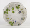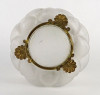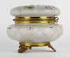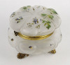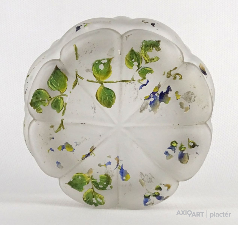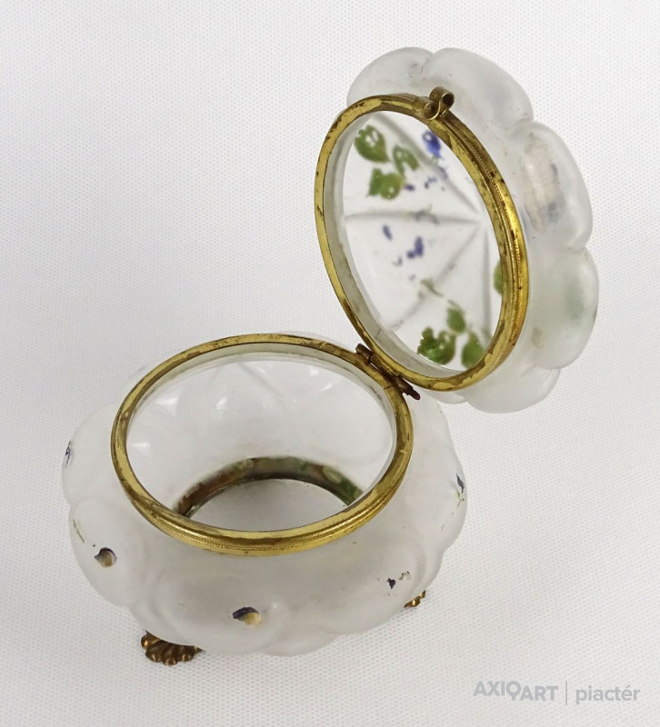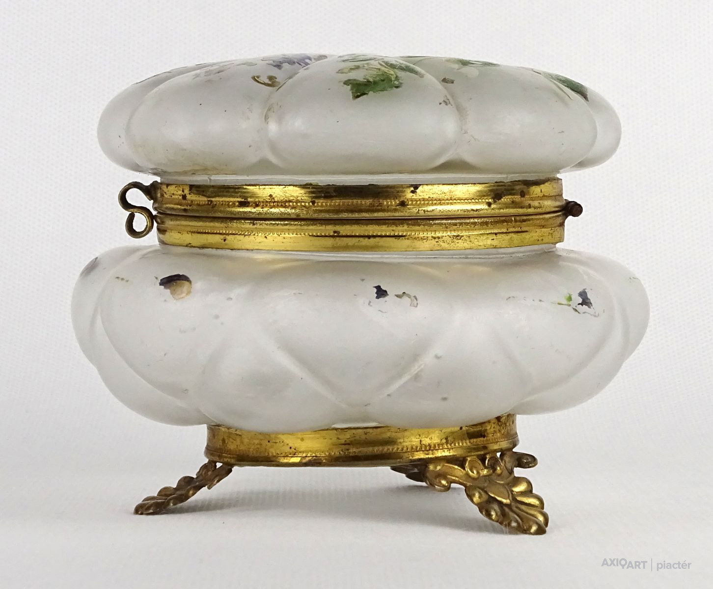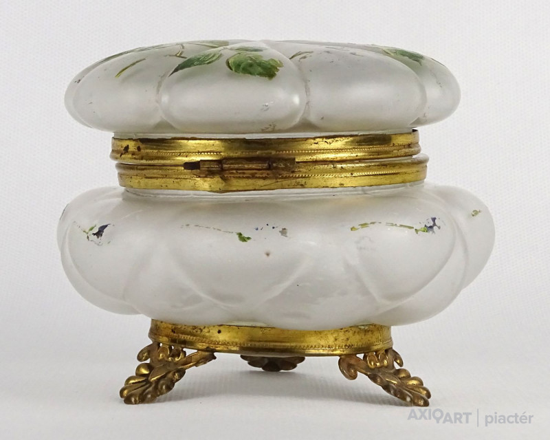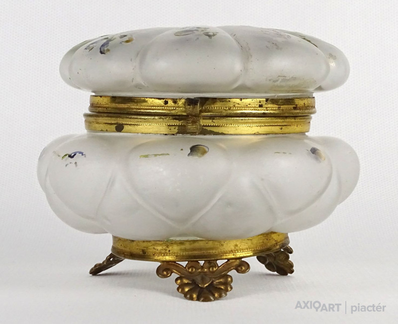 Antik, szép állapotú, gerezdes üveg bonbonier az 1900-as évek első feléből. Rajta kopottas kézi festés. Réz lábon álló kagylóhéj színű üveg ékszertartó bonbonier.