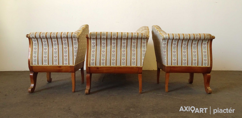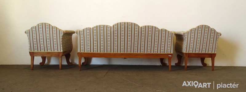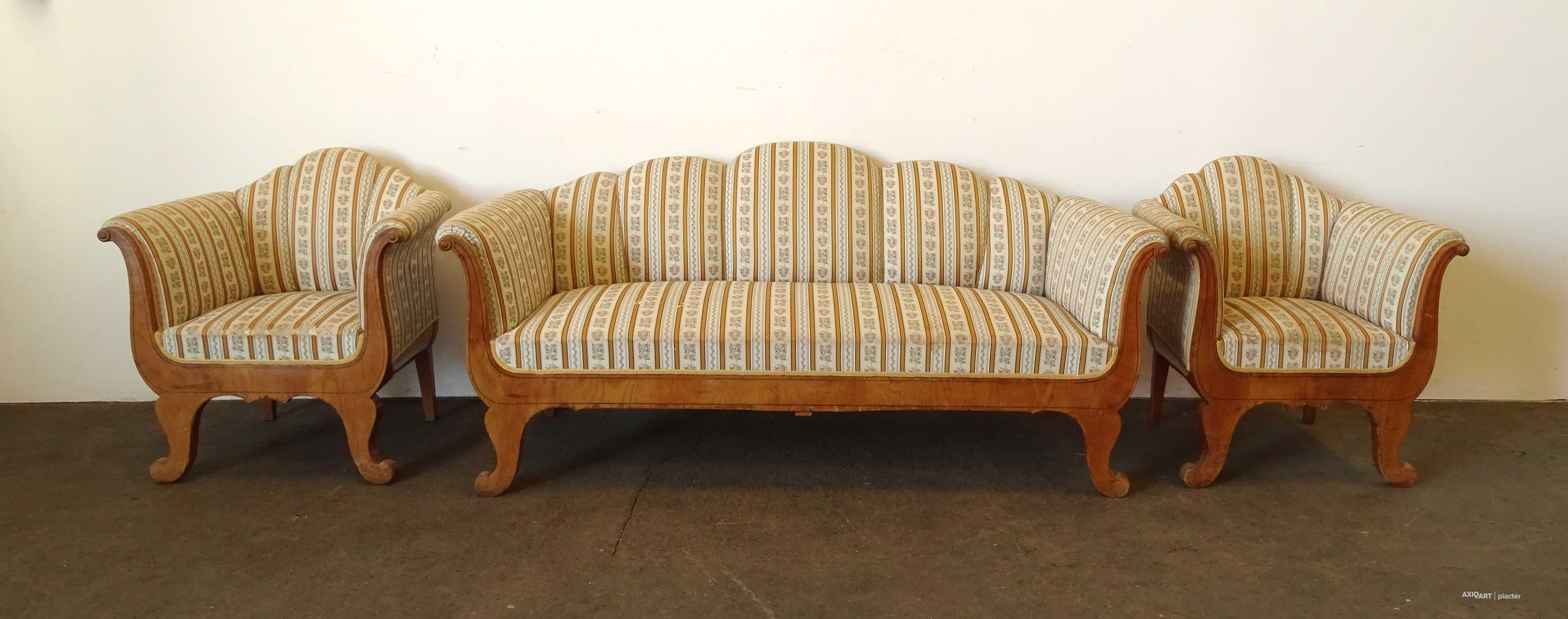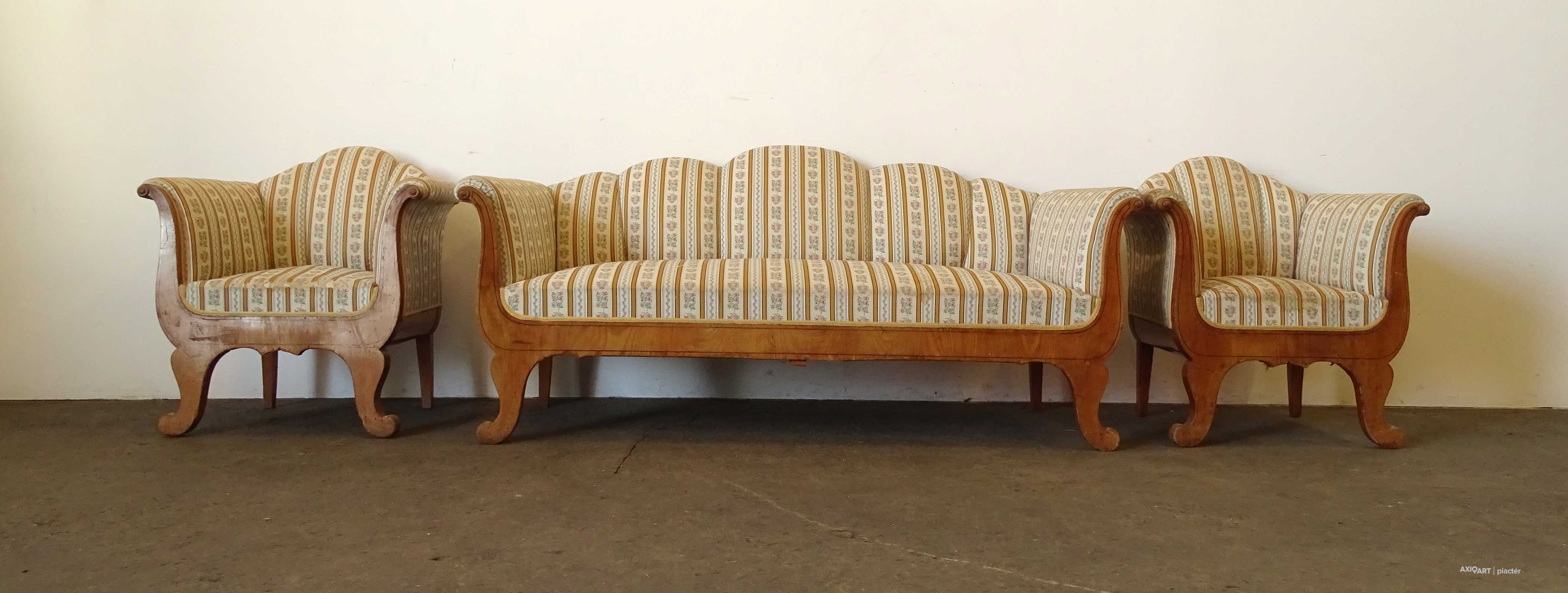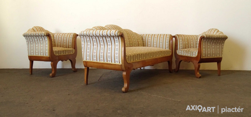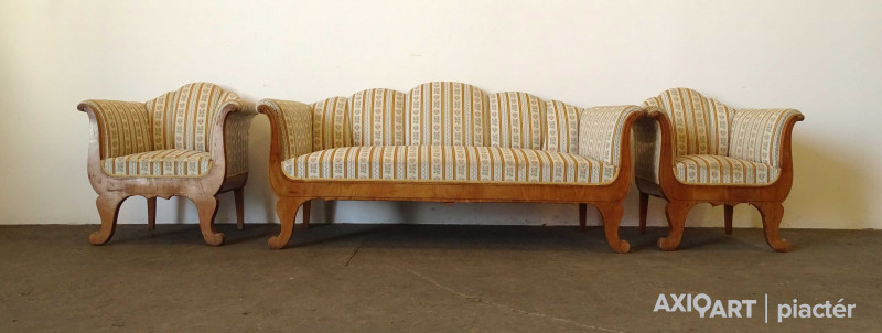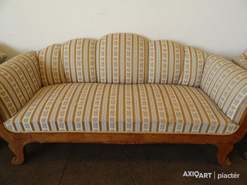 Antik, gyönyörű, csigás lábú Biedermeier három darabból álló szalongarnitúra, ülőgarnitúra, szép, azonnal enteriőrbe helyezhető állapotban. Egységes, csíkos, tipikus Bieder kárpitozással, epeda rugós, kényelmes, kivehető ülőfelületekkel.
