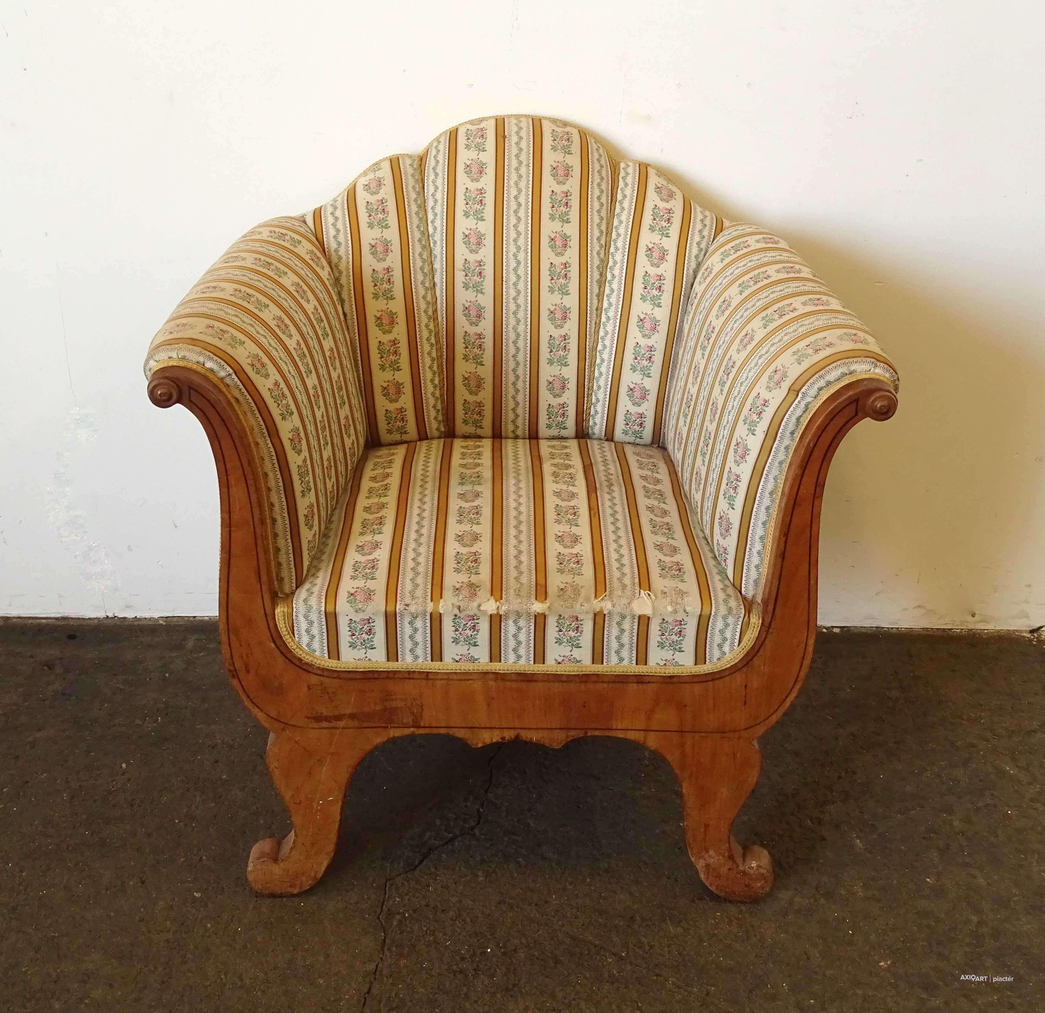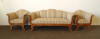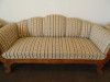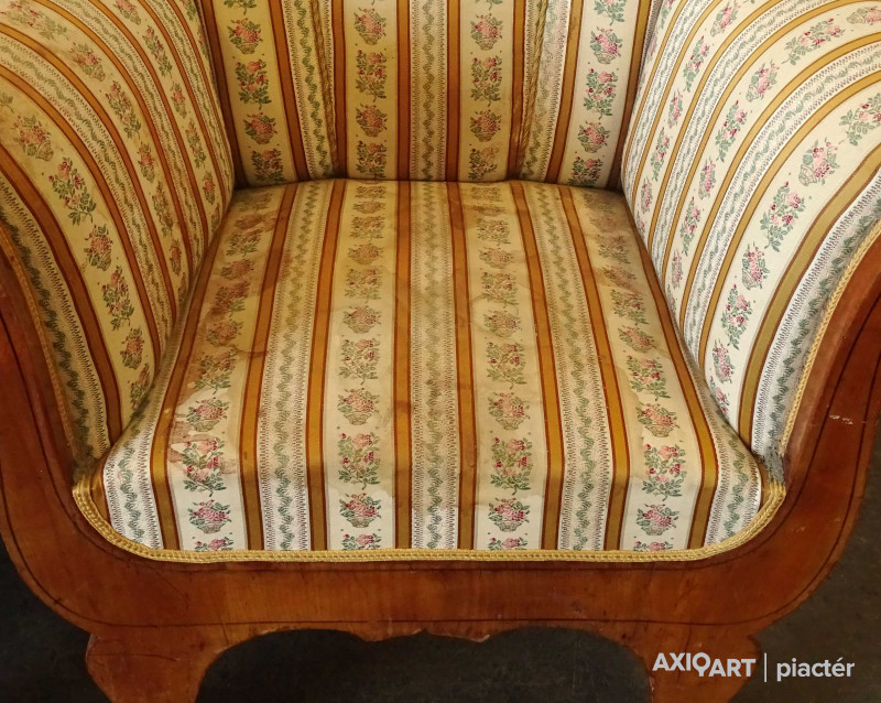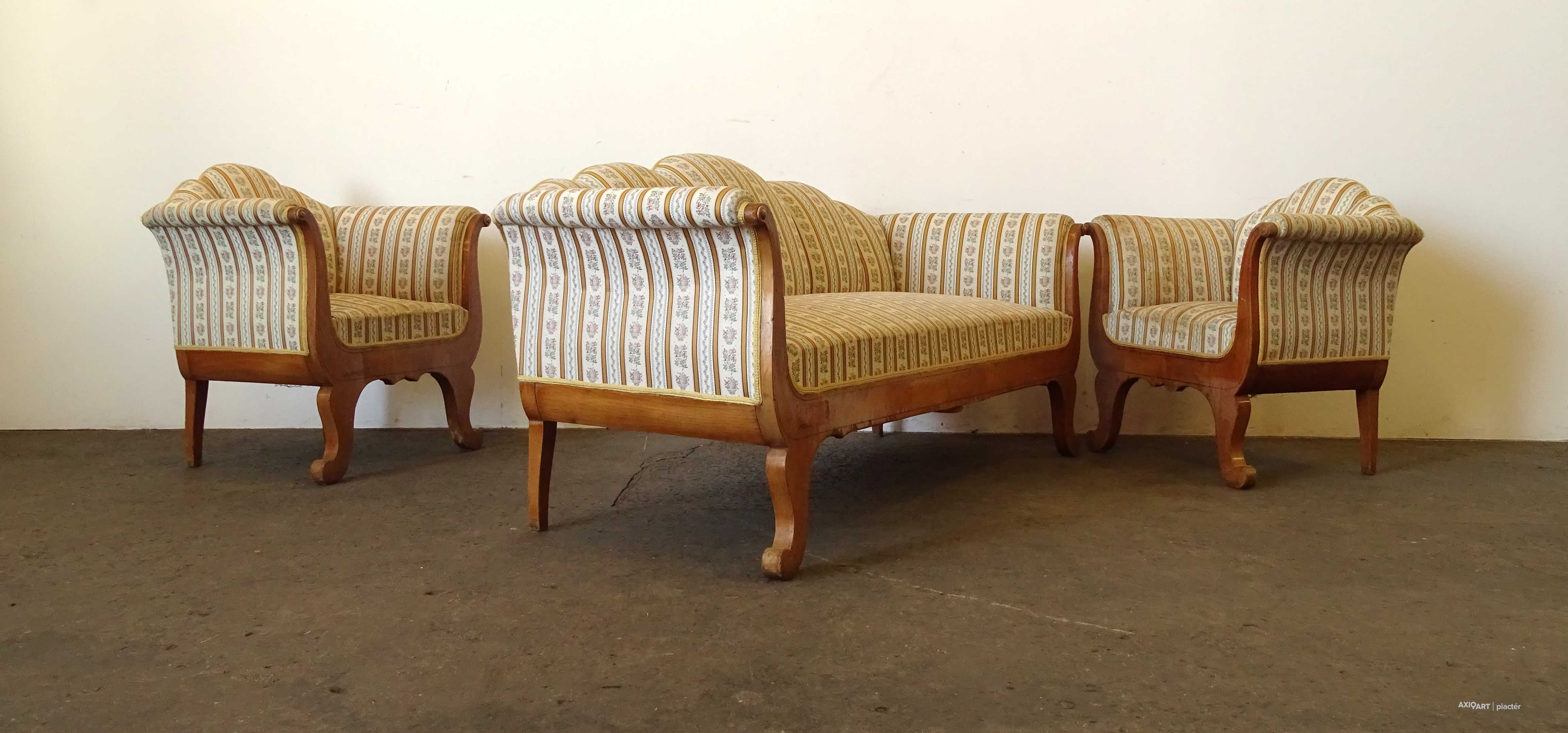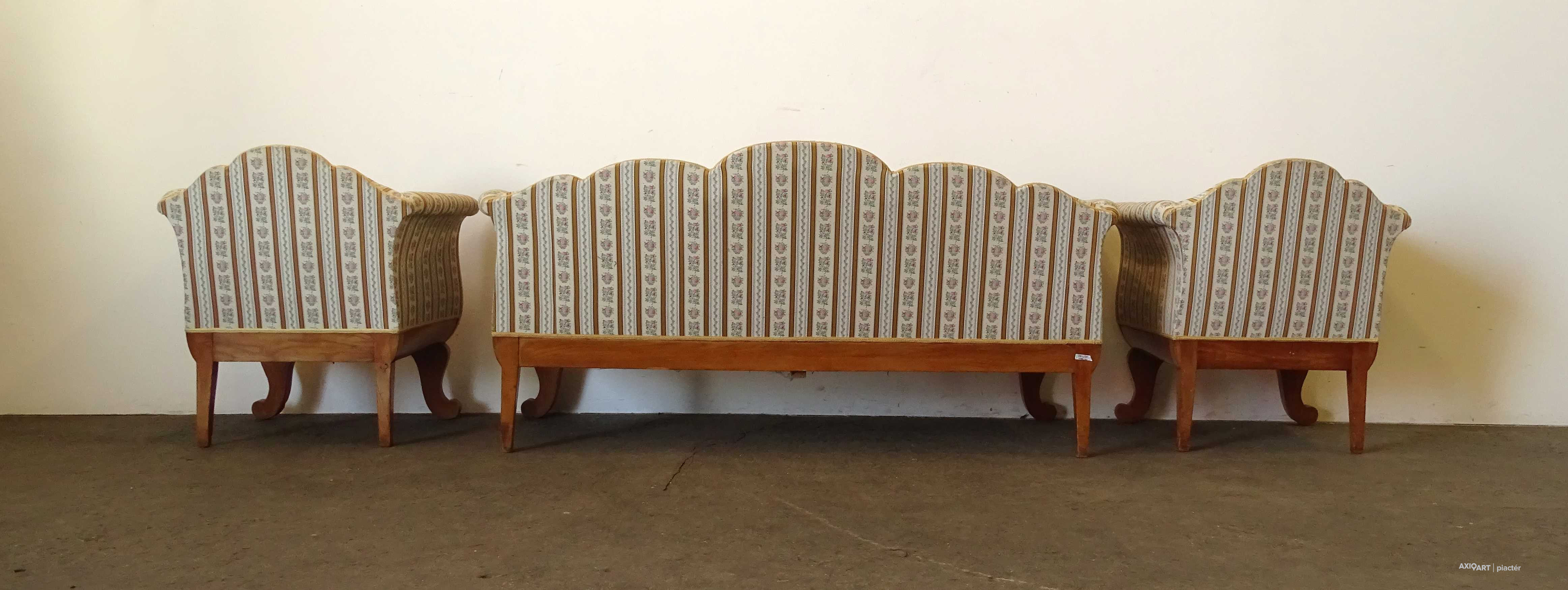 Antik, gyönyörű, csigás lábú Biedermeier három darabból álló szalongarnitúra, ülőgarnitúra, szép, azonnal enteriőrbe helyezhető állapotban. Egységes, csíkos, tipikus Bieder kárpitozással, epeda rugós, kényelmes, kivehető ülőfelületekkel.