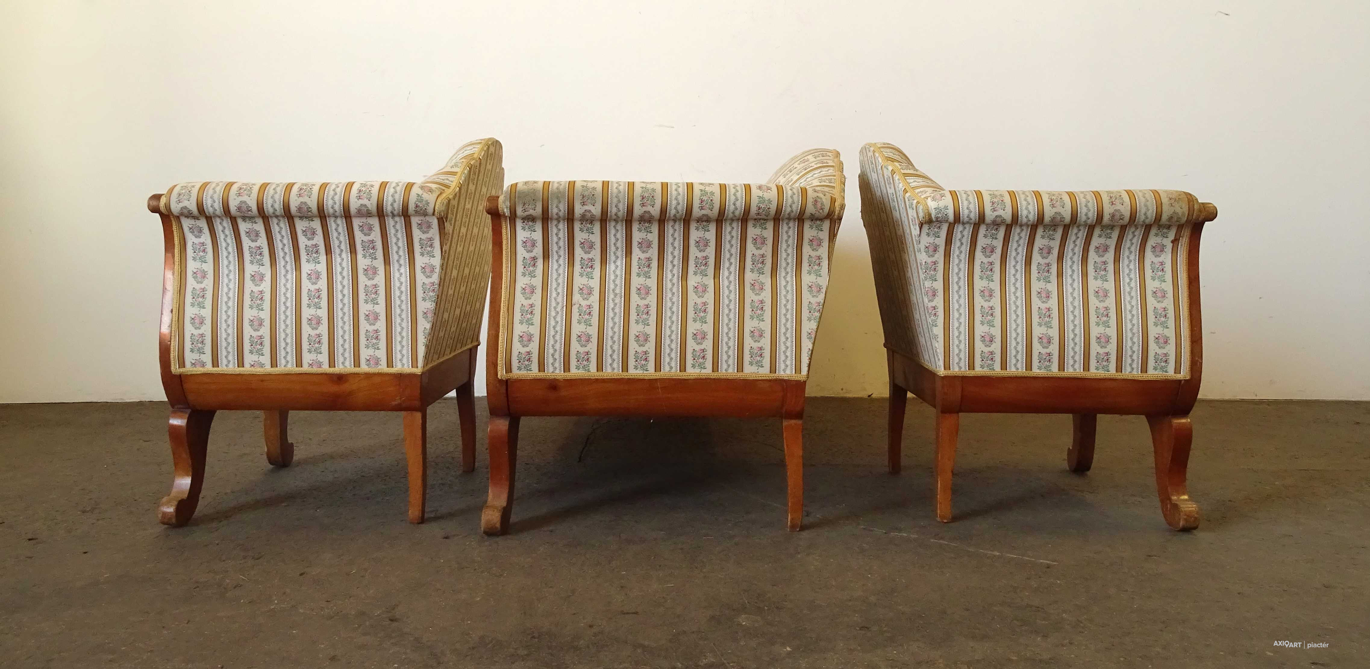 [1V902/UZ-K] Antik, gyönyörű, csigás lábú Biedermeier három darabból álló szalongarnitúra, ülőgarnitúra, szép, azonnal enteriőrbe helyezhető állapotban. Egységes, csíkos, tipikus Bieder kárpitozással, epeda rugós, kényelmes, kivehető ülőfelületekkel. A garnitúra részei: - 1 darab háromszemélyes kanapé magassága: 88 cm szélessége: 196 mélysége: 82 cm) - 2 darab karfás, támlás fotel magassága: 86 szélessége: 84 mélysége: 65 cm