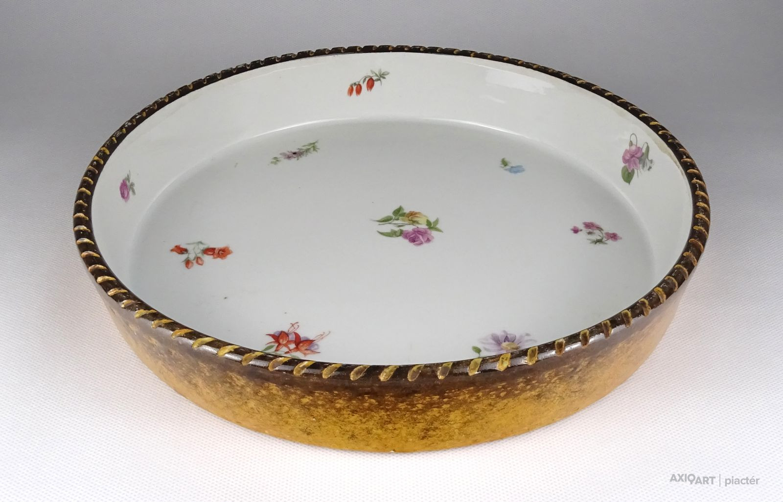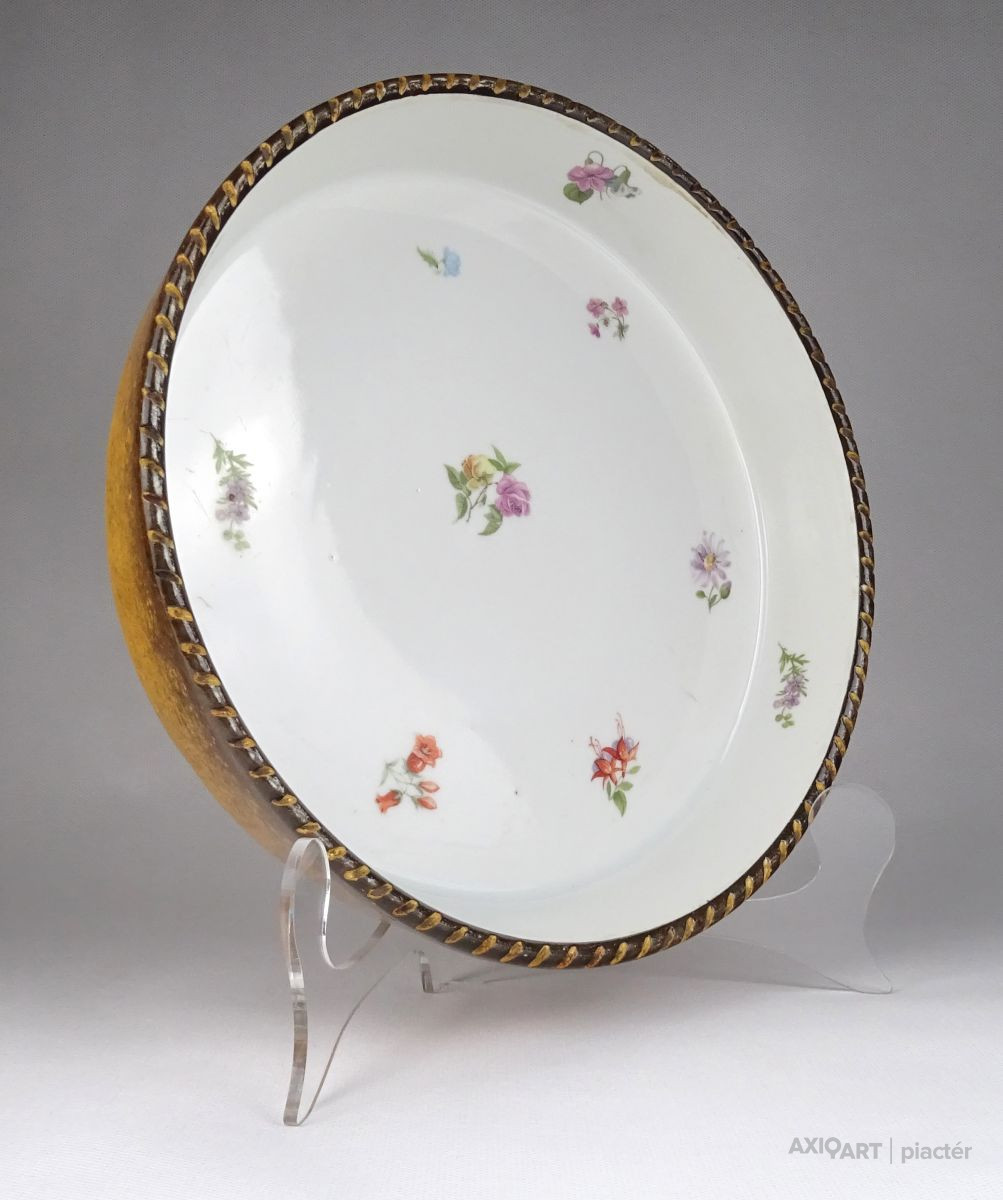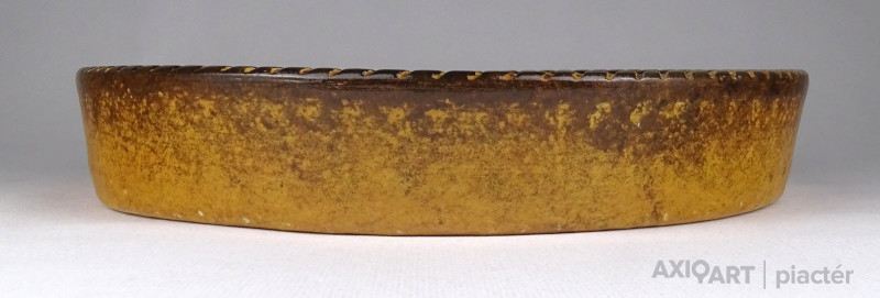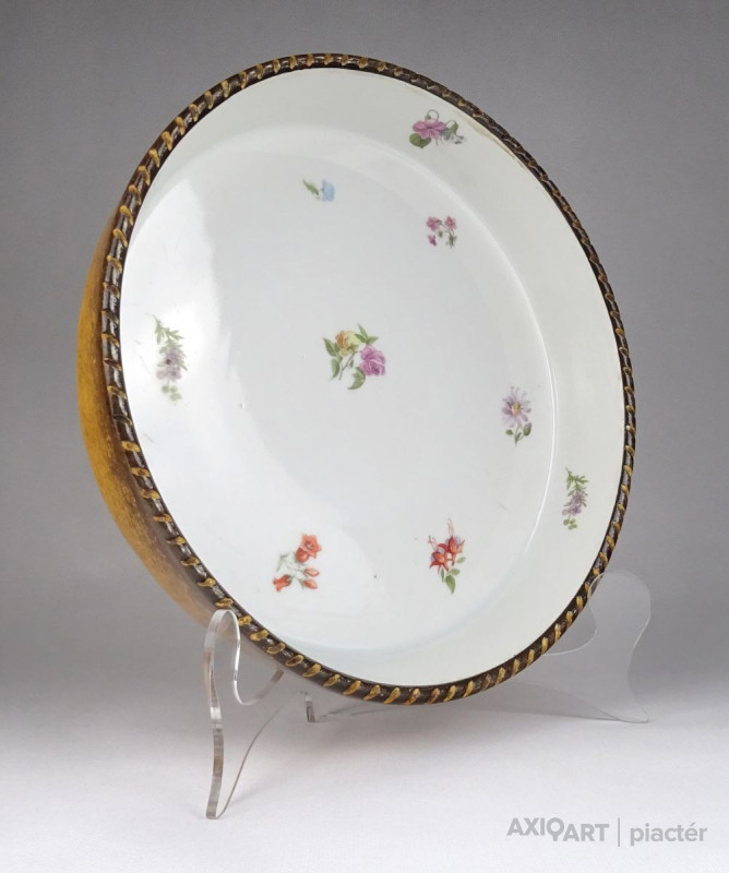 [1R355/X291] Antik, nagy méretű, szép állapotú sütőtál, pite sütő tál. Külseje kerámia hatású, belső fele virágdíszes mázas porcelán felület. Magasság: 4.7 cm Szélesség: 27 cm Súly: 1.37 kg