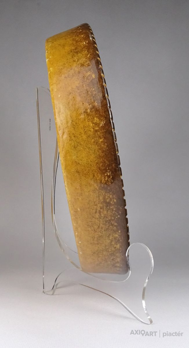 [1Y029/Z018] Olaj farost festmény, üveglap mögött, hibátlan képcsarnokos keretben. Hátoldalán Képcsarnok Vállalat papír címkéje: A művész neve: SCHÉNER MIHÁLY A kép címe: TÁJ Magasság: 66.5 cm Szélesség: 86 cm Súly: 6.54 kg Schéner Mihály festő, grafikus, szobrász, keramikus, bábtervező Medgyesegyháza, 1923-01-9 Elhalálozott: Budapest, 2009. május 11. Honlap: http://www.kormendigaleria.hu/kiadvany.html 1942-1947: Magyar Képzőművészeti Főiskola, tanára: Rudnay Gyula. 1978: Munkácsy-díj; 1984: érdemes művész; 1989: kiváló művész; 1995: Kossuth-díj. 1992-től a Magyar Művészeti Akadémia, 1993-tól a Széchenyi Irodalmi és Művészeti Akadémia tagja. 1956-ig tanított. 1982: Nagyatádi Faszobrász Alkotótelep, 1985: Nemzetközi Acélszobrász Alkotótelep, Dunaújváros. A stílusában felismerhető, mégis sokféle műtárgyat létrehozó ~ gazdag, állandóan alakuló életműve a folyton változó világban helyét kereső, az alkotói szabadságot megvalósító XX. századi képzőművész példázata lehetne. Magát expresszív-szürrealista alkotónak nevezi. Egyaránt dolgozik festékkel, textillel, fával, fémmel. Rajzol, szerkeszt, farag, épít, gyúr, varr és ragaszt, felhasználja a mézesbábok öntőformáit. Festő, rajzoló, textilszobor- és bábkészítő, fazekas, asztalos, esztergályos. Háromlépcsős folyamatban gondolkozik: rajzban tervez, majd fest, szobrot készít, “formába önt”, mindig a végső plasztikai megoldást keresi. Ami állandó és mégis játékosan változékony megjelenésű Schéner művészetében, az a gyermekkori emlékek által meghatározott népi mesterségek iránti tiszteletet kifejező motívumkincs, a tárgyi folklór formakészlete, amely már-már kézjegyként ismétlődik munkáin. Mitologikussá nőtt képzelete új lényeket teremt, pl: a Pigulát, amely disznótestű, emberfejű teremtmény. Schéner festményein a szürrealista motívumokat konstruktív szerkezetbe rendezi, a geometriát és az organikus természeti motívumokat egyaránt beépíti műveibe. A népi, népművészeti formakincsből merített lovas huszárok, betyárok, szegénylegények cifra szűr mentéje, piros csákója, fekete csizmája, az önálló életet élő zsinórdíszek és mézeskalács bábok, a kiskocsik a gyermekkori vásárok, búcsúk színes forgatagába vezet. A primér motívumokat aztán felváltják a vastagon felhordott felületbe karcolt jelek, vonalhálózatok, amelyek a játszó gyermek homokba rajzolt ábráit, a pásztorember fába vésett üzeneteit, az ősember barlang falába rótt mágikus jeleneteit idézik meg. A művész pillanatnyi érdeklődésének megfelelően a színek búvópatakként tűnnek el és jelennek meg ismét. A 60-as években leginkább a formákkal való játék érdekelte, a festmények felülete egyre gazdagodott: a táblaképek felületén applikációk jelentek meg, vagy lemállasztott rétegek hagyták maguk után hiányukat, motívumok nélküli ősformák, archetipikus képzetek bukkantak fel művészetében. A véletlenszerűnek látszó rétegekkel való játék azonban tudatos komponálás eredménye, amely később nyilvánvaló ritmusnak és formai szerkesztettségnek adja át a helyét, mint a Törvénytáblák c. sorozaton. A különböző művészi kifejezési formák egymásra termékenyítő hatással vannak, át- meg áthatják egymást. Textilszobrai, amelyekkel új műfajt teremtett, ugyanazzal az automatikus, expresszív-szürrealista módszerrel készülnek, mint festményei. A hagyományosan a népművészetben alkalmazott anyag, a filc lehetőséget ad a népi formakincs felelevenítésére, amely azonban a művész különös szürrealista átiratában jelenik meg. A szívekkel kivarrt, zsinórdíszes Posztókotlós c. művén mézesbábok lógnak, hátán huszárok lovagolnak. Egész sor textilből készült kéz-plasztikát alkot, amelyeket az ujjakra rávarrt díszekkel öltöztet, személyesít meg. A színes-különös világból aztán ~ újra puritán képi és formai rendbe juttatja el a nézőt, majd nemsokára tépett, gyűrt, vágott, csorgatott, repedezni hagyott szenvedélyesen vonagló képi felületeket hagy hátra. Schéner készített apró gyermekjátékokat, térstruktúra-tereket, mászókákat is. A magyar népi formák mellett szürreális játékaiban gyakran alkalmaz görög mitológiai alakokat, “elkentaurosodott” lovakat, Gorgó-fejeket, sellőket, hárpiákat, Pán-ábrázolásokat. Schéner nemcsak saját művészetéről publikál, hanem művésztársairól is számos írása jelenik meg, elsősorban az Új Auróra c. folyóiratban, amelynek egy ideig főmunkatársa volt. Irodalom kiállítása, Magyar Építőművészet, 1962/4. Húsz év után, Művészet, 1965/4. BOZÓKY M.: ~, Tiszatáj, 1968/5. PERNECZKY G.: Nincs uborkaszezon, Élet és Irodalom, 1969. augusztus 8. BARÁNSZKY-JÓB L.: ~, Művészet, 1969/9. LÁSZLÓ GY.: ~ kaposvári kiállítása, Jelenkor, 1969/4. MAJOR M.: Pásztorok, betyárok, huszárok - kezek, Tükör, 1970. szeptember 15. FRANK J.: Bemutatjuk ~t, Élet és Irodalom, 1972. május 6. ról kiállítása ürügyén, Képzőművészeti Almanach, Budapest, 1972 Sötétkék kokasok, Élet és Irodalom, 1973. szeptember 9. MAJOR M.: ~ játékai, Élet és Irodalom, 1974. július 27. BARTA J.: Egy különös művész, Alföld, 1974/6. VADAS J.: Szárnykészítők, Élet és Irodalom, 1975. október 4. JUHÁSZ F.: A halál ellen játszani, Élet és Irodalom, 1975. május 17. PAP G.: Kincsek és műkincsek, Művészet, 1975/6. P. SZŰCS J.: Az utak kettéválnak, Művészet, 1978/3. Békési művészet, Művészet, 1978/7. SZAMOSI F.: ~ [kismonográfia], Budapest, 1978 VADAS J.: Játék a játékkal, Élet és Irodalom, 1979. augusztus 18. NÉMETH L.: ~ műveiről, Művészet, 1979/4. MIKLÓS P.: Mit akar ez a múzeum?, Művésze