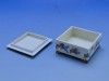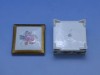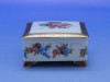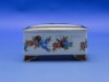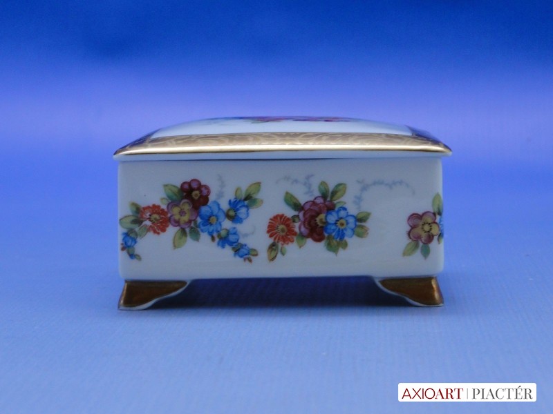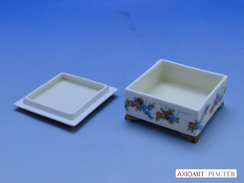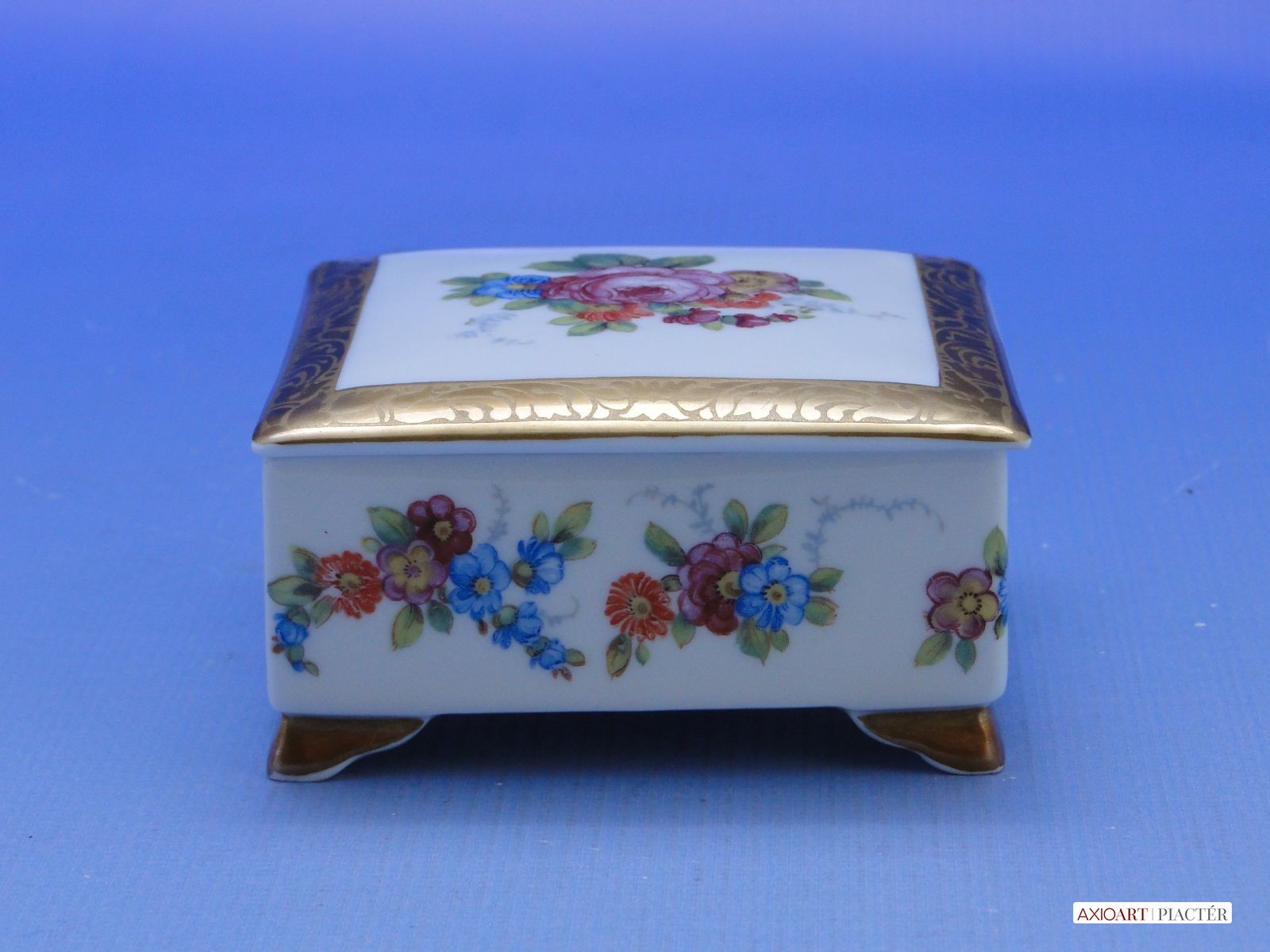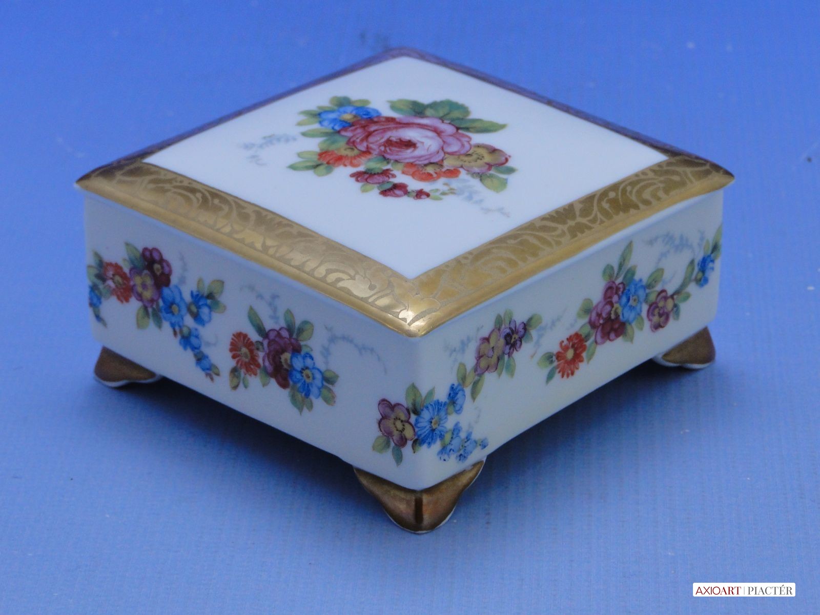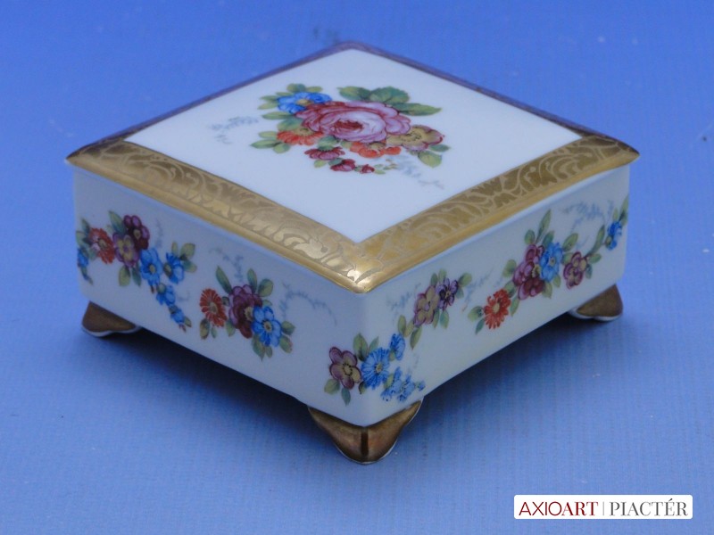 Antik gazdagon aranyozott virágmotívumokkal dísztett szögletes alakú, négy pici aranyozott lábon álló, porcelán ékszertartó, gyűrűtartó bonbonier.