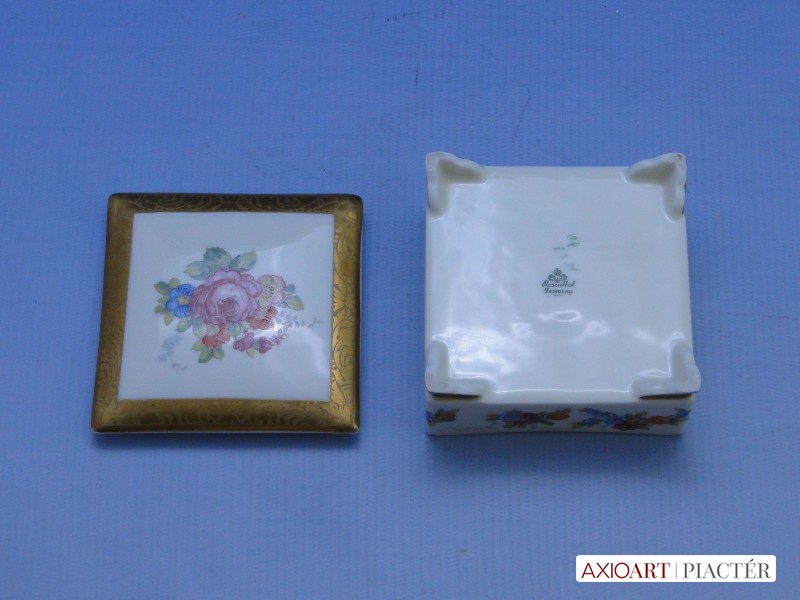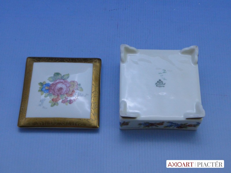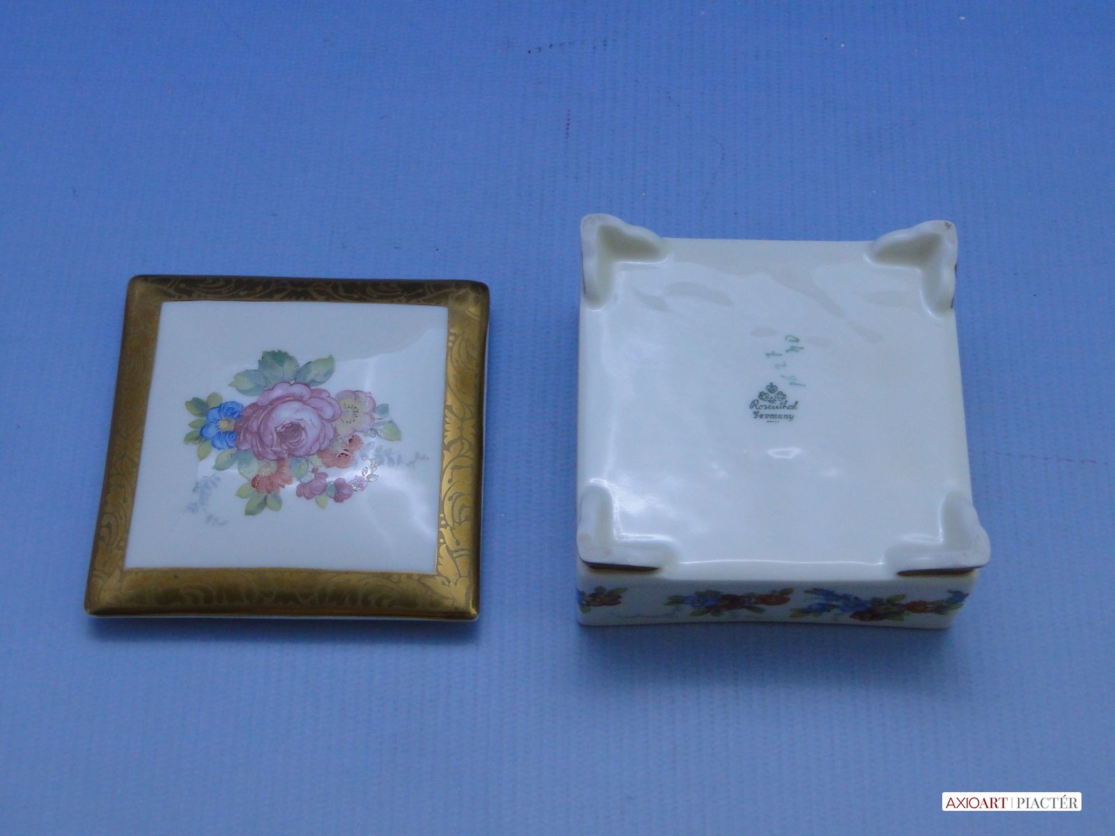 [0C500/X025] Antik gazdagon aranyozott virágmotívumokkal dísztett szögletes alakú, négy pici aranyozott lábon álló, porcelán ékszertartó, gyűrűtartó bonbonier. Alján zöld színű koronás márkajelzés: ROSENTHAL GERMANY Formaszám: 1265 Felirat zölddel: 1627 40 Aranyozása kopásmentes, ajándékba adható állapotban van. Magasság: 4.5 cm Szélesség: 8 cm Hosszúság: 8 cm Súly: 0.183 kg