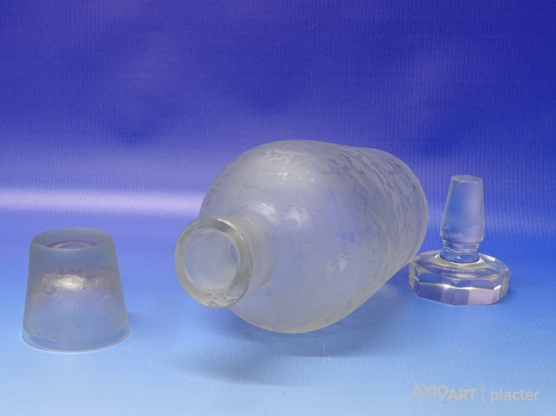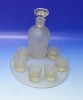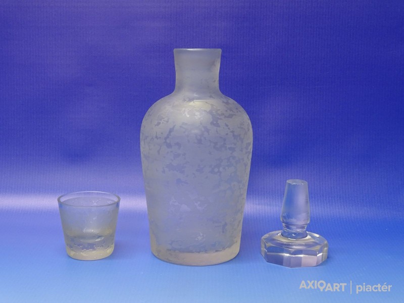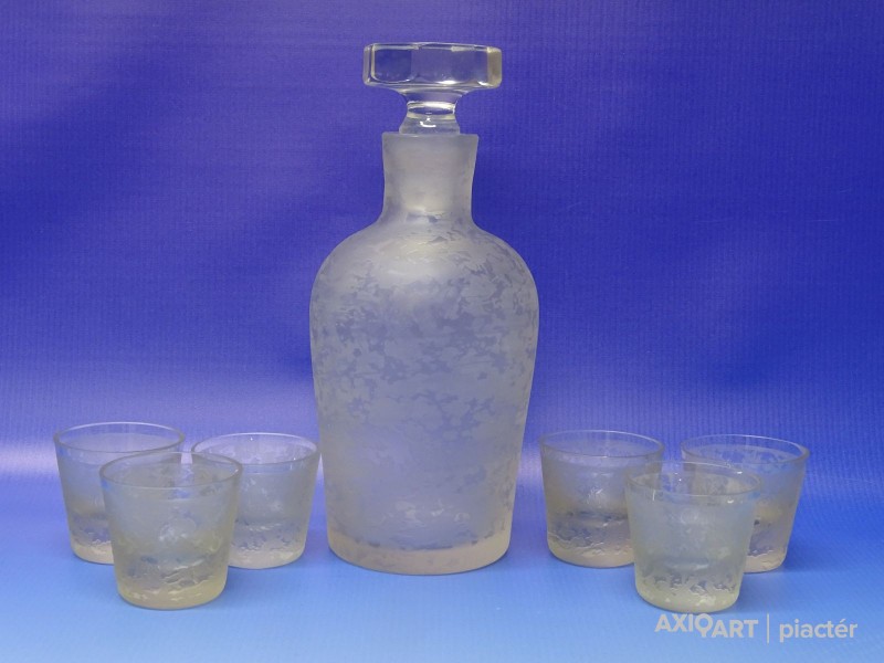 Antik, hibátlan állapotú, vastag falú, komplett pálinkás üveg dugójával és azonos mintázatú hat darab pálinkás pohár.