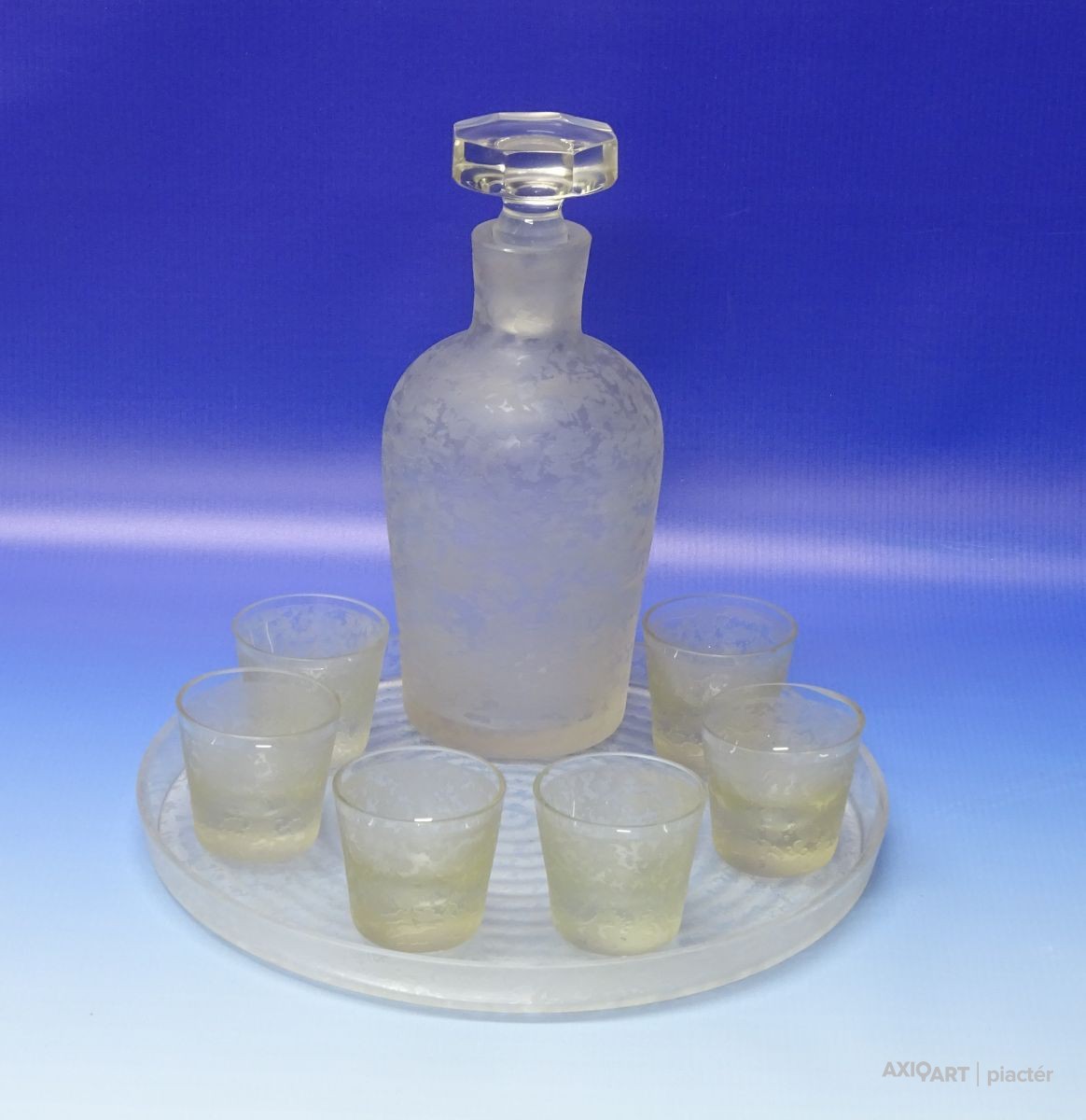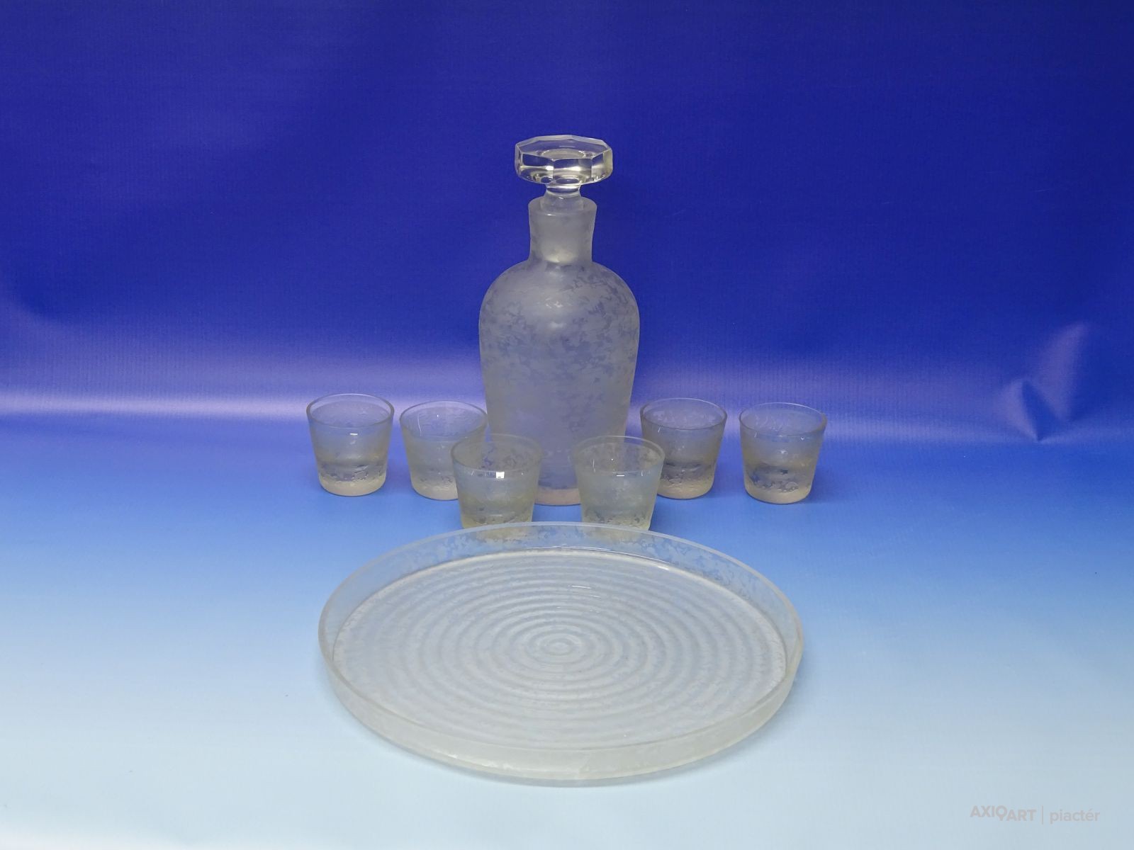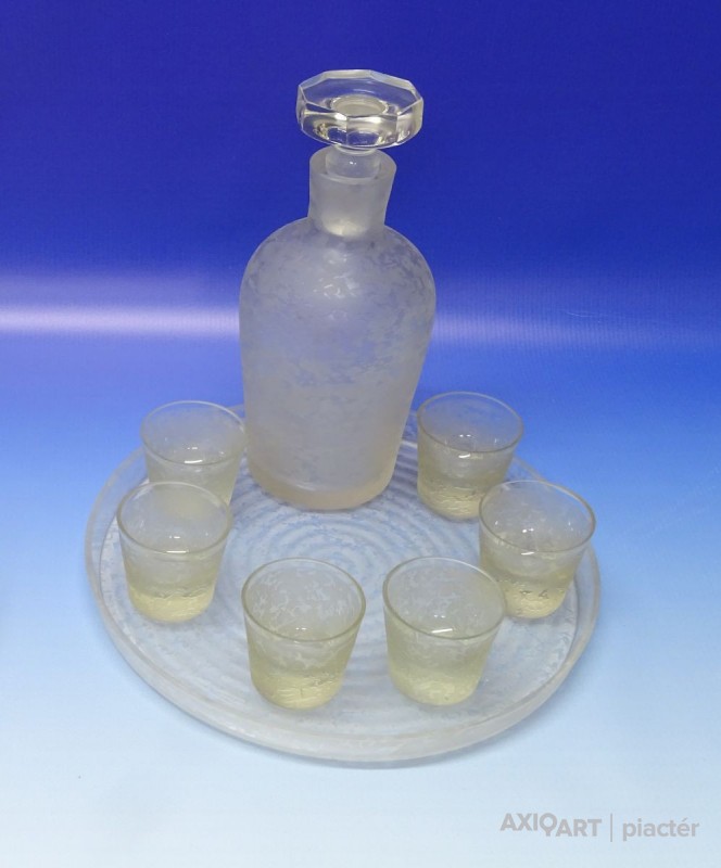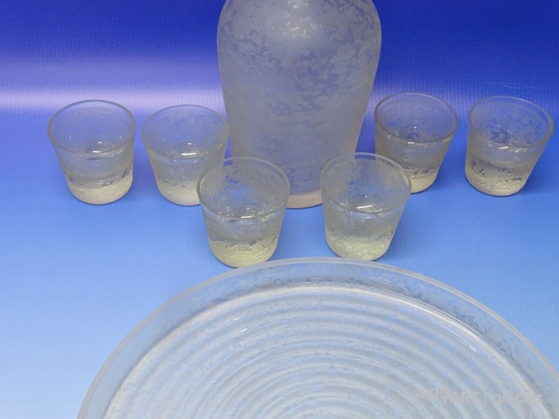 [0N422/X232] Antik, hibátlan állapotú, vastag falú, komplett pálinkás üveg dugójával és azonos mintázatú hat darab pálinkás pohár. A készlet darabjai: - 1 darab pálinkás üveg (22.5 cm) - 6 darab stampedlis pohár (5 x 5.5 cm) - 1 darab kínáló tálca (26.5 cm) Súly: 2.335 kg