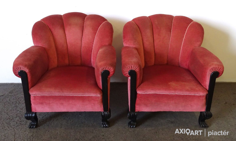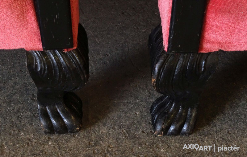 Antik, szép állapotú karfás fotel pár. Fekete oroszlánlábas darabok rózsaszín, mályva kárpitozással. Az egyik ülőfelülete foltos, lásd fotó.