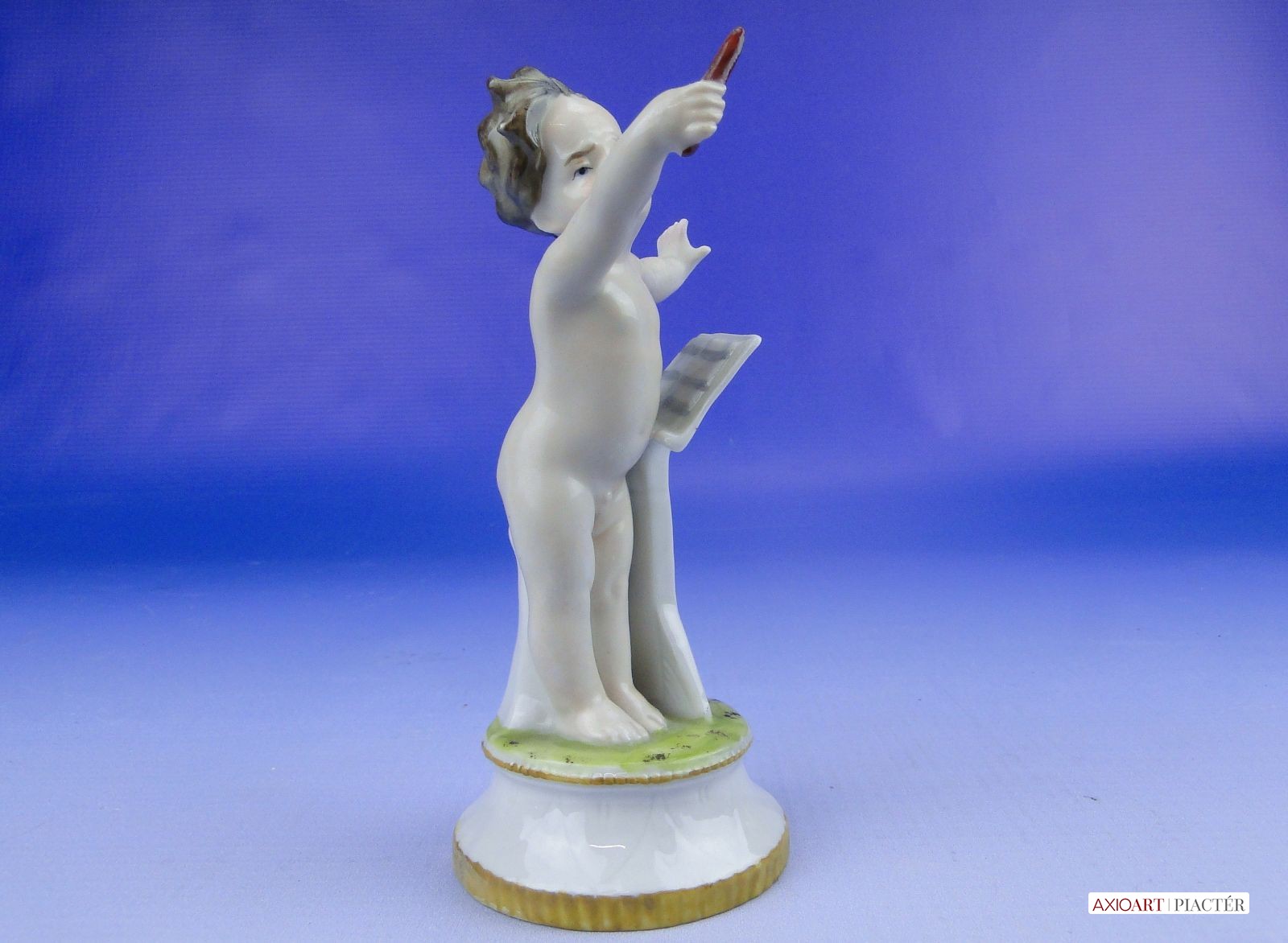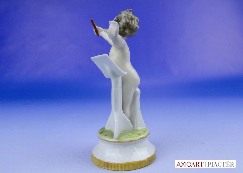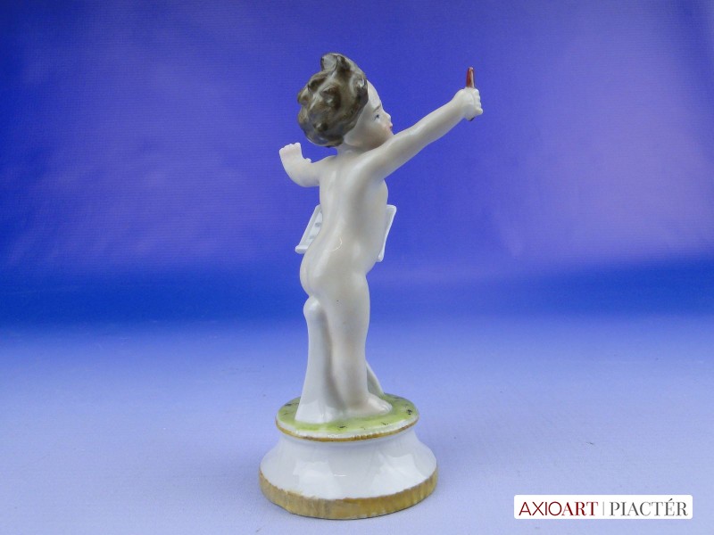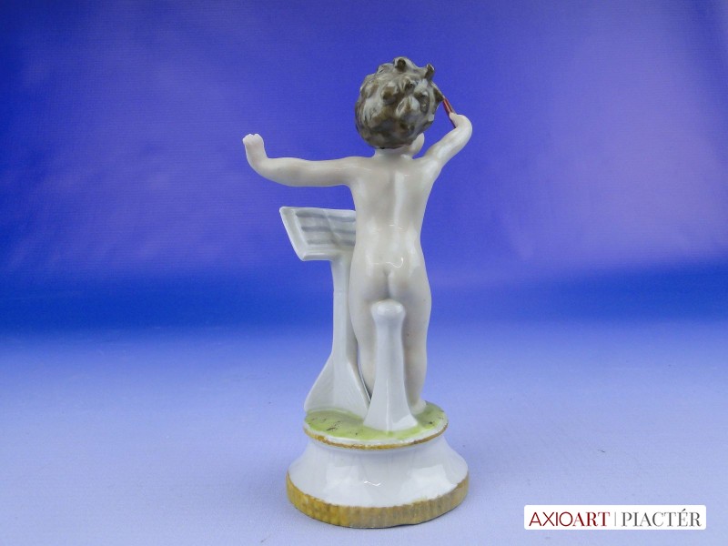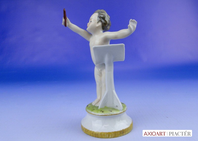 Hibátlan állapotú, antik jelzett, talapzaton álló kisméretű porcelán karmester meztelen kisfiú figura.