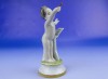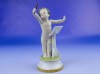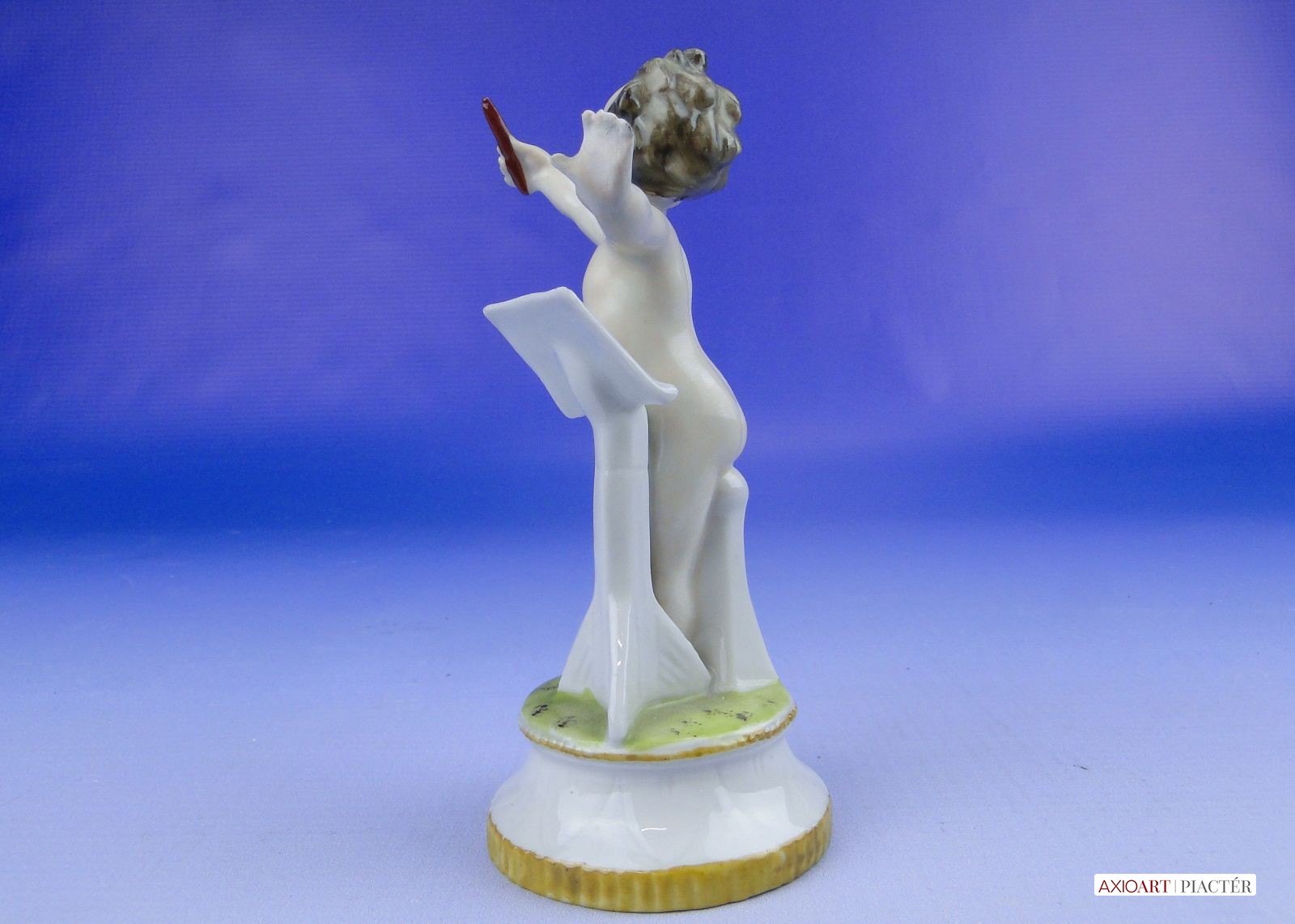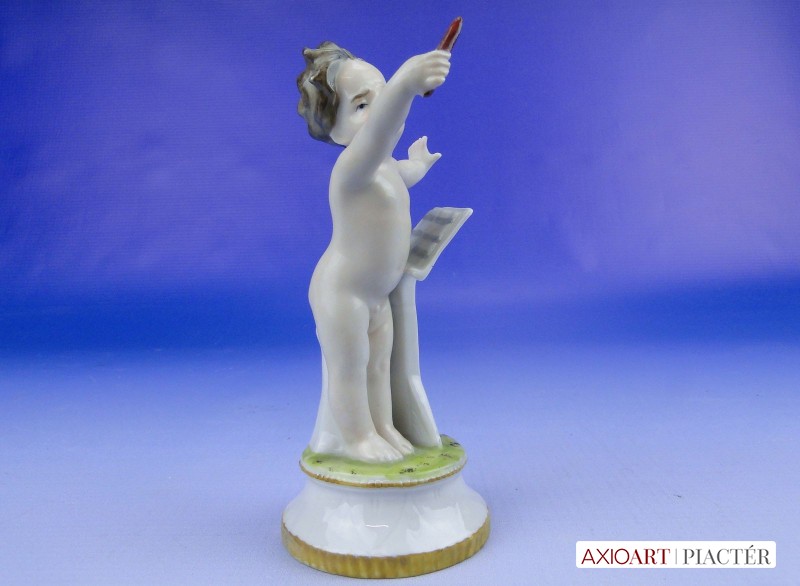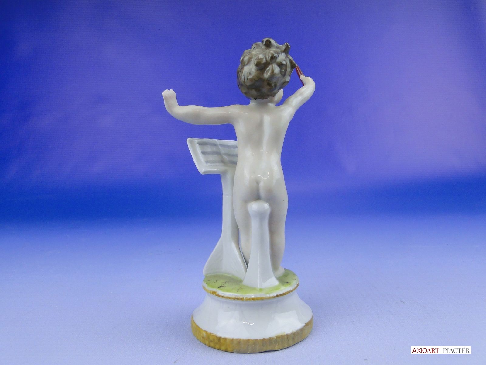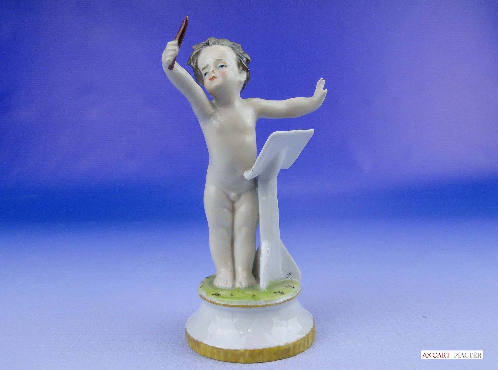 Hibátlan állapotú, antik jelzett, talapzaton álló kisméretű porcelán karmester meztelen kisfiú figura.