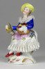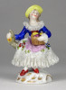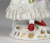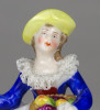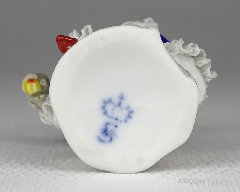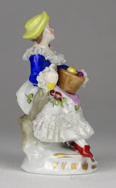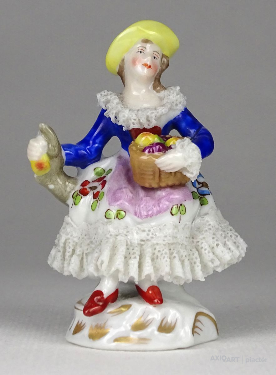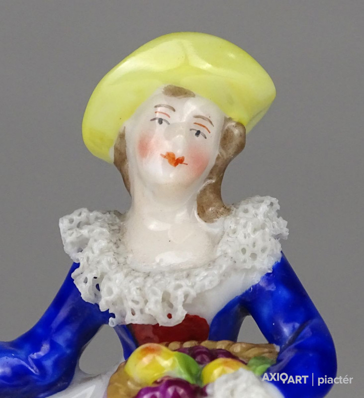 Antik jelzett német főúri porcelán, mini porcelán figura az 1900-as évek elejéről. Kalapos nő, kezében gyümölcsöstál. Ruhája kézi festésű virág motívumokkal díszített. A ruha fodrai helyenként sérült, lásd fotó.