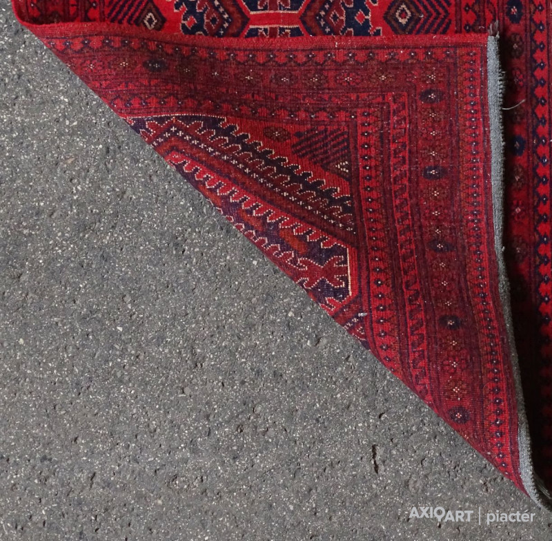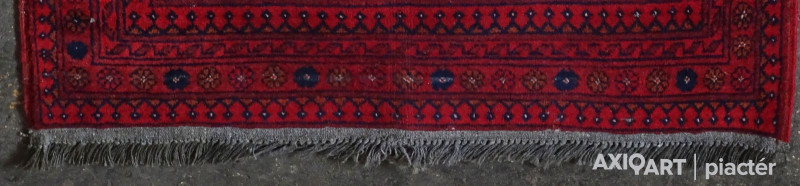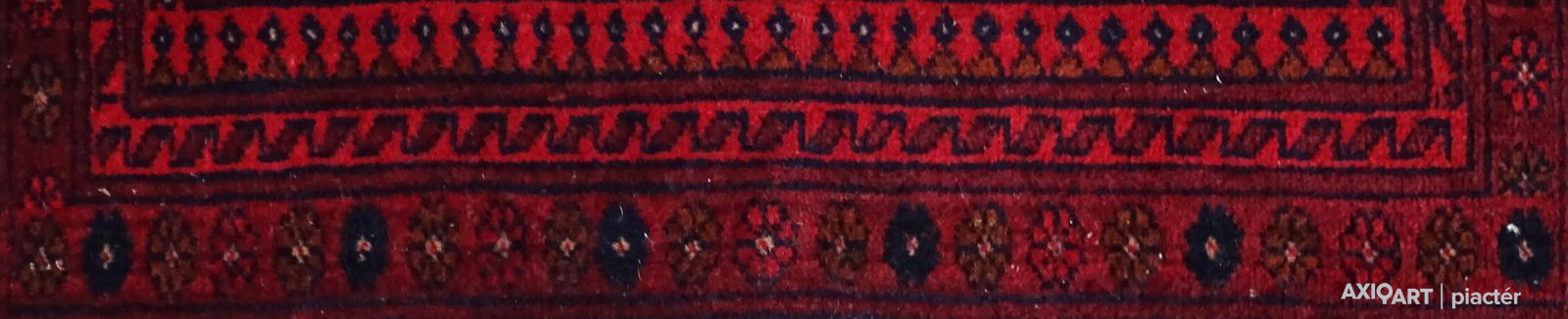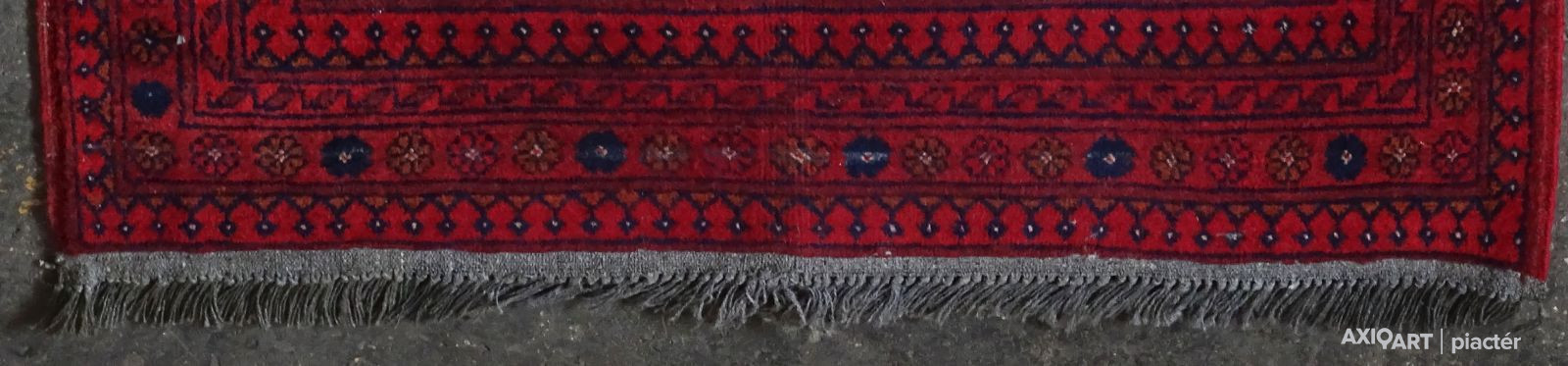 Antik XIX. századi kézi csomózású előszobai szőnyeg. Szép állapotú közepén apró állatmintás sor medalionos, szélén körben keretes díszítéssel. Rövid szürke rojtokkal rendelkezik.