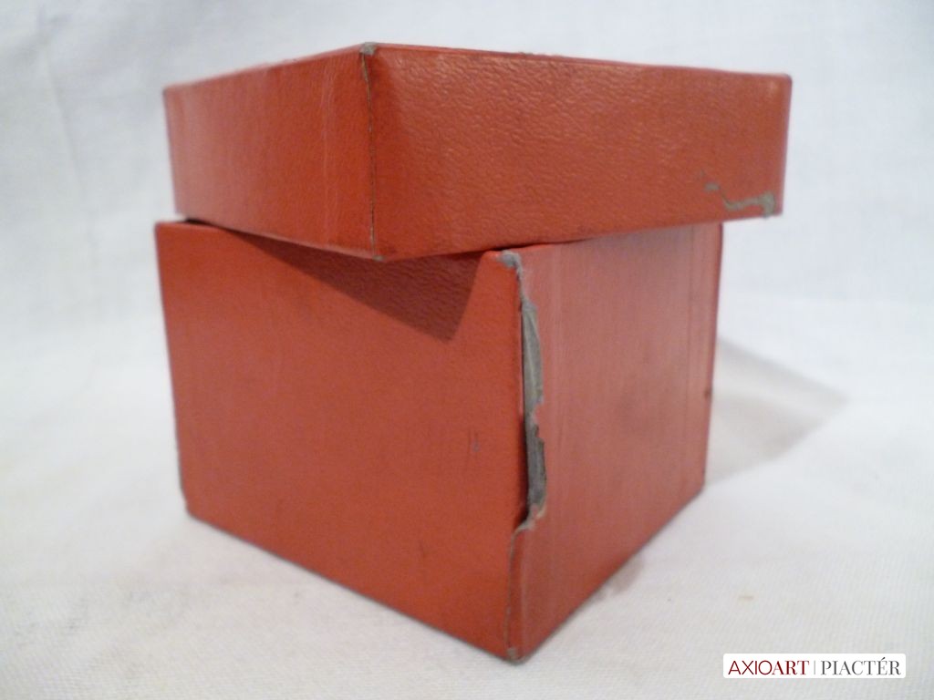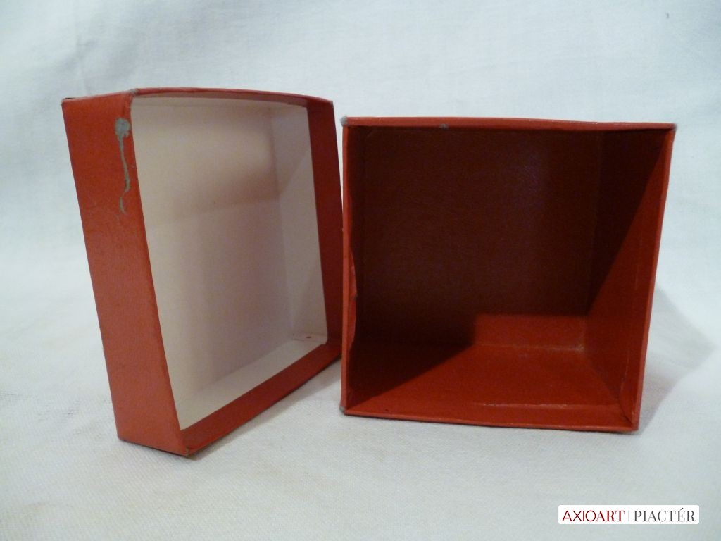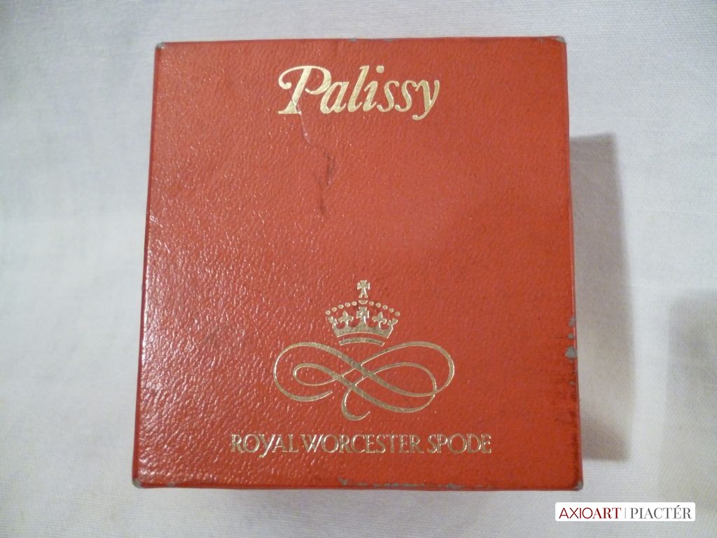 [2065/X013] Antik porcelán tárgy díszdoboza, papírdoboz. Korához képest szép állapotban fennmaradt. Dobozon felirat: PALISSY ROYAL WORCESTER SPODE Magasság: 6.5 cm Szélesség: 8.5 cm Hosszúság: 8.5 cm   A doboz mérete 8,5 x 8,5 x 6,5 cm