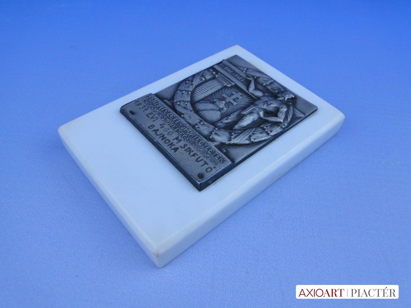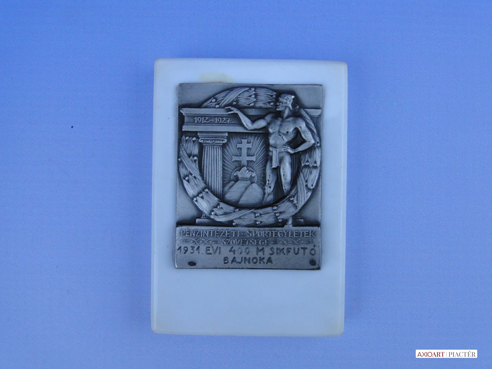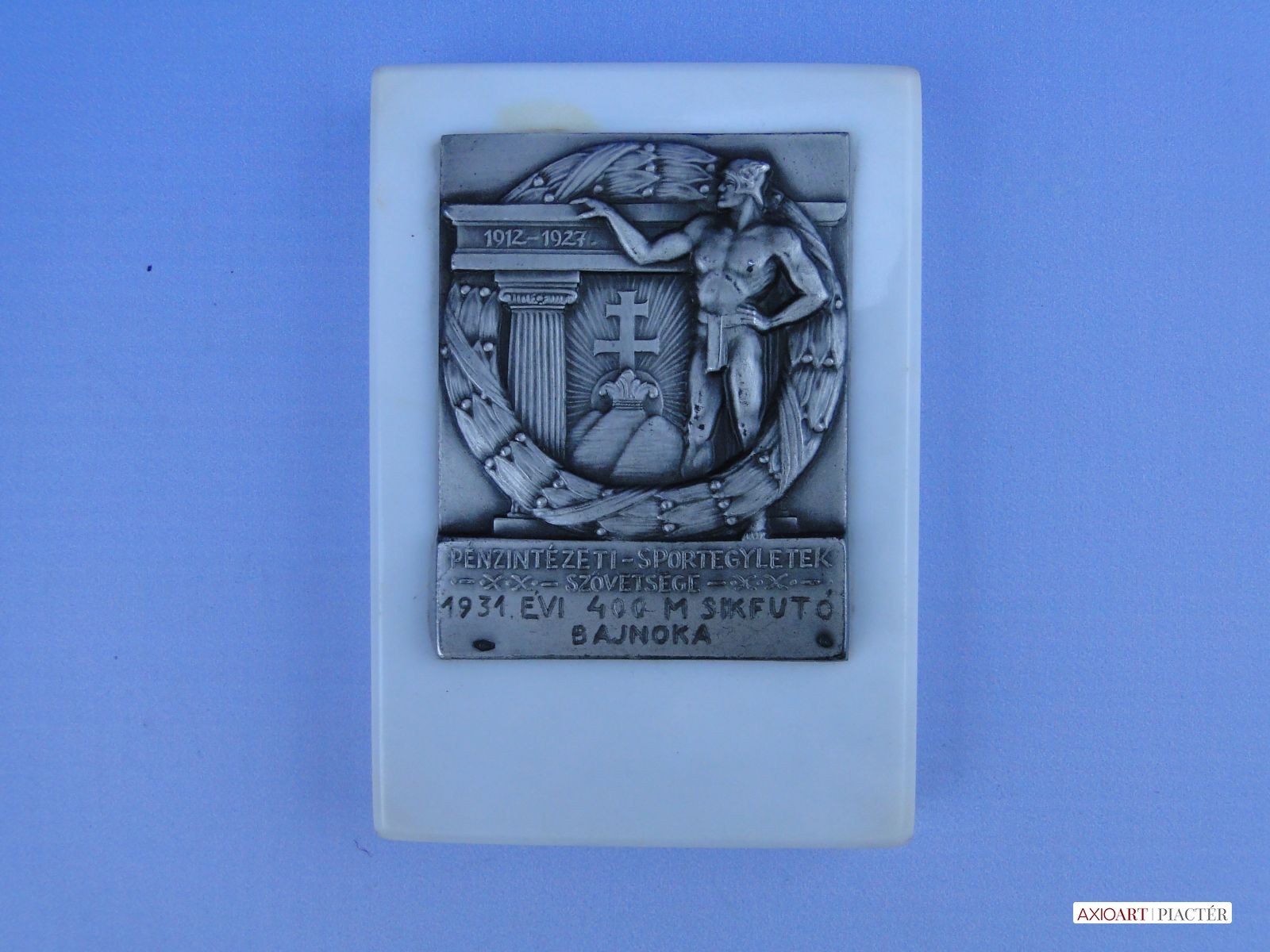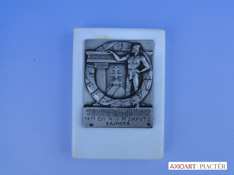 [0D693/X100] Márvány talapzatra illesztett régi jelzett ezüst plakett, sportdíj, korintoszi oszlop mellett álló sportoló, háttérben magyar címer szimbólumai, hármas halom, korona, kettős kereszt. Oszlop felett dátum: 1912 - 1927 Koszorú alatt felirat: PÉNZINTÉZETI SPORTEGYLETEK SZÖVETSÉGE 1931. ÉVI 400 M SÍKFUTÓ BAJNOKA Hátoldalán régi arany papírvignetta, rajta felirat: LUDWIG ÉREMVERŐ BUDAPEST AZ ÖSSZES NAGY EGYESÜLETEK ÉS SZÖVETSÉGEK SZÁLLÍTÓJA A plakett jobb és bal alsó sarkában egy-egy beütött jelzés található. Jobbra lent: LE Balra lent: Ezüst jelzés Királyvízzel tesztelve. Szélesség: 6 cm Hosszúság: 8.5 cm Súly: 0.155 kg