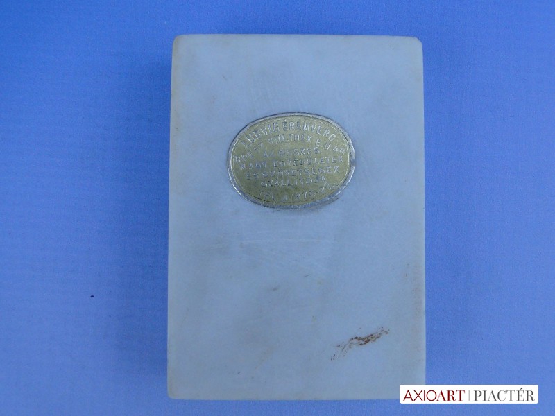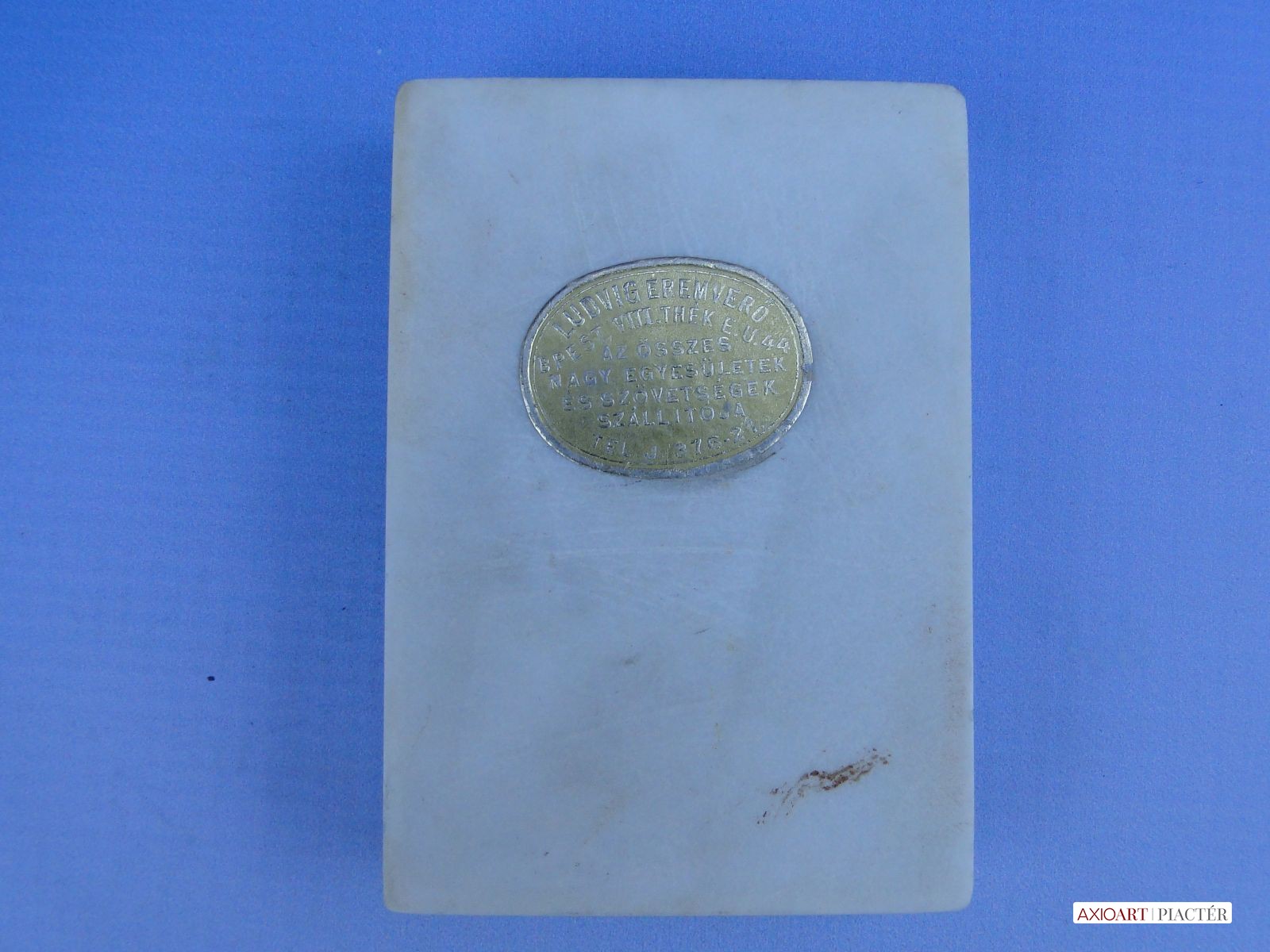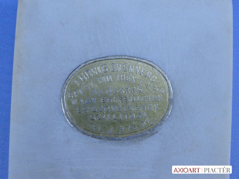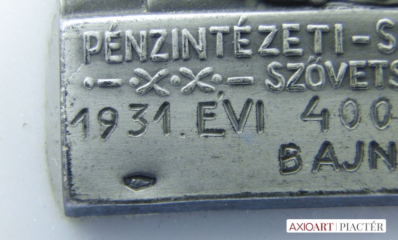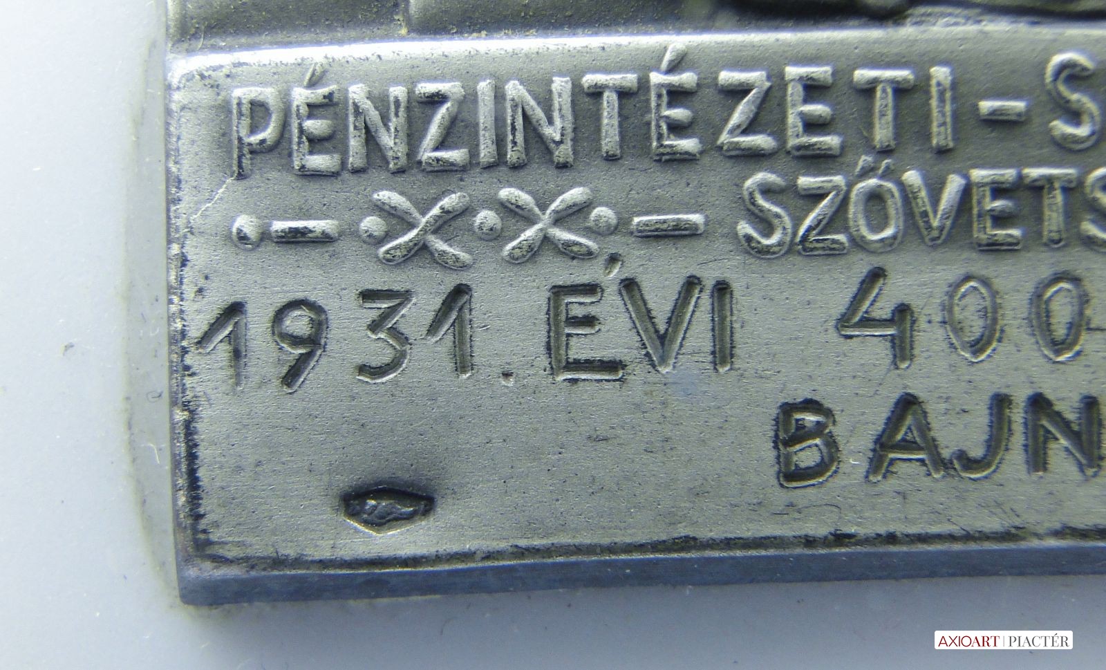 [0D693/X100] Márvány talapzatra illesztett régi jelzett ezüst plakett, sportdíj, korintoszi oszlop mellett álló sportoló, háttérben magyar címer szimbólumai, hármas halom, korona, kettős kereszt. Oszlop felett dátum: 1912 - 1927 Koszorú alatt felirat: PÉNZINTÉZETI SPORTEGYLETEK SZÖVETSÉGE 1931. ÉVI 400 M SÍKFUTÓ BAJNOKA Hátoldalán régi arany papírvignetta, rajta felirat: LUDWIG ÉREMVERŐ BUDAPEST AZ ÖSSZES NAGY EGYESÜLETEK ÉS SZÖVETSÉGEK SZÁLLÍTÓJA A plakett jobb és bal alsó sarkában egy-egy beütött jelzés található. Jobbra lent: LE Balra lent: Ezüst jelzés Királyvízzel tesztelve. Szélesség: 6 cm Hosszúság: 8.5 cm Súly: 0.155 kg