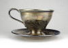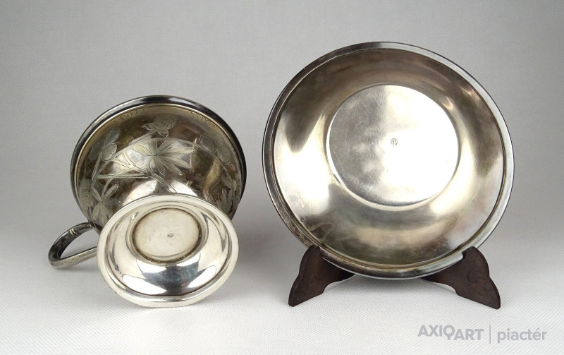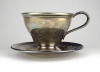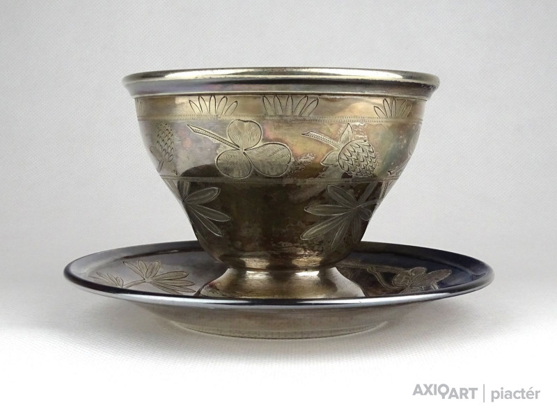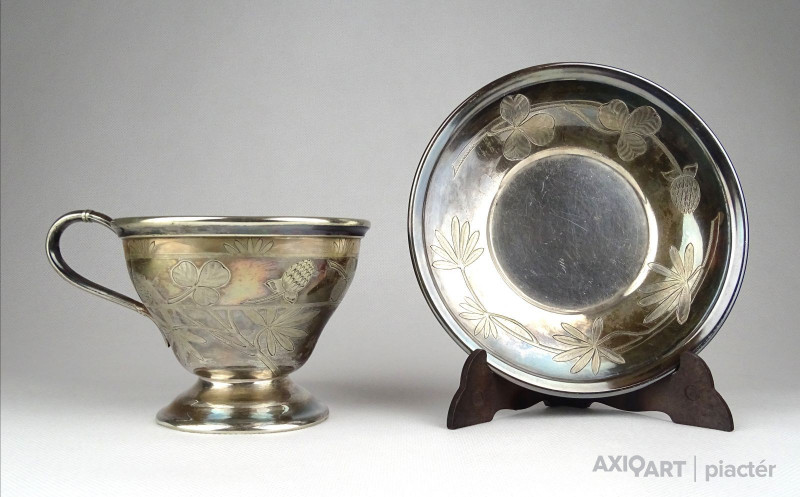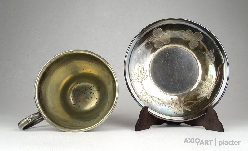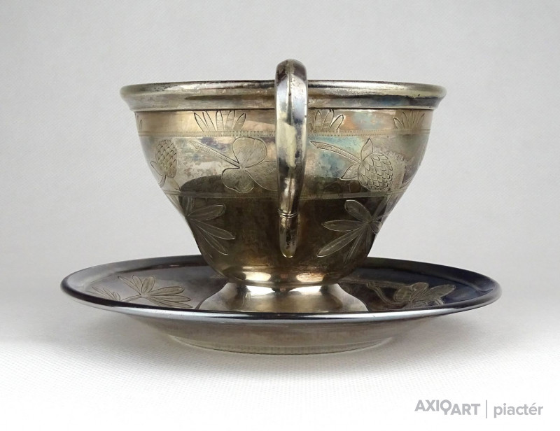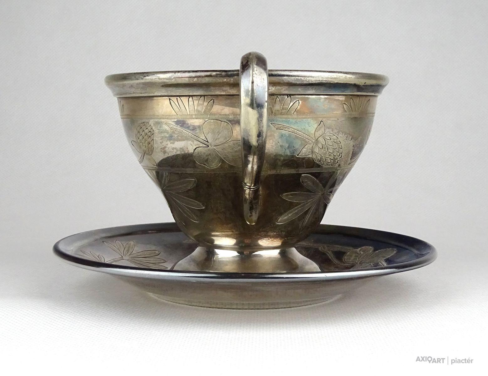 Antik, szép állapotú, jelzett, ezüstözött Szandrik alpakka teáscsésze és hozzá való alátét tányér.
