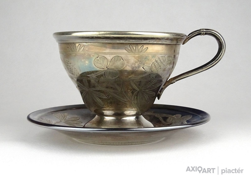 [1C229/X235] Antik, szép állapotú, jelzett, ezüstözött Szandrik alpakka teáscsésze és hozzá való alátét tányér. Alján márkajelzés: SZANDRIK A.E. Súly: 0.305 kg A 20. század elején gyárak is készítettek fém- és ötvöstárgyakat. Az 1896-ban alapított Szandrik Rt. ezüstgyár Alsóhámorban működött; rendszeresen szerepelt modern ízlésű termékeivel az iparművészeti kiállításokon (1900-ban Párizsban ezüstérmet nyert). A másik ismert üzem a Bachruch-gyár volt; ugyancsak tálakat, edényeket készített, konzervatívabb szellemben, mint a már szecessziós ízlésű Szandrik-gyár.   Forrás: http://mek.oszk.hu