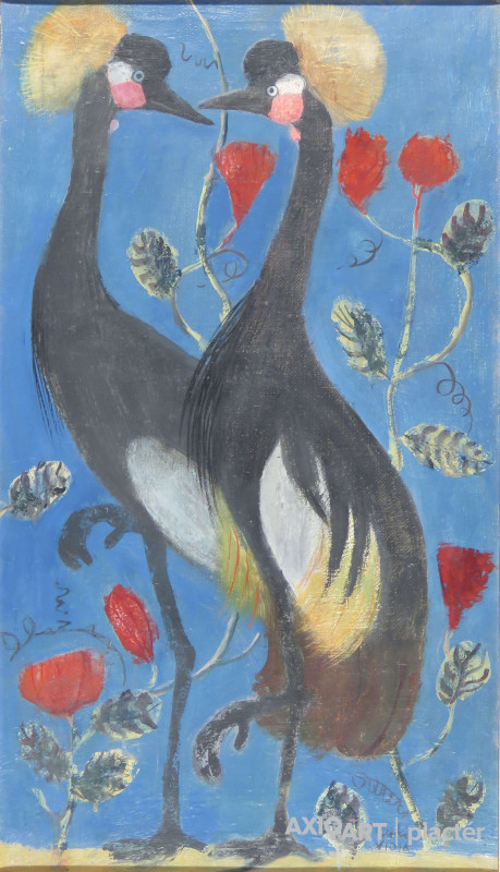 [FKD047/Bp110/7] A kép mérete: 85 x 100 cm keret nélkül. Készült: Olaj, Vászon A kép Szántó Piroska (Kiskunfélegyháza, 1913, Budapest, 1998) alkotása. Jelezve jobbra lent "Szántó Piroska 85" A festmény jó állapotban van. Keret: Ép A festmény hátoldalán autográf írásmaradványok láthatók a képpel kapcsolatban. Magyar festők és grafikusok életrajzi lexikona I-II. Festő, grafikus, gobelinművész. Budapesten az Iparművészeti Főiskolán 1931-ben kezdte tanulmányait, majd egy év után átiratkozott a Képzőművészeti Főiskolára, Szőnyi István osztályába, ahonnan baloldali politikai tevékenysége miatt kizárták. Ezután Rázsó Klára magániskolájában Vaszary János tanfolyamait látogatta. Több nyugat-európai országban járt tanulmányúton, többek között Itáliában is, ahol számos vázlatot készített későbbi képeihez. Hazai és külföldi kiállításokon szerepelt. A II. Világháború előtt az UME és a Szinyei Társaság tárlatain mutatta be műveit. Legelőször festményekkel jelentkezett a Szinyei Fiatalok Tárlatán, huszonkét éves korában. Első önálló kiállítását az Európai Iskolában rendezte 1946-ban. 1934-ben belépett a Szocialista Képzőművészek Csoportjába, majd csatlakozott annak 1939-1940 táján megalakult jogutódjához, a Szocialista Képzőművészek Társaságához. 1937-ben Szentendrére ment Bálint Endre hívására, ahol a Korniss Dezső és Vajda Lajos körül csoportosuló fiatalok köréhez csatlakozott. Ettől kezdve haláláig a szentendrei művészélet szereplője volt. 1945-1948 között az Európai Iskola tagja volt. Korai tájábrázolásait és figurális kompozícióit, rajzait későbbi munkásságában is fel-feltűnő expresszív hangvétel jellemzi. Kiválik közülük a több változatban is megfestett "Kofahajó" (1939) c. képe, melyen a Szentendréről Pestre menő, vásározó asszonyok monumentálissá növelt alakjait ábrázolja Derkovits képszerkesztési módzserét továbbgondolva. A '40-es évek elejétől Vajda késői szürrealista műveinek hatására találta meg képi gondolkozásának egyik ciklikusan visszatérő arculatát, a szürrealisztikus, antropomorfizált növény- és állatábrázolásokat. Az 1950-es években Arany, Karinthy, Apollinaire, Villon, Boccaccio, Shakespeare, Kipling, Krúdy, Radnóti, stb. műveinek illusztrálása jelentett megélhetést a művész számára. 1956 eseményeit nyers riportrajzokban örökítette meg. Az '50-es évek második felében új stiláris vonások jelentek meg műveiben. A sziporkázó színek testes, fekete vonalak konstrukcióiba kényszerültek. Az e felfogásban készült művek, tárgyi utalásaik ellenére a francia lírai-absztrakció - többek közt - Manessier által képviselt vonulatával mutatnak rokonságot (Holdas kert, 1962). A '60-as évek elején születtek a század eleji aktivisták lendületét idéző, tussal készített, konstruktív tájrajzai. A rohamosan pusztuló népi kultúrával és a tradicionális morális értékek felszámolódásával való szembesülés inspirálta a '60-as évek végétől kezdődően esendő útszéli keresztekről, meggörbült pléhkrisztusokról, máladozó temetői piétákról lapidáris egyszerűséggel festett csoportját (Csonka feszület, 1969; Pléhkrisztus és Mária, 1985). Hasonló élményekben gyökerezik a bajóti asszonyokról a '70-es évek második felében készített, monumentális, a pasztell technikától líraivá szelídült figuráinak sora (Templomablak, 1977). Az 1970-es években indította életpályájának hátralevő idejét átívelő "Szerelmesek" című sorozatát. Jelentős műve a népművészetből inspirált "Falusi corpus" sorozat. Foglalkozott gobelinnel is. Díjak: 1958-ban és 1971-ben Munkácsy-díj; 1973-ban-Érdemes Művész cím; 1983-ban Kossuth-díj; 1988-ban Kiváló Művész kitüntető elismerés; ezüstérem, Certaldo; nívódíj; a Munka Érdemrend arany fokozata; Pro Urbe Budapest kitüntetés; a Magyar Köztársaság Érdemrend polgári tagozatának Középkeresztje. Képviselve van a Magyar Nemzeti Galériában, a Fővárosi Képtárban, a szombathelyi képtárban, a szentendrei Ferenczy Múzeumban és a pécsi Janus Pannonius Múzeumban. (N. K.: Műv. 1963/7, P.K.: Műv. 1966/8, N.K.: Műv. 1970/11, Sz.Gy.-Sz.P., FJ, A.J.: Műv. 1984/7) Magyar festők és grafikusok adattára Az iparművészeti iskolában és a Képzőművészeti Főiskolán kezdte tanulmányait 1931-ben, majd Szőnyi István és Vaszary János szabadiskoláját látogatta, a 30-as évek végétől Szentendrén dolgozott. 1935 óta kiállító művész. A világháború előtt a Szinyei Társaság, az UME tárlatain szerepelt. 1946-ban nyílt meg első önálló tárlata az Európai Iskola keretében, majd Szentendrén (1954, 1974), a Csók István Galériában (1957, 1963), Esztergomban (1958), Kaposvárott (1964), Kiskunfélegyházán és a Műcsarnokban (1970), valamint a Helikon Galériában (1972) állított ki. Gyűjteményes anyagát 1977-ben mutatta be a Műcsarnok. Szerepelt a magyar művészek számos külföldi bemutatóján (Párizs, London). Fő művei könnyed rajzú szimbolikus jellegű kompozíciók, amelyeken a növényi organizmus metamorfózisát jeleníti meg. Sorozata a népművészettől inspirált Falusi corpus sorozat. Ismert illusztrátor és készít gobelint is. (Szombathely, Zeneiskola). 1958-ban és 1971-ben Munkácsy-díjat, 1973-ban érdemes művész címet, Kossuth-díjat 1983-ban és kiváló művész kitüntető elismerést 1988-ban kapott. Kiadott írásai: Bálám szamara. Bp. 1982; Golgota. Bp., 1987. 131 darab alkotását 1987-ben a Szombathelyi Képtárnak ajándékozta. - Irod.: Szabó György: Szántó Piroska. Bp., 1985. Magyar festők és grafikusok életrajzi lexikona I-II. Műgyűjtők és kereskedők kézikönyve Festő, grafikus, gobelinművész. A budapesti Iparművészeti Főisko
