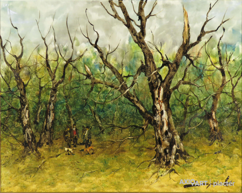 [FKD046/Bp201/40] A kép mérete: 80 x 106 cm keret nélkül. Készült: Olaj, Farostlemez A kép Szegvári Károly (Tószeg, 1920, Budapest, 2002) alkotása. Jelezve jobbra lent "Szegvári K." A festmény jó állapotban van. Keret: Ép Magyar festők és grafikusok életrajzi lexikona I-II. Festő. Tanulmányait Krivátsy Szücs György magániskolájában kezdte. A fővárosi Képzőművészeti Főiskolán Bencze László és Burghardt Rezső növendéke volt. 1942-ben ösztöndíjjal Olaszországba utazott, majd éveken át Párizsban és különböző olasz városokban élt. Külföldi sikerei a Rómában 1968-ban megrendezett egyéni tárlatával kezdődtek, amikor Róma város polgármestere aranyéremmel tüntette ki. 1976-ban a Cziffra György zongoraművész által megvásárolt franciaországi selisi gótikus kápolnájában, amely jelenleg Liszt-Bartók Zenei Művészképzőként működik, megfestette a Chapelle Royale táblaképeit. Számos hazai és külföldi tárlaton szerepelt alkotásaival. Egyéni bemutatók: Csók Galéria, Nyíregyháza, Martfű, Nyírbátor, Pécs, Veszprém, Debrecen, Kisújszállás, stb. Tájképei megörökítik az elhagyott erdőt, a zsombékos mezők, a múltba merülő, pusztuló tanyák világát. Szívesen festett virágcsendéleteket, portrékat, aktokat és falusi népéletképeket is. Megfestette Puskás Öcsi, Simándy József, stb. arcképét. "Terra di Madre" című alkotásával I. díjat nyert Fermoban, 2000-ben köztársasági aranyérmet kapott. Munkái helyet kaptak a Petőfi Irodalmi Múzeumban, a debreceni Déri Múzeumban, Rómában a M. Vaticanoban, a londoni National Galeryben és a brüsszeli Royaux Múzeumban. (LÁ, MFGA) Magyar festők és grafikusok adattára Művészeti tanulmányait Krivátsy Szűcs György magániskolájában kezdte, majd a Képzőművészeti Főiskolán fejezte be, ahol Bencze László és Burghardt Rezső növendéke volt. Hosszú időn keresztül élt Párizsban és különböző olasz városokban. Külföldi sikerei a Rómában 1968-ban megrendezet önálló kiállításával kezdődtek, amikor művészetéért Róma polgármestere aranyéremmel tüntette ki. Cziffra György, a világhírű zongoraművész megvásárolta a francia királyok Senlis-i gótikus kápolnáját, amelyet átalakíttatott Liszt-Bartók zenei művészképzővé. E művészképző részére 1977-ben Szegvárit bízta meg egy hatalmas táblakép, triptichon megfestésével. Számos hazai és külföldi kiállításon szerepelt. Önálló tárlata volt Bécsben, Prágában, Bukarestben, Sokolovban, Fellbachban (NSZK 1986). Tájképei megörökítik az elhagyott erdők, a zsombékos mezők, a múltba merülő, pusztuló tanyák világát. Szívesen fest virágcsöndéleteket, portrékat, aktokat is. Hatalmas gyűjteménnyel rendelkezik, amelynek féltett darabja egy Lotz Károly emlékalbum 143 művész aláírásával. Hortobágyon magánmúzeumot rendezett be. - Irod.: Szombathy Viktor: Festőművész, erdők szerelmese. Turista, 1976. feb. 10.; Tóth Ervin: A kiérlelt látomás. Szegvári Károly kiállításáról. Kelet-Magyarország. 1979. okt. 11.; Bakó Endre: Tószegtől Párizsig. Hajdú-Bihari Napló. 1980. márc. 11. Magyar festők és grafikusok életrajzi lexikona I-II. Műgyűjtők és kereskedők kézikönyve Festő. Tanulmányait Krivátsy Szücs György magániskolájában kezdte. A fővárosi Képzőművészeti Főiskolán Bencze László és Burghardt Rezső tanítványa volt. Éveken keresztül Párizsban és különböző olasz városokban élt. Külföldi sikerei a Rómában 1968-ban megrendezett egyéni tárlatával kezdődtek, amikor Róma polgármestere aranyéremmel tüntette ki. A Cziffra György által megvásárolt Senlis-i gótikus kápolnában, amely Liszt-Bartók Zenei Művészképzőként működik, egy triptichont festett. Számos hazai és külföldi tárlaton szerepelt alkotásaival. Tájképei megörökítik az elhagyott erdőt, a zsombékos mezők, a múltba merülő, pusztuló tanyák világát. Szívesen festett virágcsendéleteket, portrékat, aktokat is. (MFGA) Művészeti lexikon I-IV. A Képzőművészeti Főiskolán Burghardt Rezső volt a mestere. Széles ecsetkezelésű, hangulatos tájképeivel rendszeresen szerepel kiállításokon. 1955-ben a Csók Galériában gyűjt. kiállításon mutatta be festményeit. Művész életrajzok kortárs magyar képzőművészek Krivátsy Szűcs György magániskolájában kezdte, majd a Képzőművészeti Főiskolán folytatta tanulmányait Burghardt Rezső mellett. 1943-ban többedmagával ösztöndíjat kapott Firenzében, de a háborús viszonyok miatt már nem vehette igénybe. Számos hazai és külföldi kiállításon szerepelt. Önálló tárlata volt Bécsben, Prágában, Bukarestben, Sokolovban, Budapesten a Csók Galériában, és Veszprémben. Rómában 1968-ban rendezett önálló kiállítást, ahol Róma polgármestere aranyéremmel tüntette ki. - 1977-ben Cziffra György őt bízta meg a Liszt-Bartók zenei művészképzővé alakított Senlis-i kápolna, a francia királyok kápolnájának kifestésével. Ugyanott önálló kiállítást is rendezett. Világa a természeté: az erdők öreg fái, az omladozó tanyák világa képein mélységes emberi fájdalmak hordozói. Egy letűnő világot forrósít át a lélek melegével és egyéni stílussal.