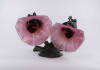 Antik szecessziós ívelt bronz kétágú falikar, lámpa, falra akasztható lámpa, világítás, rózsaszín virágszirom szerű, festett üveg búrával. A búrák dőlésszöge állítható. A falikar vezetékezése felújított, de kipróbálva nem volt.