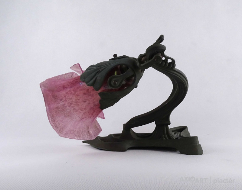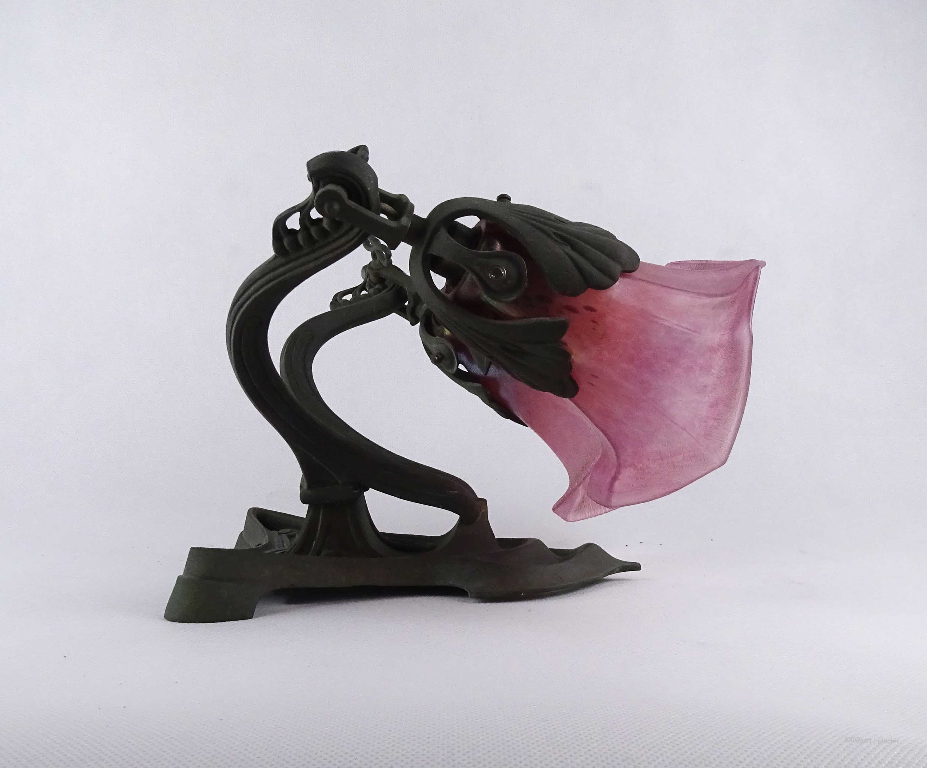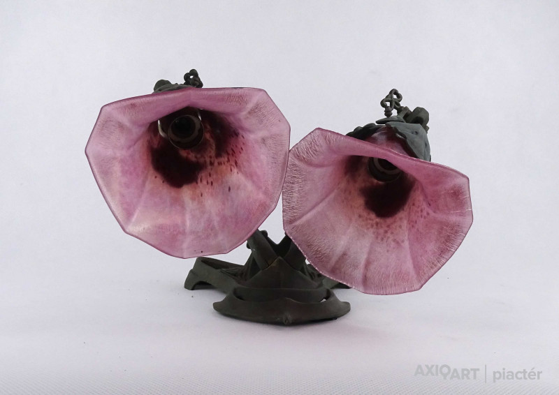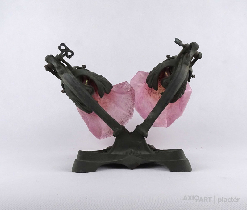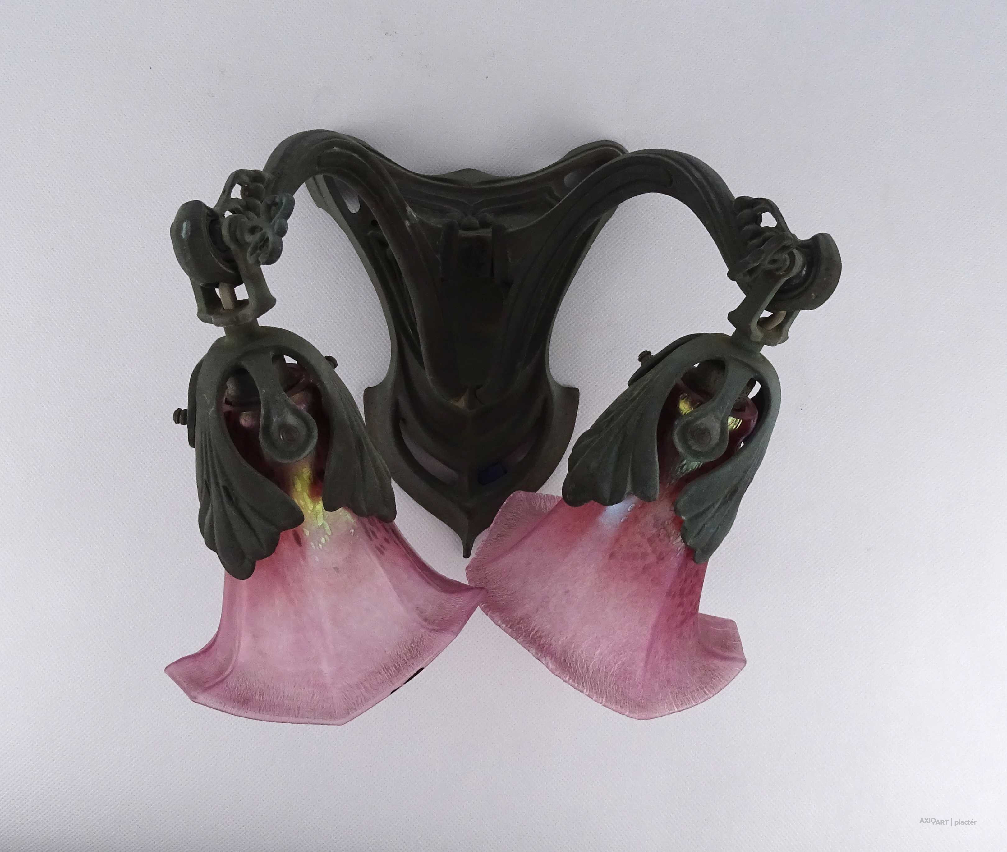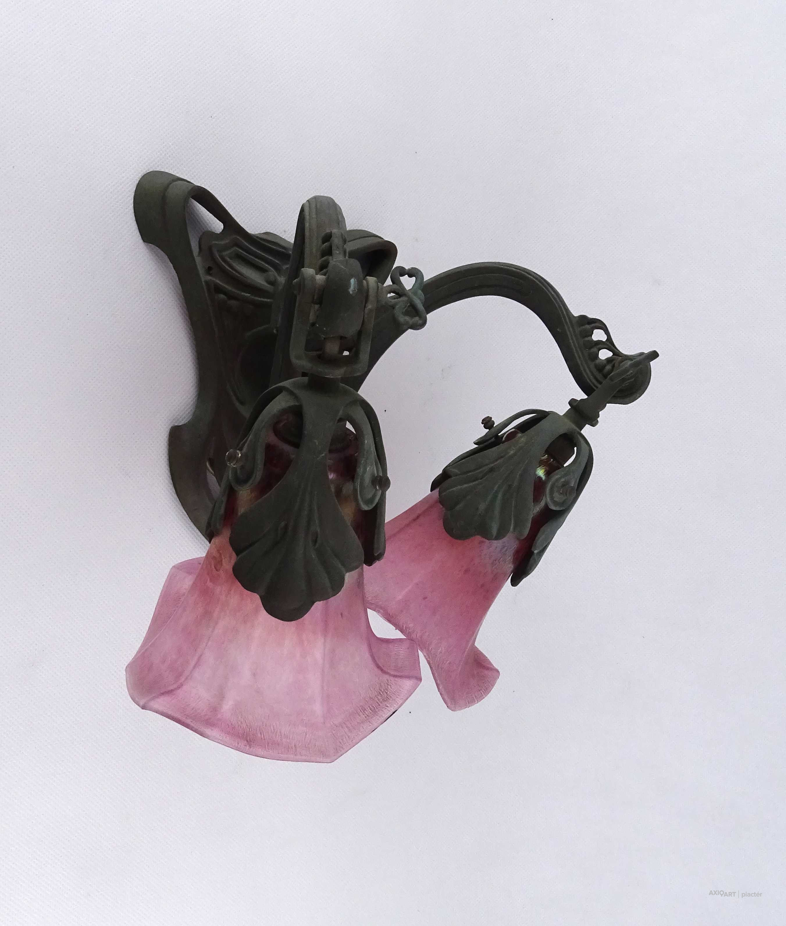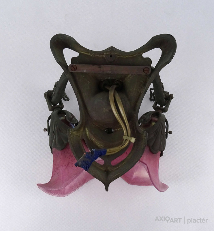 Antik szecessziós bronz kétágú falikar rózsaszín üvegbúrával