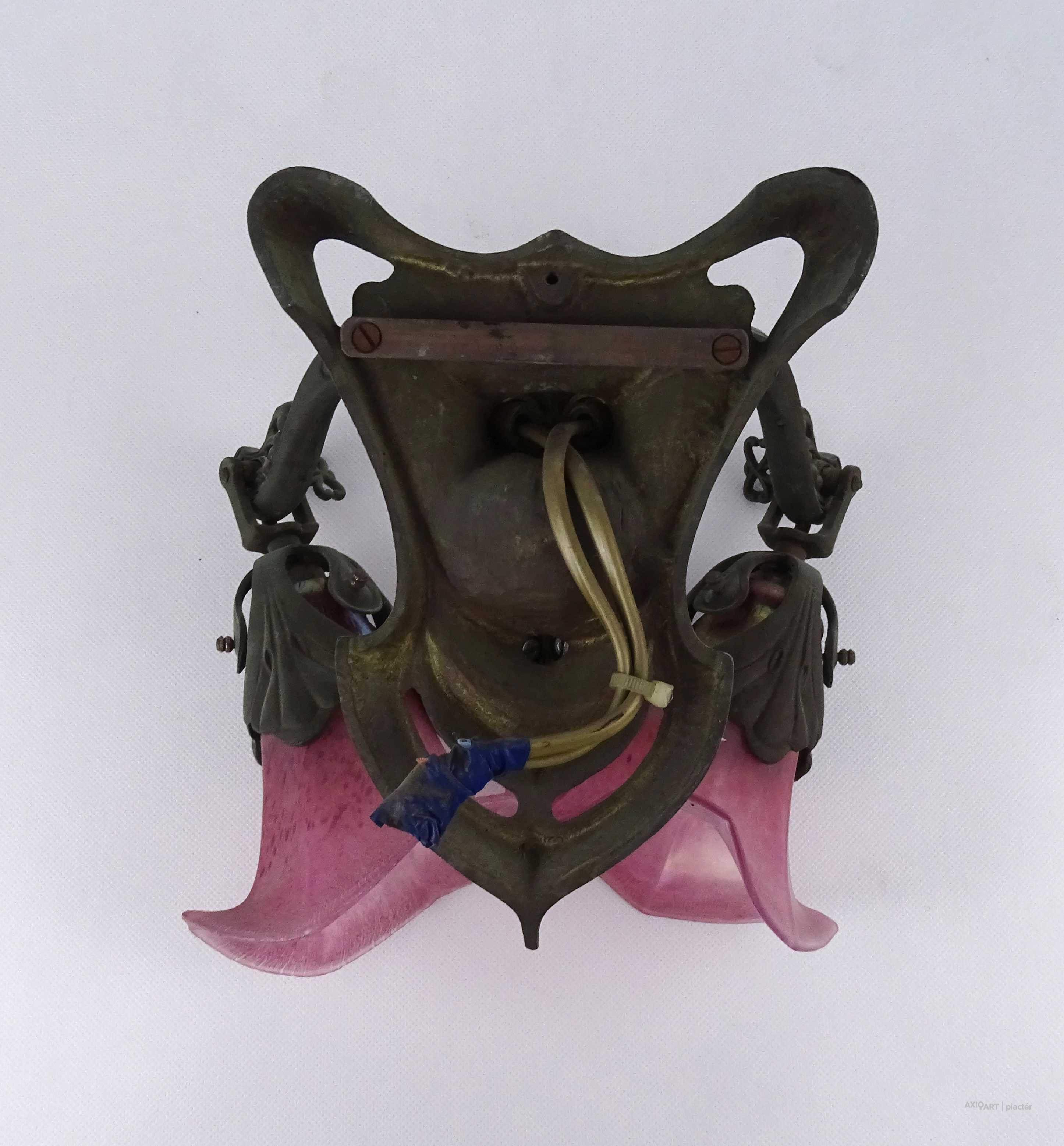 [1V919/X311] Antik szecessziós ívelt bronz kétágú falikar, lámpa, falra akasztható lámpa, világítás, rózsaszín virágszirom szerű, festett üveg búrával. A búrák dőlésszöge állítható. A falikar vezetékezése felújított, de kipróbálva nem volt. Magasság: 25 cm Szélesség: 25 cm Súly: 2.235 kg