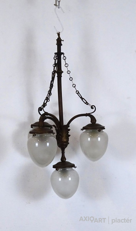 Antik, szép patinás állapotú szecessziós csillár. Négyégős háromkarú csillár. Nagyméretű (E27) izzó való bele. Rajta eredeti csepp alakú opál üveg burák. A csillár az eredeti vászonszigetelésű vezetékével van szerelve. Újravezetékelése szükséges.
