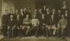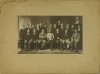 Antik, kartonra ragasztott, fekete-fehér fotográfia, melyen egy 20 fős monarchia korabeli férfiakból álló társaság látható egy szecessziós szalonban fotózva.