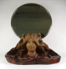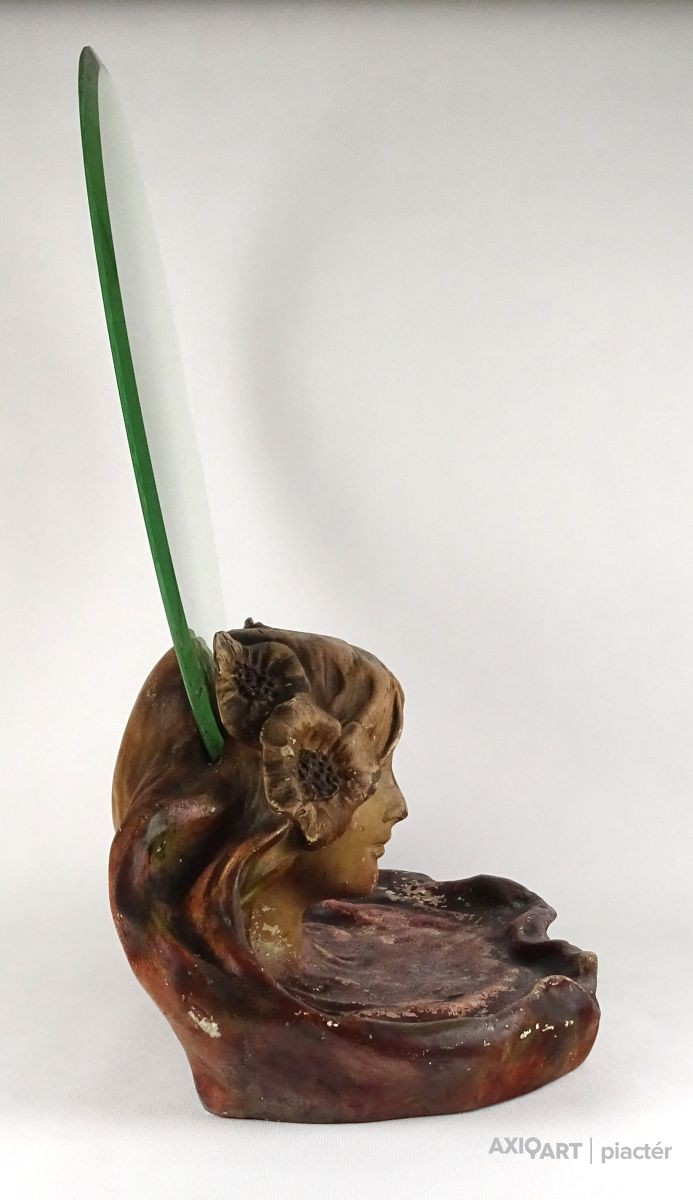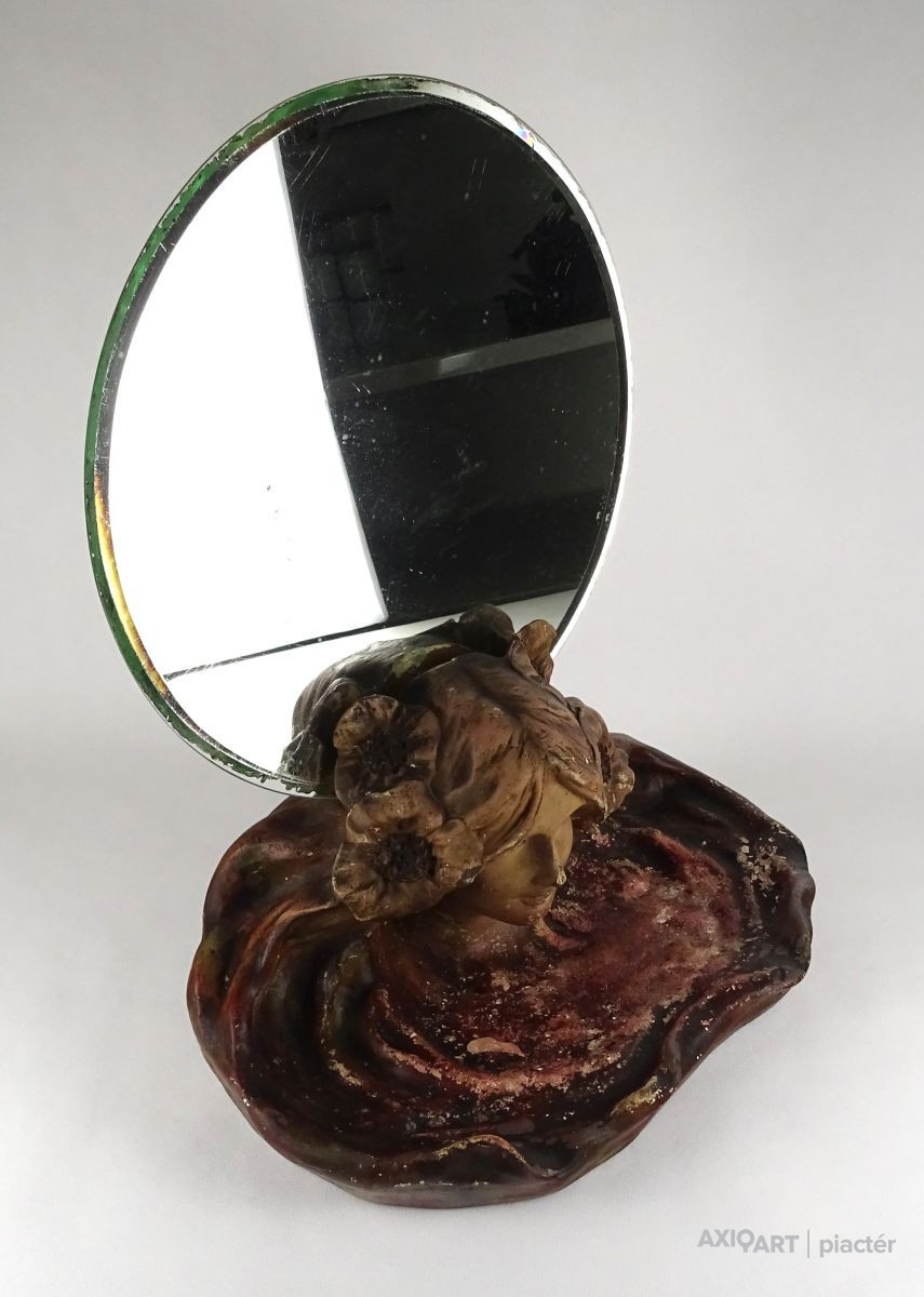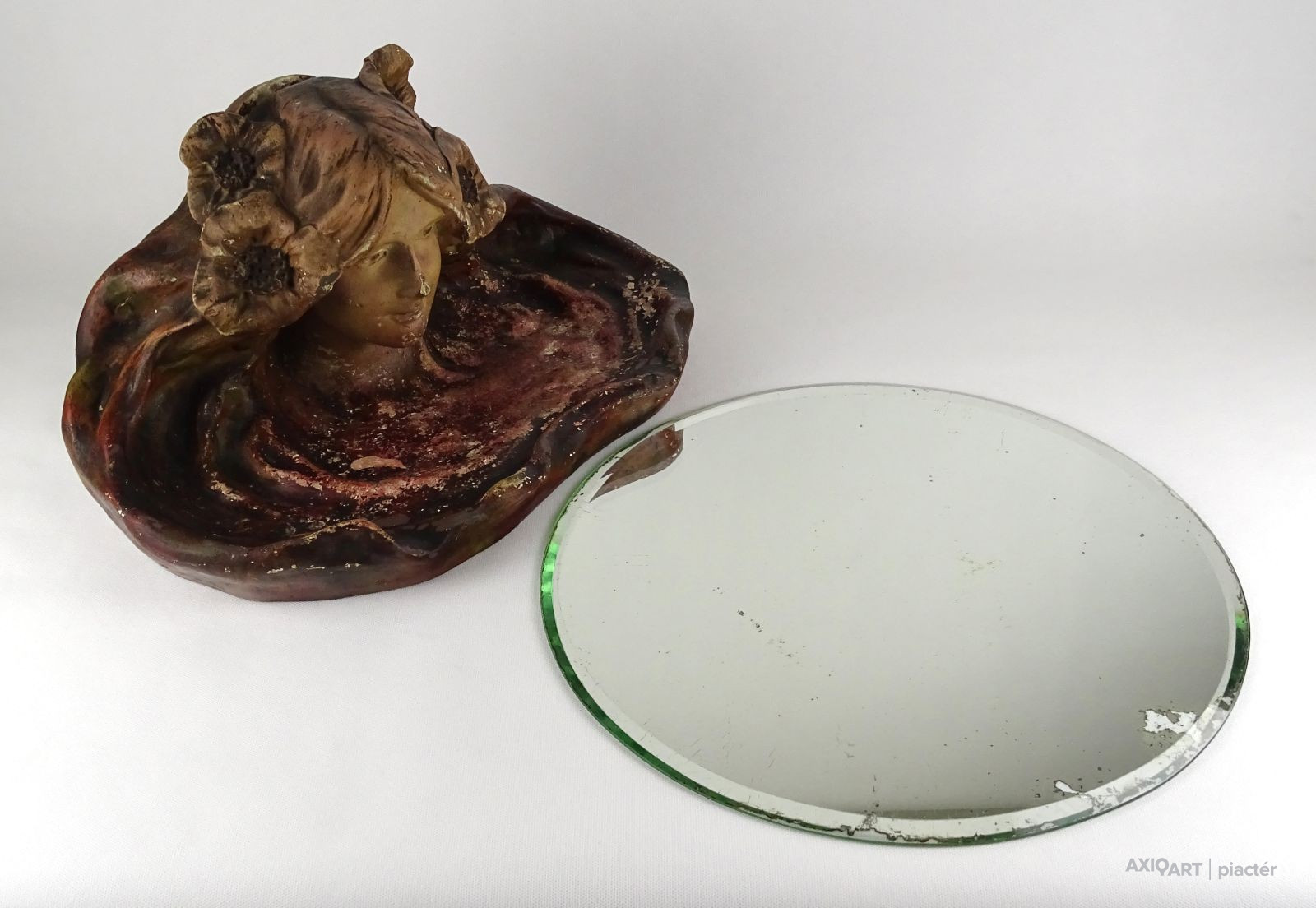 Gyönyörű antik szecessziós női fejjel díszített gipsz ékszertartó, pipere tükör. Rajta kivehető metszett tükör található.