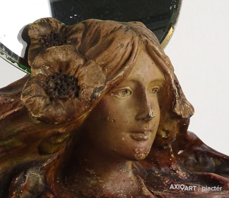 [1L165/X268] Gyönyörű antik szecessziós női fejjel díszített gipsz ékszertartó, pipere tükör. Rajta kivehető metszett tükör található. Magasság: 54 cm Szélesség: 43 cm Súly: 8.65 kg