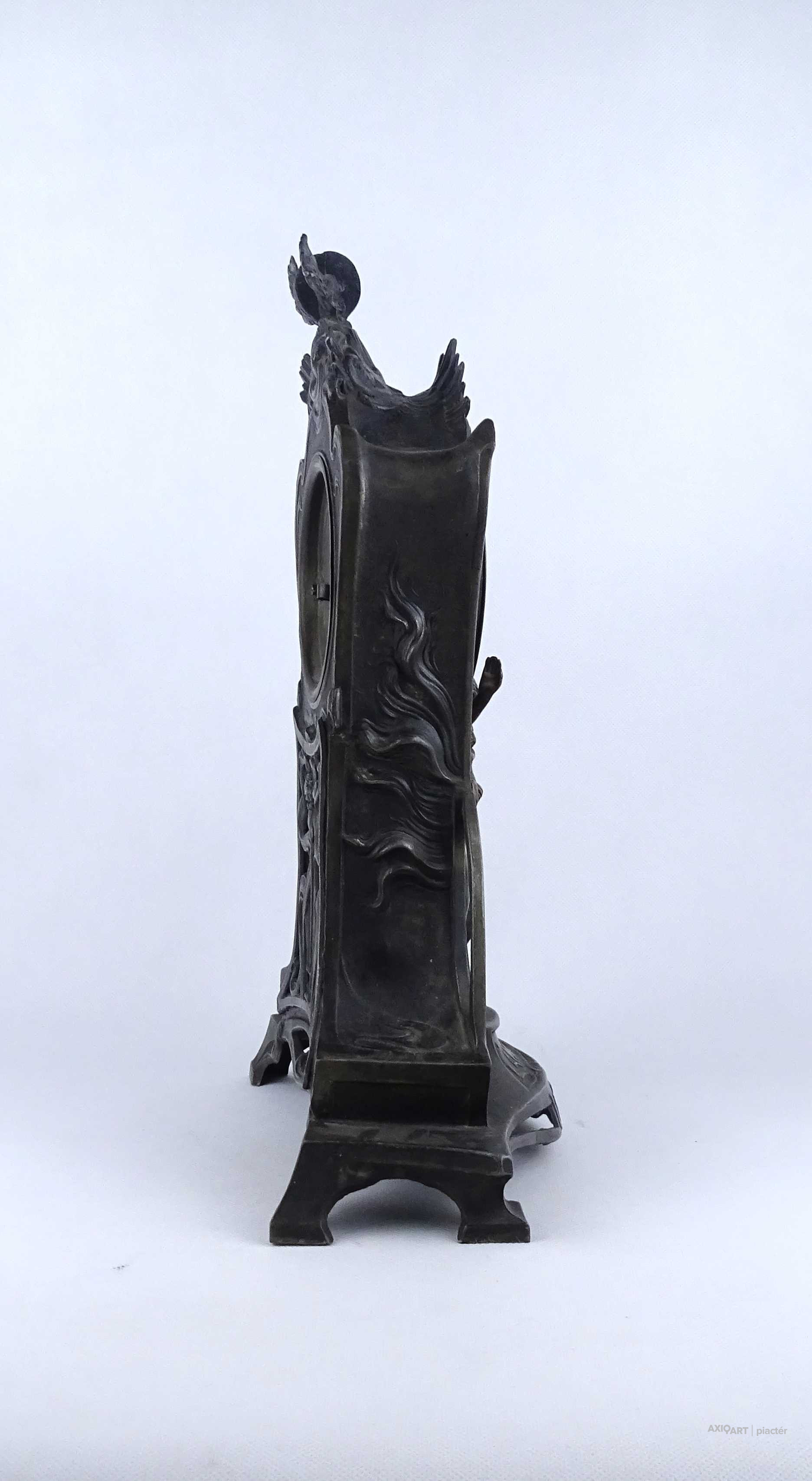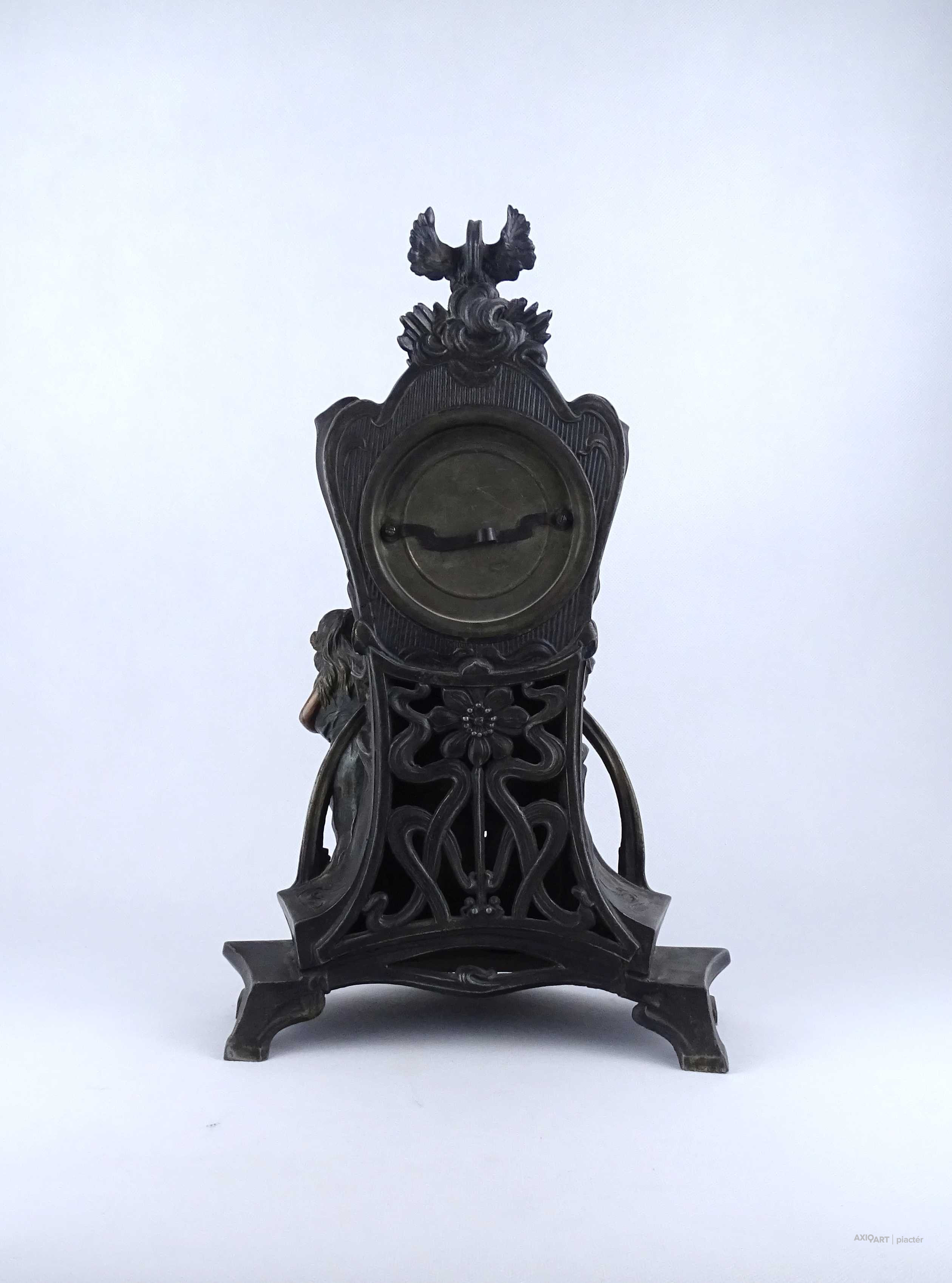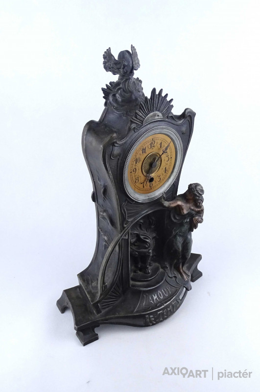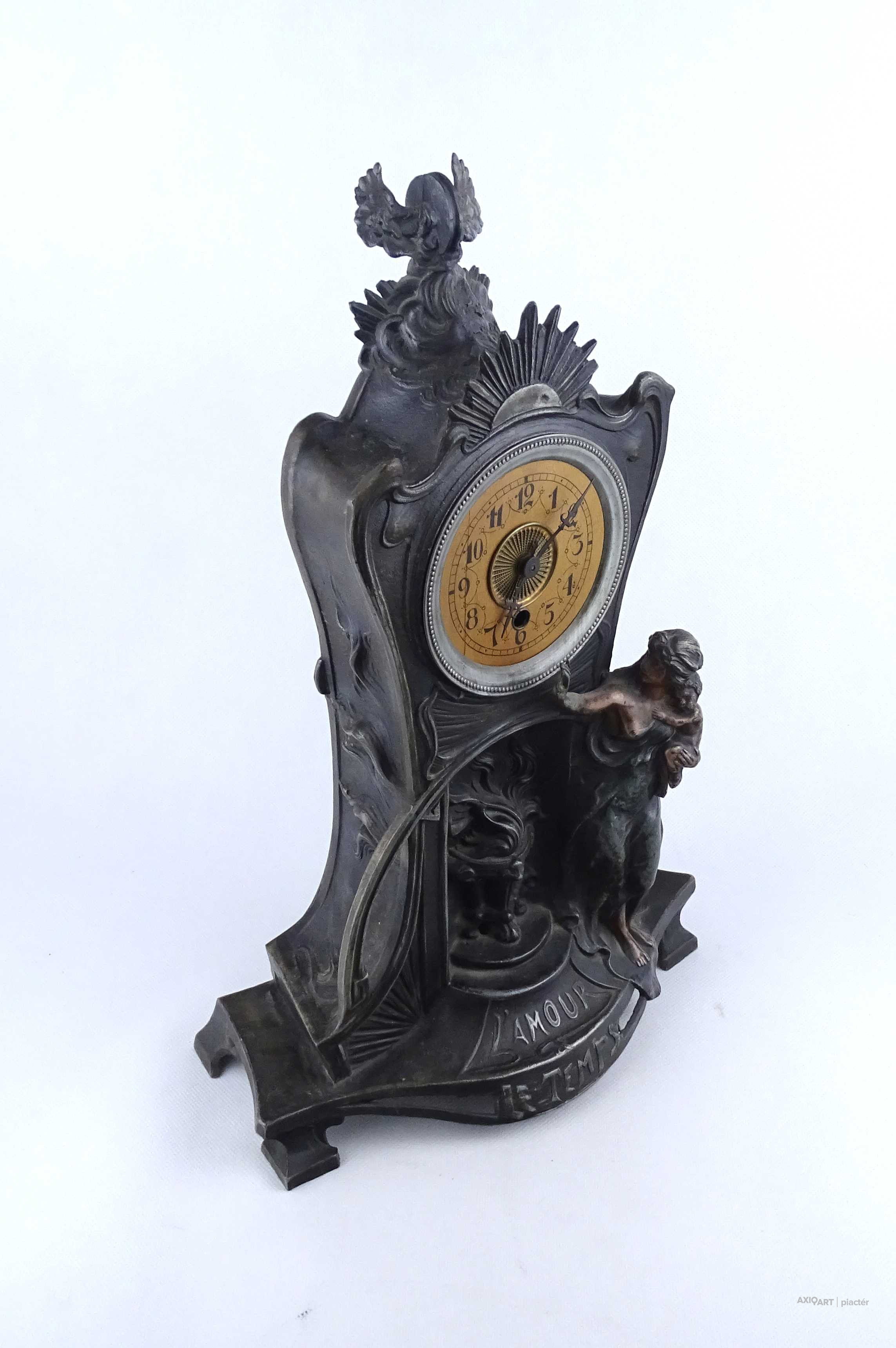 [2A041/Z046] Antik, részben bronzírozott, ón szecessziós kandallóóra. Rajta gyermekét karjában tartó női szoboralak és francia felirat. Benne egy kulcsos réz óraszerkezet, amely jelenleg nem működik. Kulcsa hiányzik. A felirat: L'AMOUR LE TEMPS Magasság: 42.5 cm Szélesség: 28 cm Hosszúság: 14.5 cm Súly: 2.865 kg