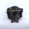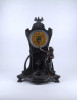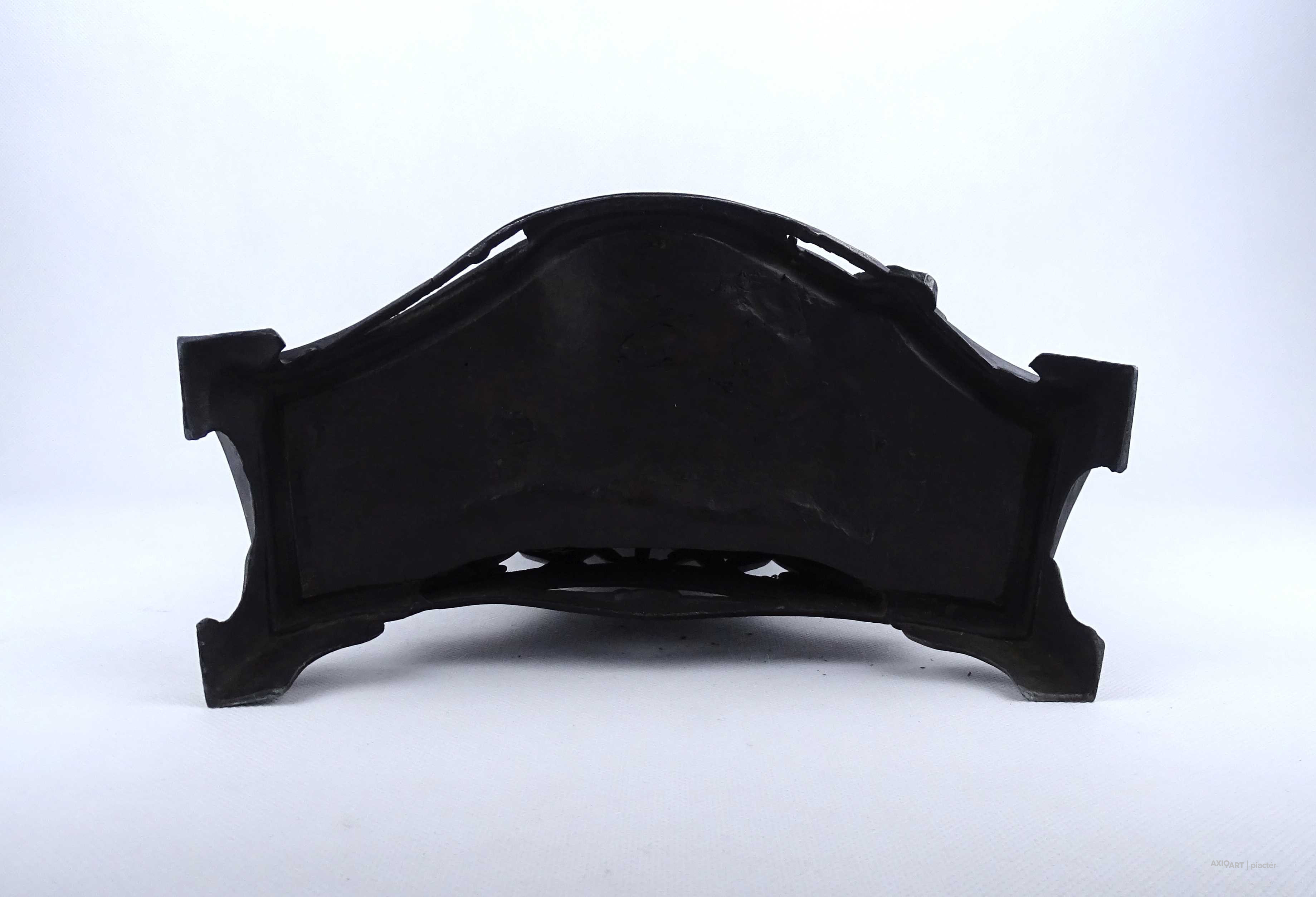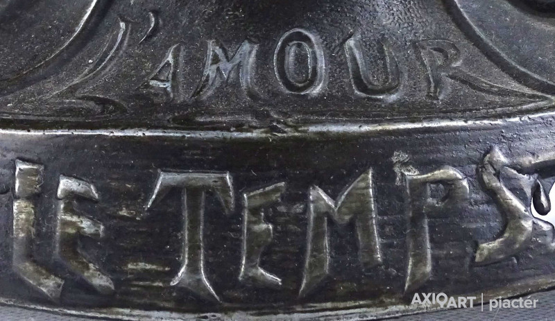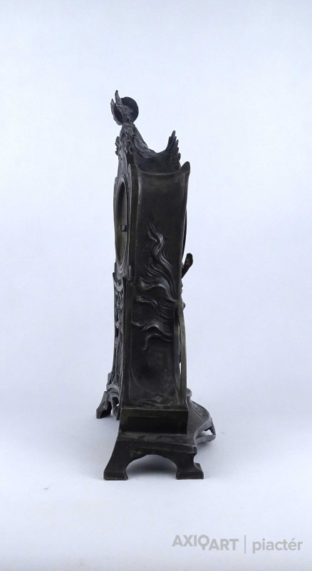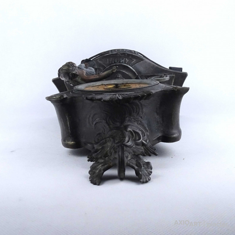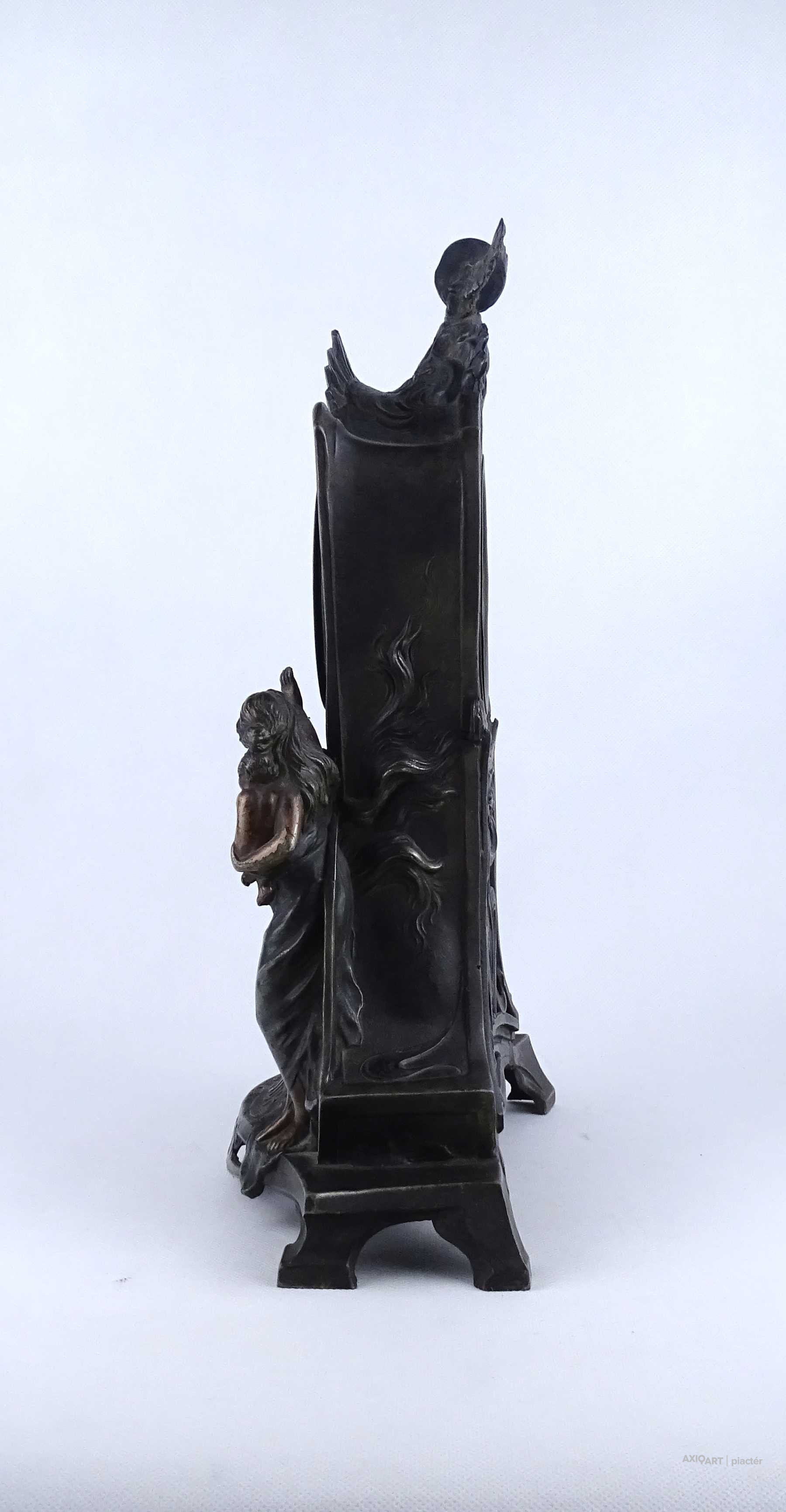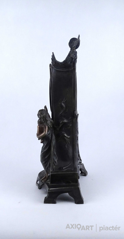 [2A041/Z046] Antik, részben bronzírozott, ón szecessziós kandallóóra. Rajta gyermekét karjában tartó női szoboralak és francia felirat. Benne egy kulcsos réz óraszerkezet, amely jelenleg nem működik. Kulcsa hiányzik. A felirat: L'AMOUR LE TEMPS Magasság: 42.5 cm Szélesség: 28 cm Hosszúság: 14.5 cm Súly: 2.865 kg