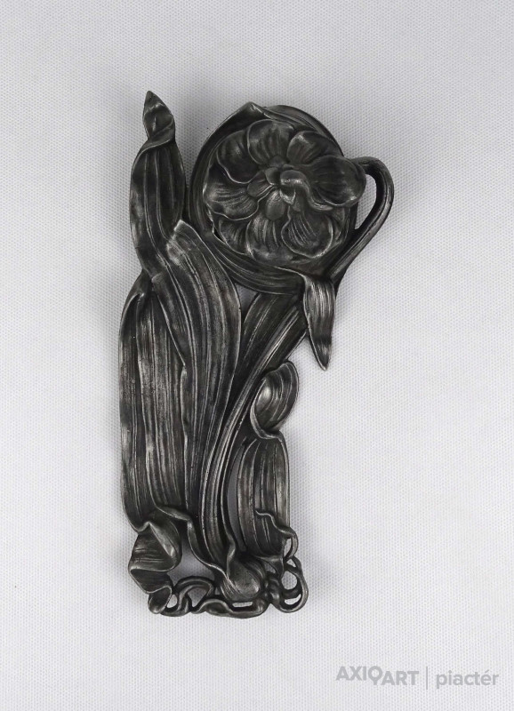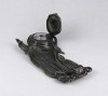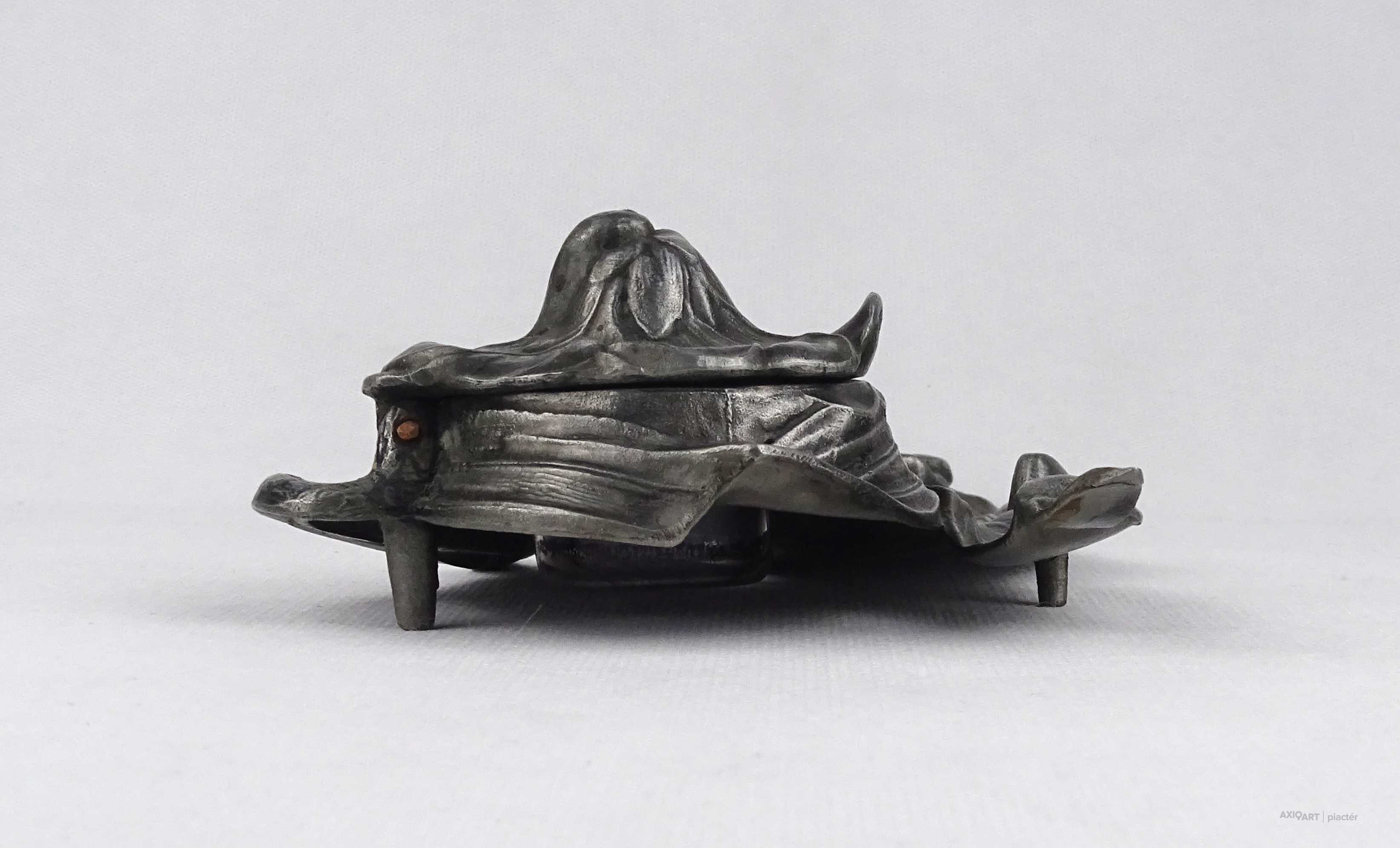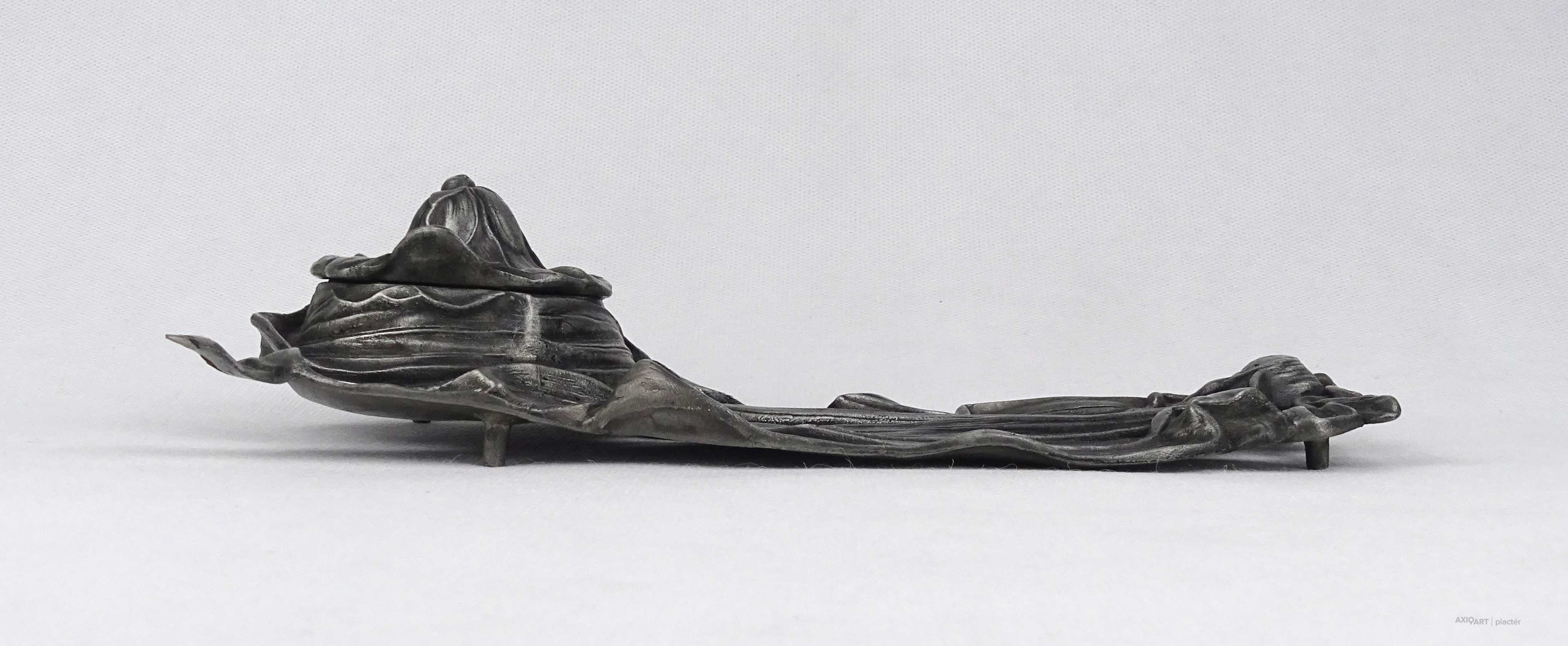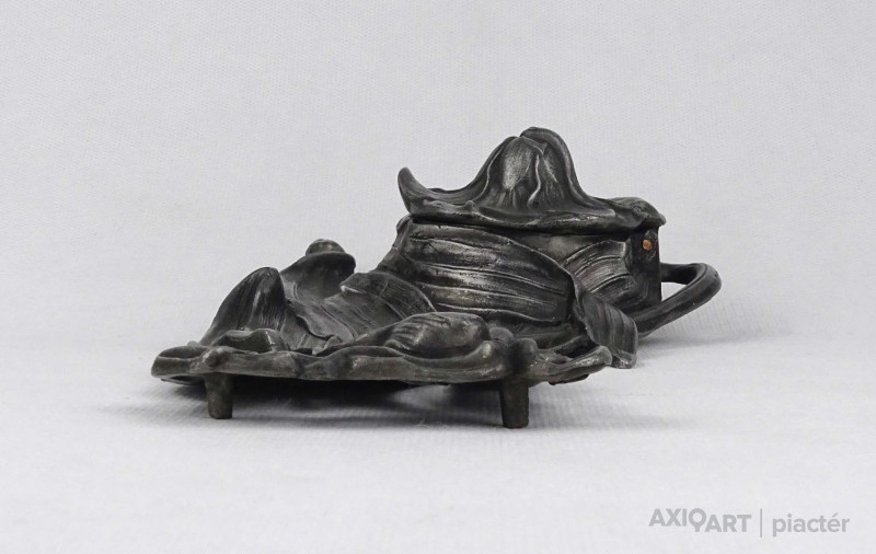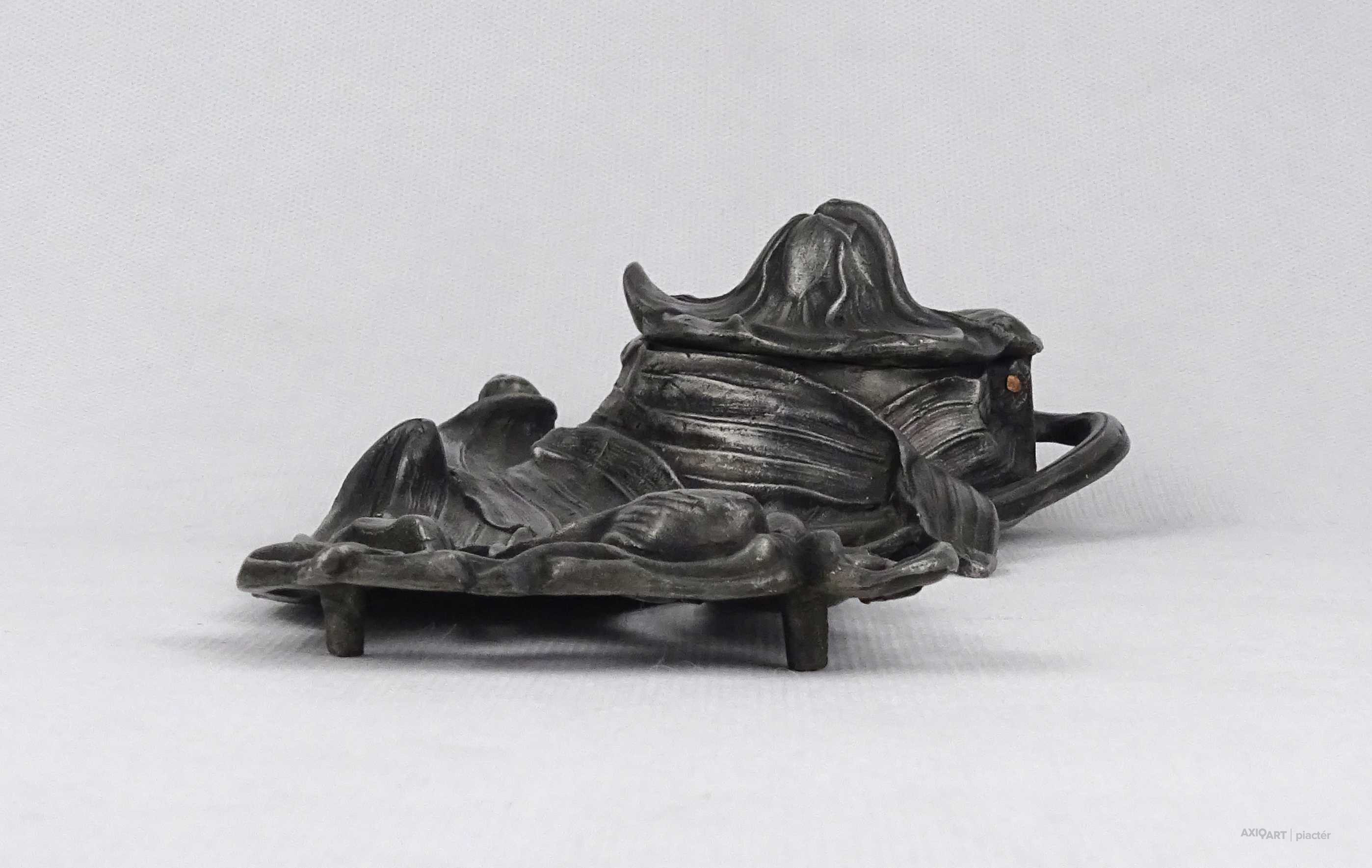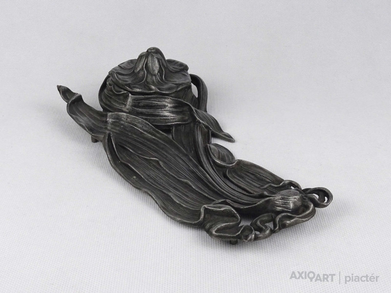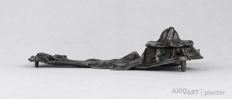[1U492/Z058] Antik, szecessziós ón tintatartó, kalamáris plasztikus, virágot formázó kialakítással. Vékonyfalú, fújtüveg tintástégellyel. Magasság: 5.5 cm Szélesség: 12.5 cm Hosszúság: 23 cm Súly: 0.52 kg