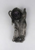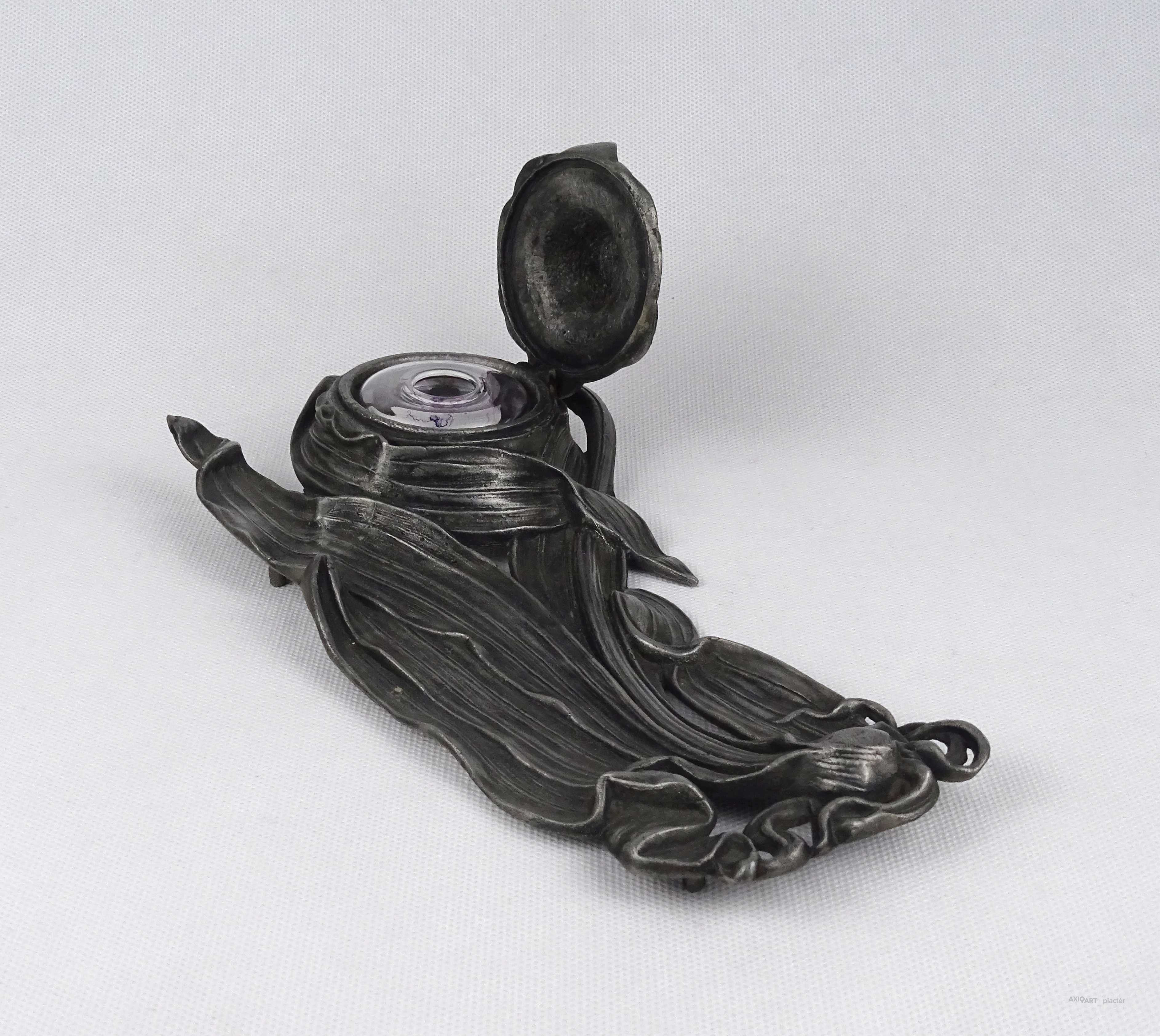 Antik, szecessziós ón tintatartó, kalamáris plasztikus, virágot formázó kialakítással. Vékonyfalú, fújtüveg tintástégellyel.