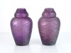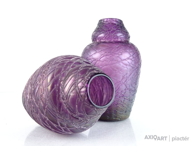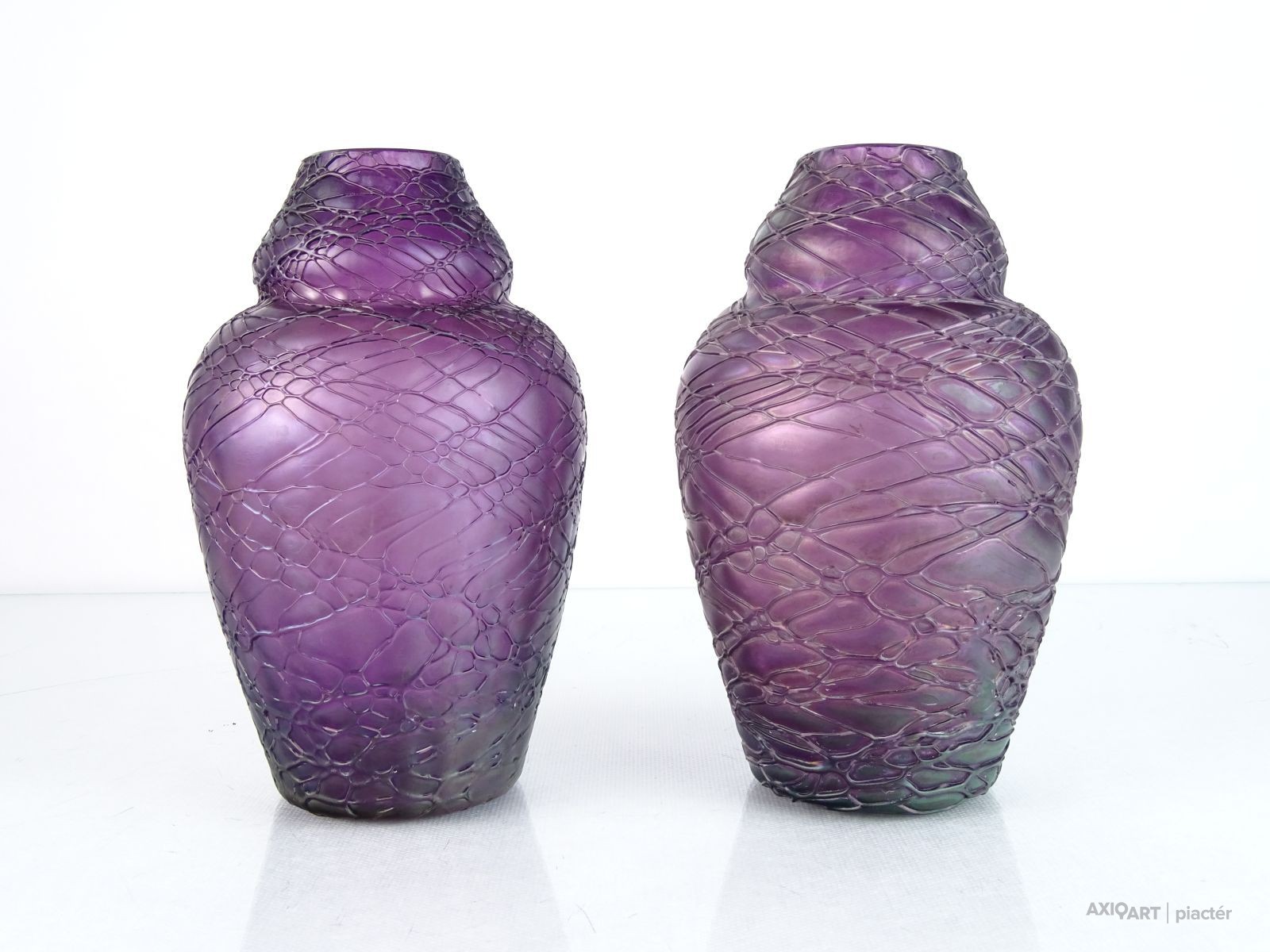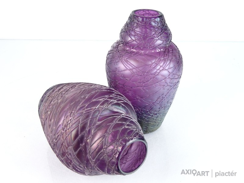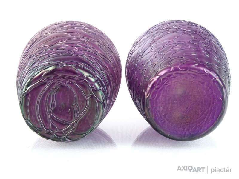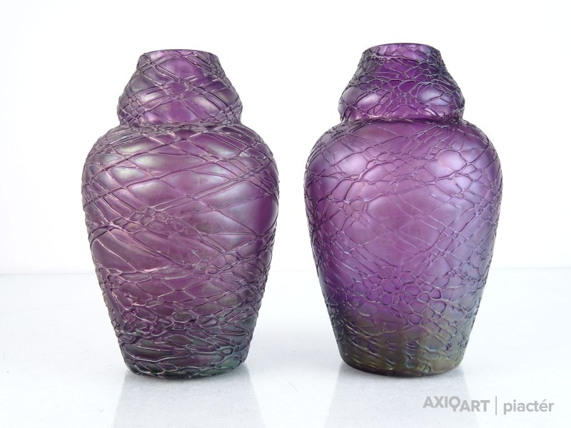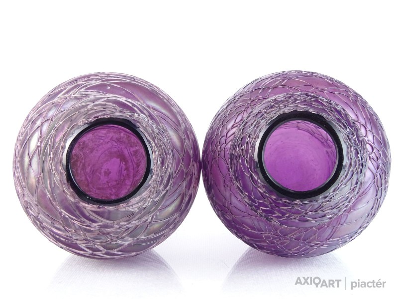 Antik, hibátlan állapotú, szecessziós osztrák üveg váza pár. Lila színű fújt üveg irizáló felületű, feltehetőleg Pallme-König váza, díszváza pár.