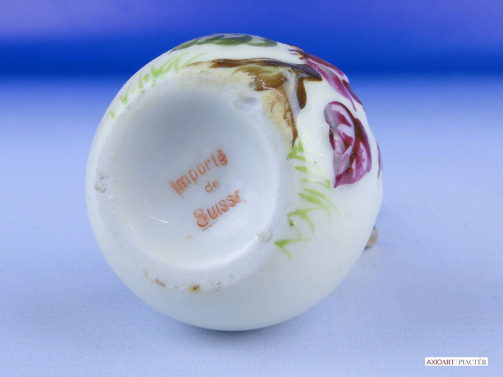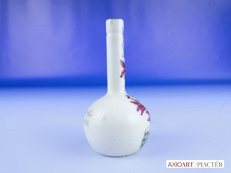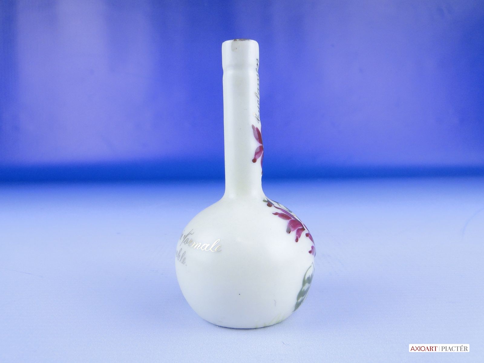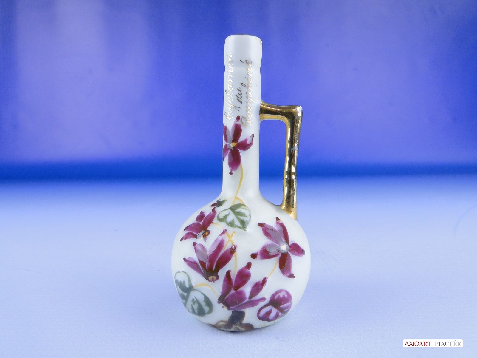 [0E621/UZ-K] Antik, hibátlan állapotú, jelzett, svájci porcelán váza, díszváza, ibolyaváza. Rajta kézi festésű virág, ciklámen díszítés. Oldalán, két helyen arannyal felirat: CYCLAMEN DU DAUPHINÉ PHARMACIE FORMALE GRENOBLE Alján jelzés, pirossal: IMPORTÉ DE SIUSSE Magasság: 9.2 cm Szélesség: 4.7 cm Súly: 0.055 kg